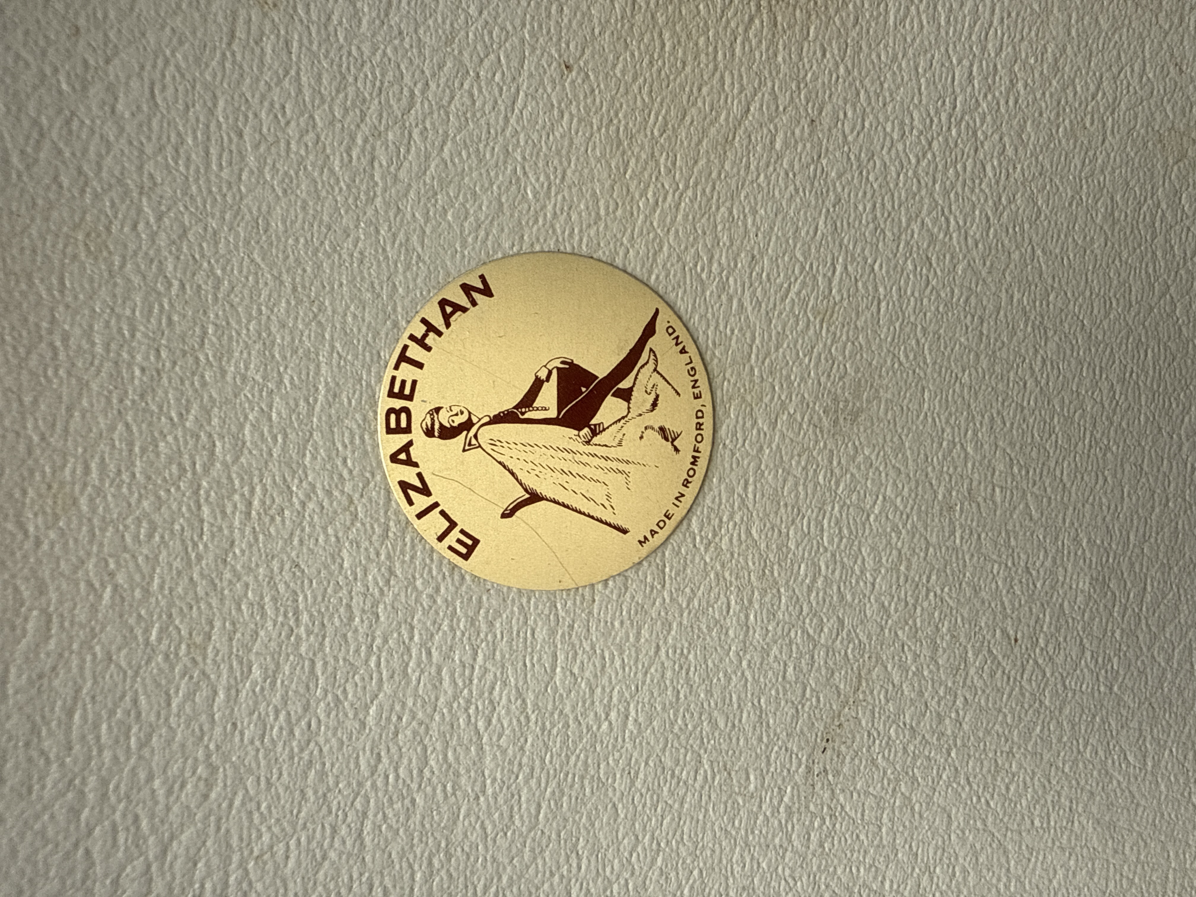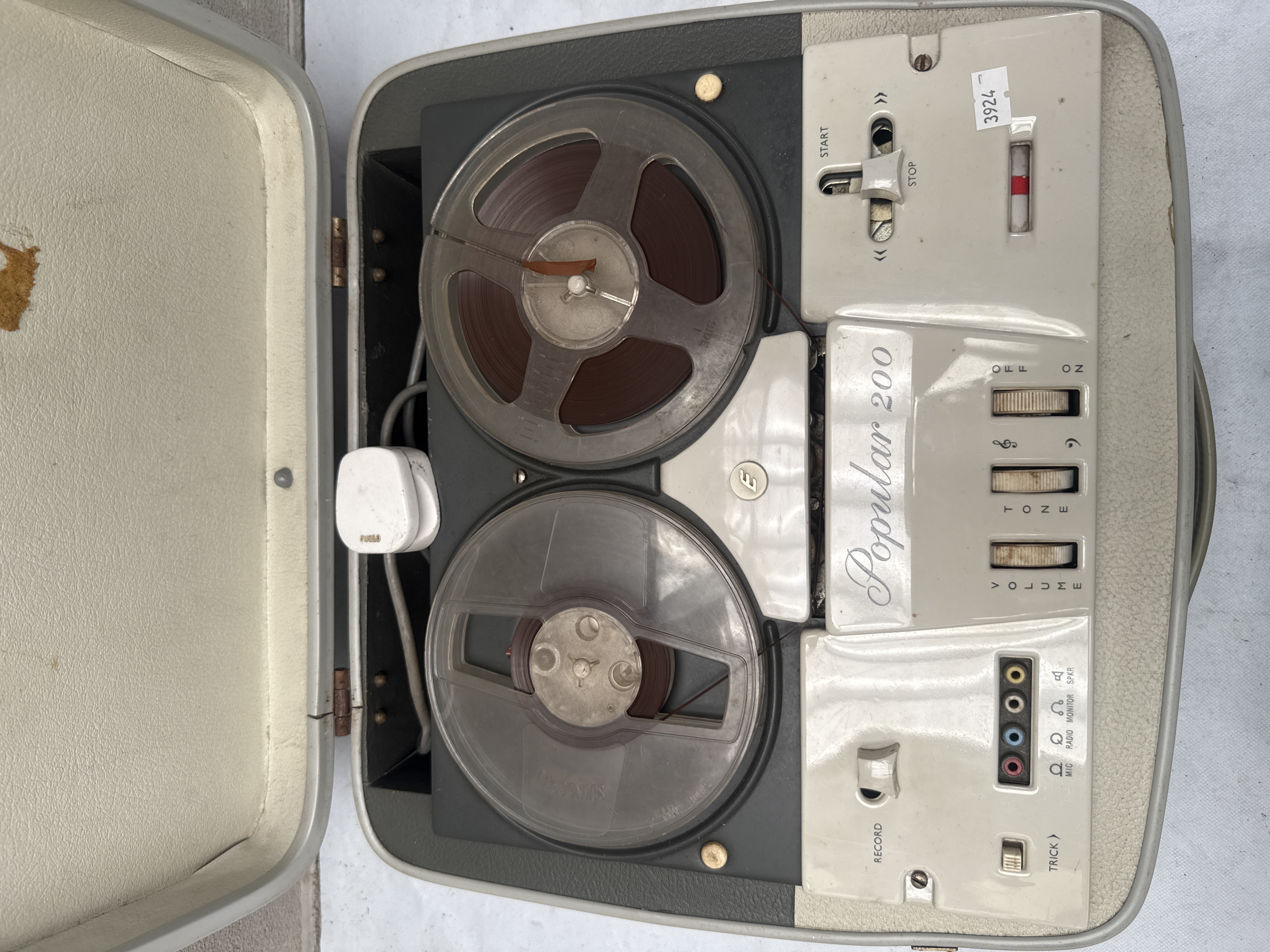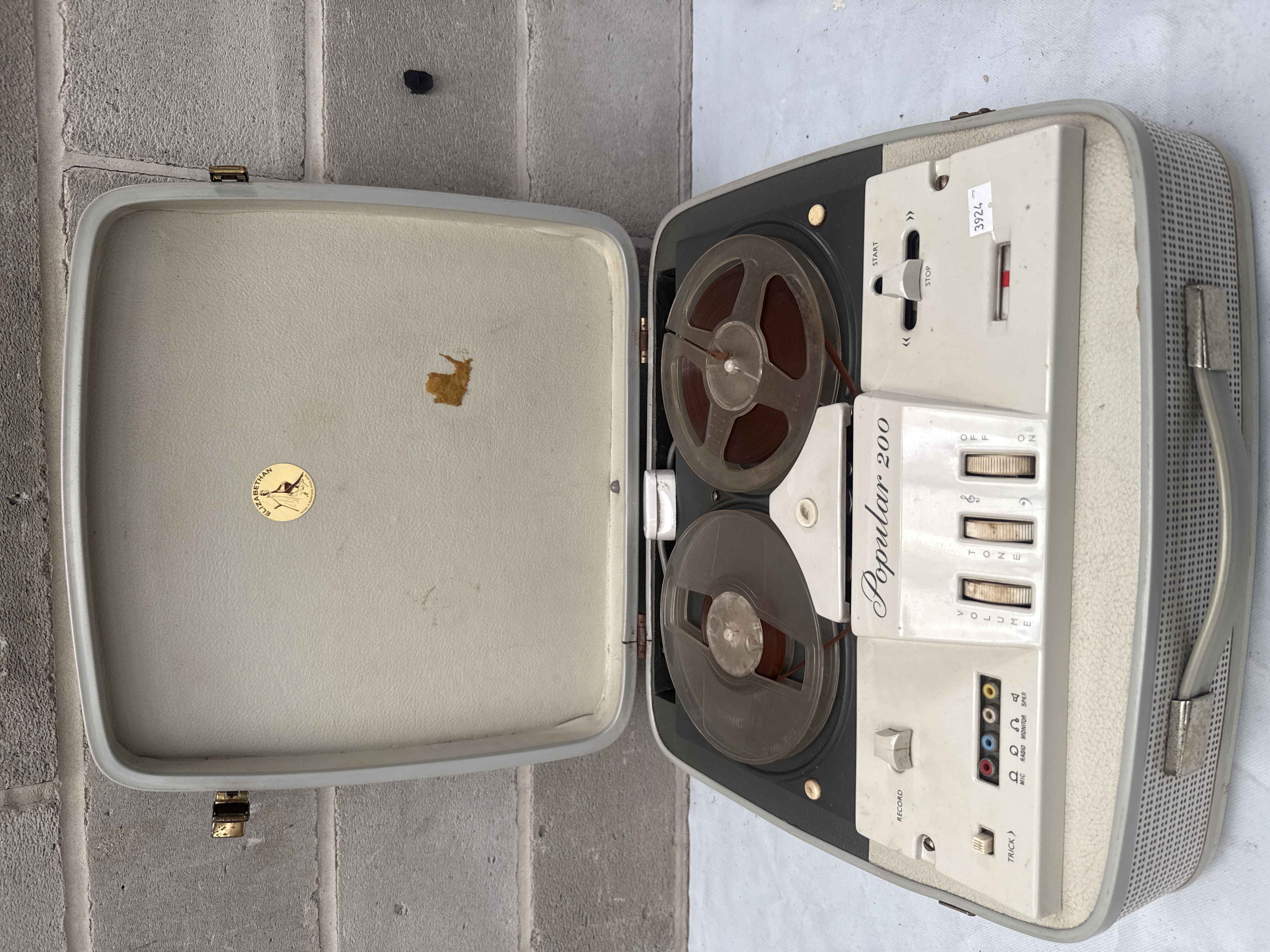 An Elizabethan Popular 200 reel-to-reel tape recorder, dating from the mid-20th century. This portable unit is housed in a grey textured vinyl or leatherette suitcase-style case with a beige and grey plastic control panel. It features two clear plastic reels loaded with magnetic tape. Visible controls include “RECORD,” “START,” “STOP,” “VOLUME,” “TONE,” “ON/OFF,” “TRACK,” and input/output jacks labeled “MIC,” “RADIO,” “MONITOR,” and “SPKR.” The inside of the lid bears a circular gold sticker with the brand name “ELIZABETHAN” and the manufacturing origin “MADE IN ROMFORD, ENGLAND.” A coiled power cord with a white plug is included.