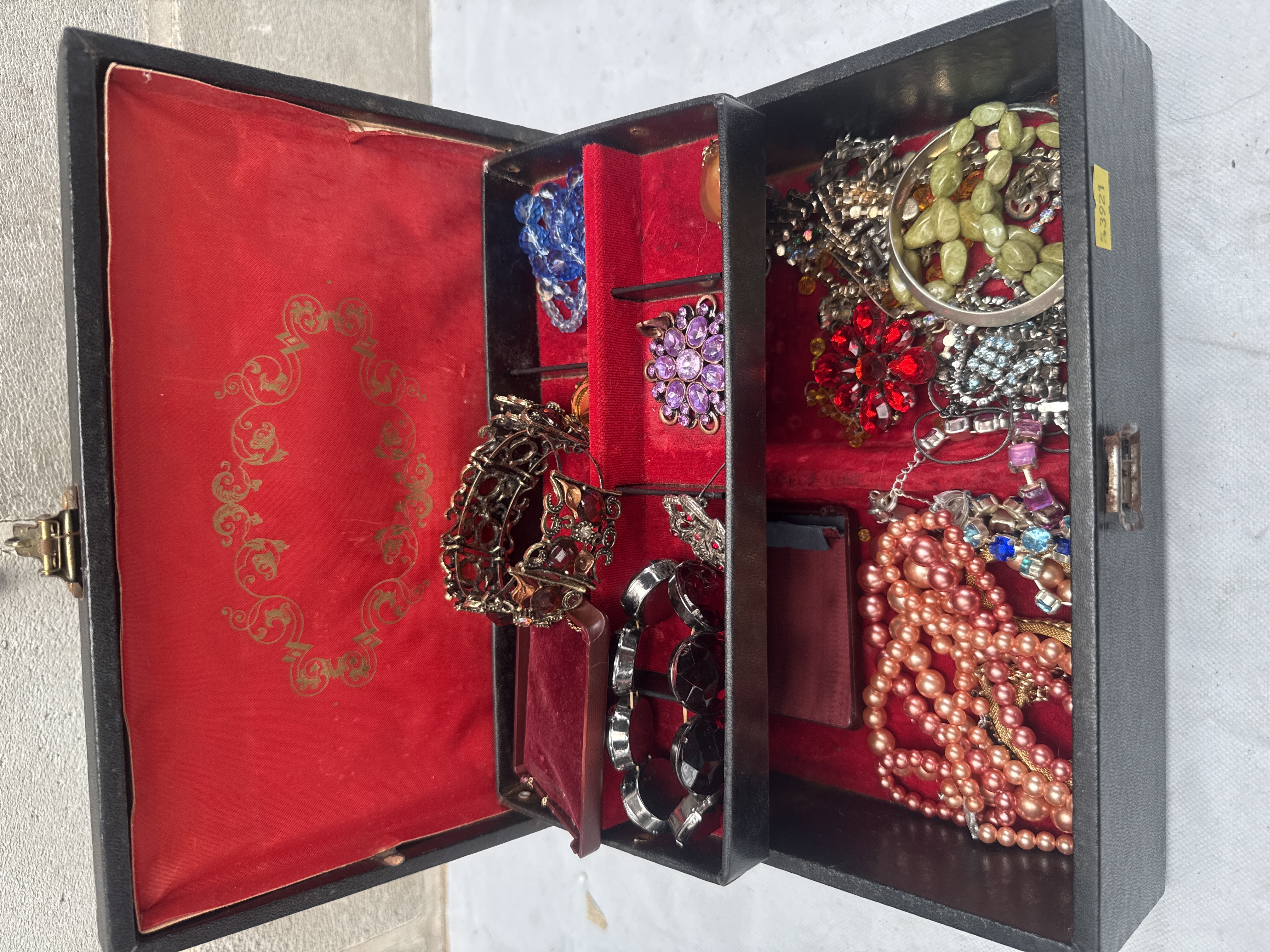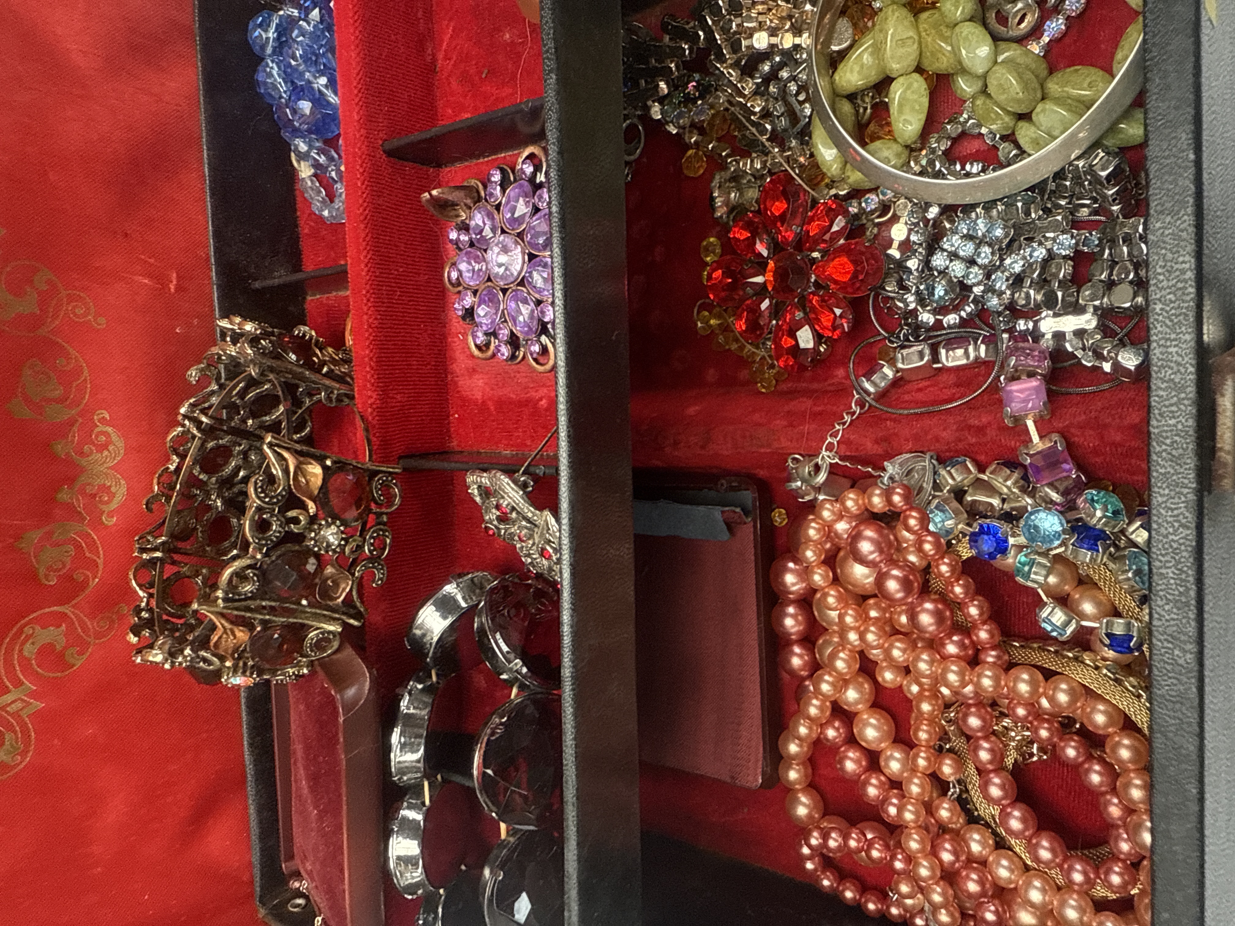 A vintage Mele two-tiered jewelry box, likely dating from the mid-20th century or later. The rectangular box features a black textured exterior, possibly faux leather or embossed paper, with brass-toned hinges and a front clasp. The interior is lined with red velvet-like material, and the lid is adorned with a gilded rococo-style decorative border. The box contains a diverse collection of costume jewelry, including multi-strand faux peach pearl necklaces, blue and green beaded necklaces, a substantial dark-toned metal bracelet, several bangles, and various brooches and pins set with faceted red, purple, and blue stones or rhinestones. Visible markings include yellow stickers with “3921” on the top and front, and a white oval sticker with “24035” on the side.