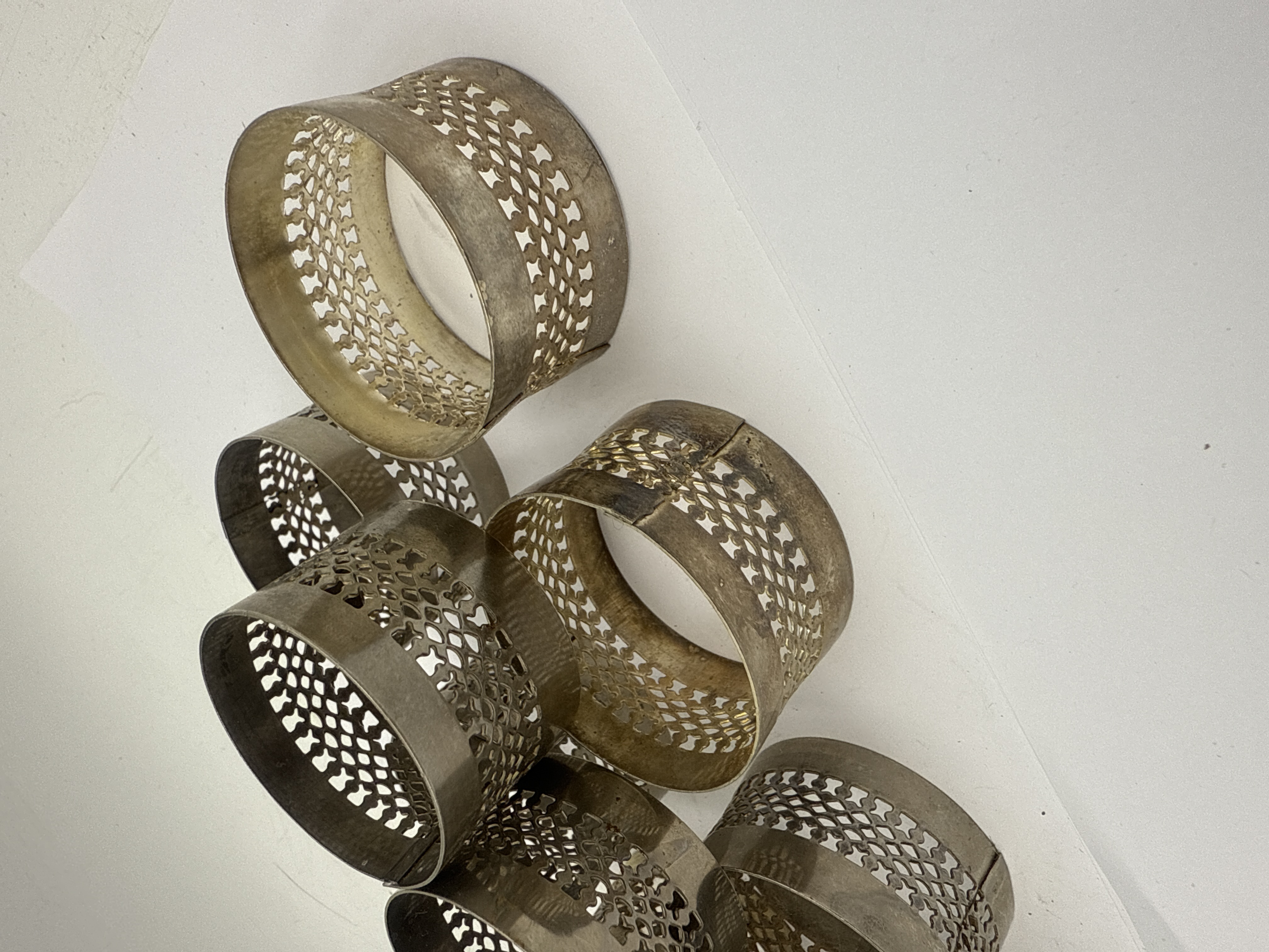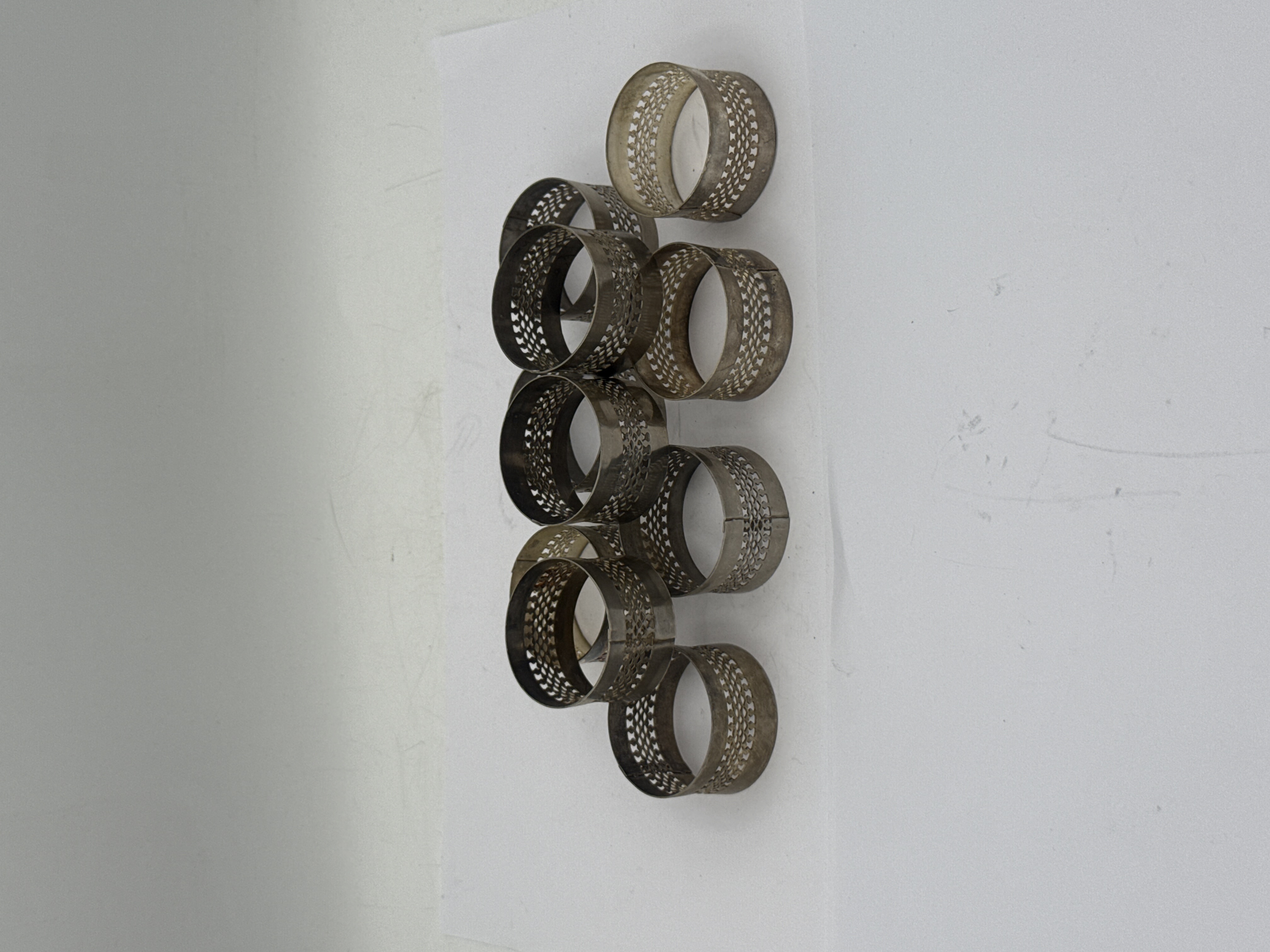 A set of ten cylindrical, openwork objects, likely napkin rings, crafted from a silvery-toned base metal in a Brutalist style. Each piece features a consistent, pierced geometric pattern resembling a repeating lattice or quatrefoil motif. The metal exhibits significant tarnishing and a dull patina, suggesting age and exposure. There are no visible manufacturer’s marks, inscriptions, or hallmarks on any of the items.