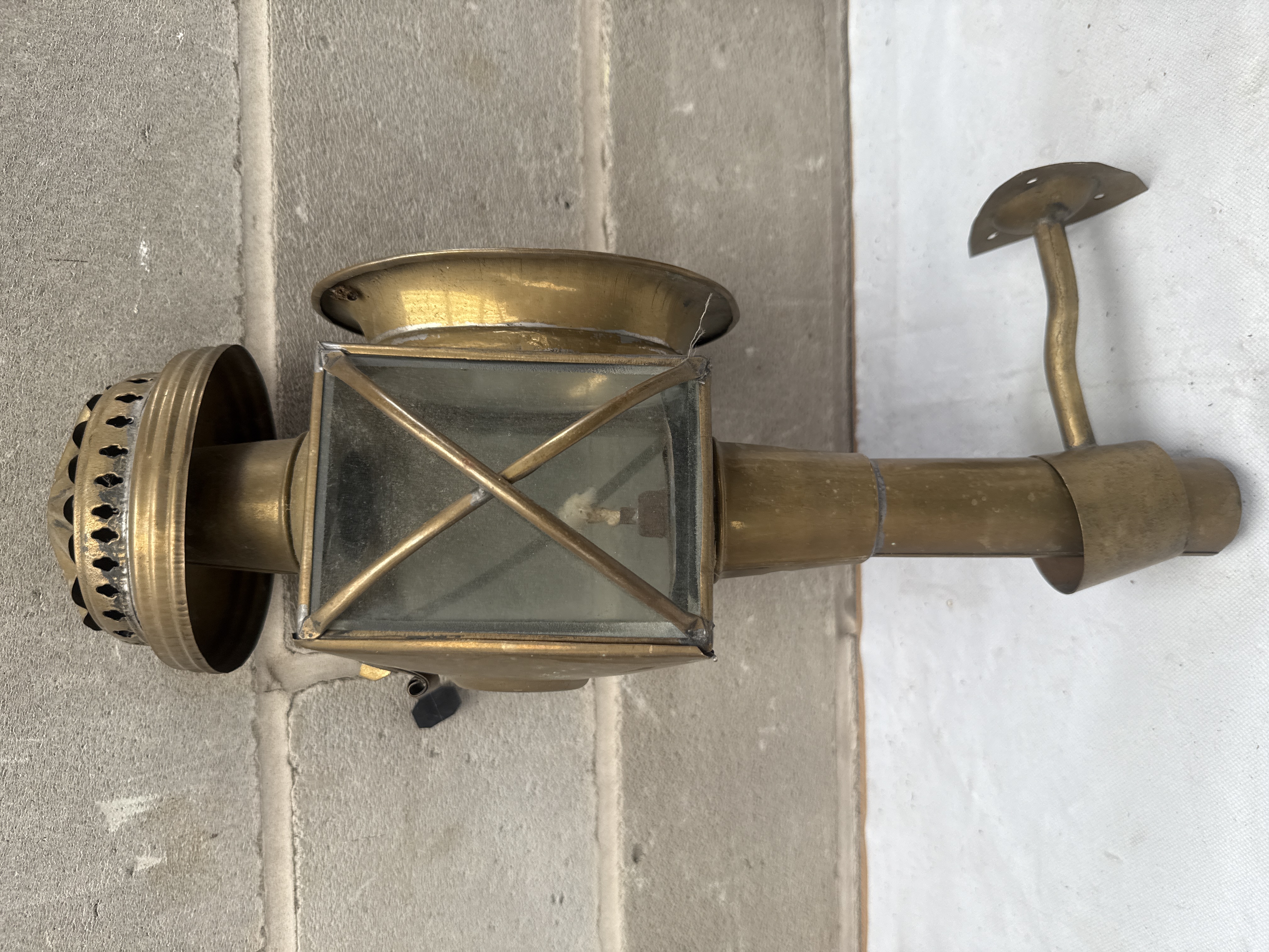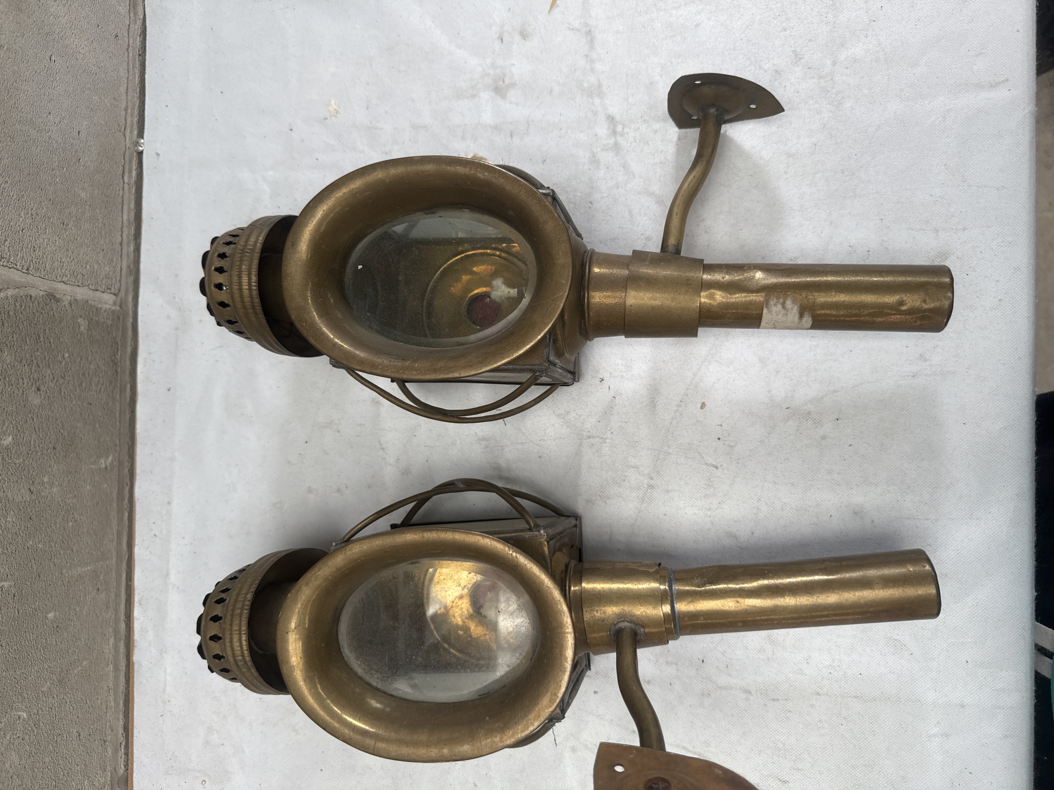A matching pair of antique-style lanterns, predominantly constructed from brass with glass panels. Each lantern features a conical front reflector, a rectangular body with glass panes visible on the front and sides, and a perforated, domed top/chimney for ventilation. An integrated curved mounting arm or bracket extends from the base of each, and one clearly shows a small internal burner mechanism. No discernible text or manufacturer’s markings are visible.