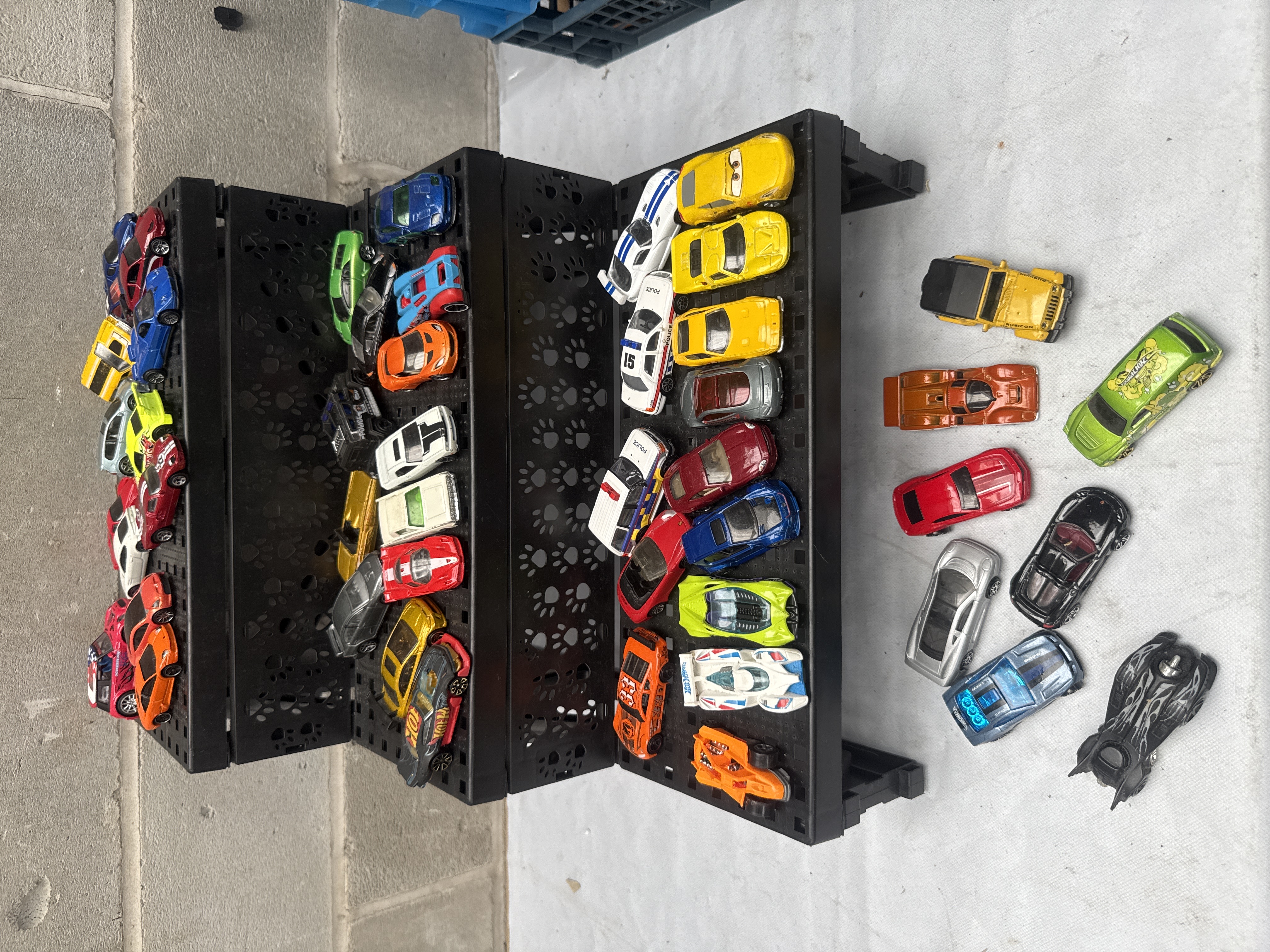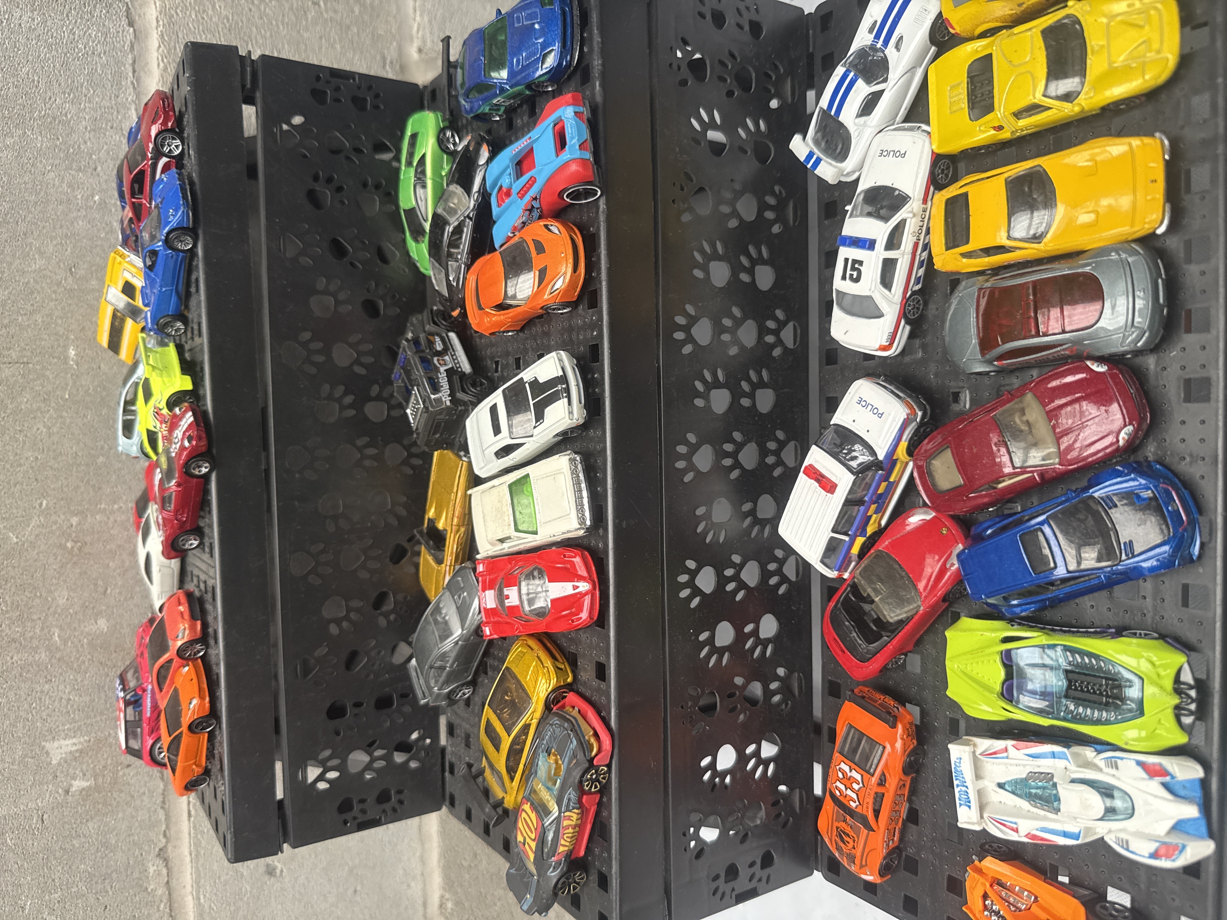 A collection of die-cast toy cars, primarily by Hot Wheels and Matchbox, with other brands also present. This diverse group of small, die-cast vehicles, primarily contemporary or modern in style, is displayed across a three-tiered black plastic stand featuring a repeating paw print cutout pattern, with additional cars scattered on the surface below. Each car is constructed from die-cast metal with plastic components for details such as windows, wheels, and interiors. Visible text and markings include “POLICE” on several white cars (some with “595”), “33” on an orange race car, “HOT” on a red car with flame decals, and “HW” with a flame logo on a yellow-green car. One black car features a distinctive design reminiscent of a modern Batmobile.