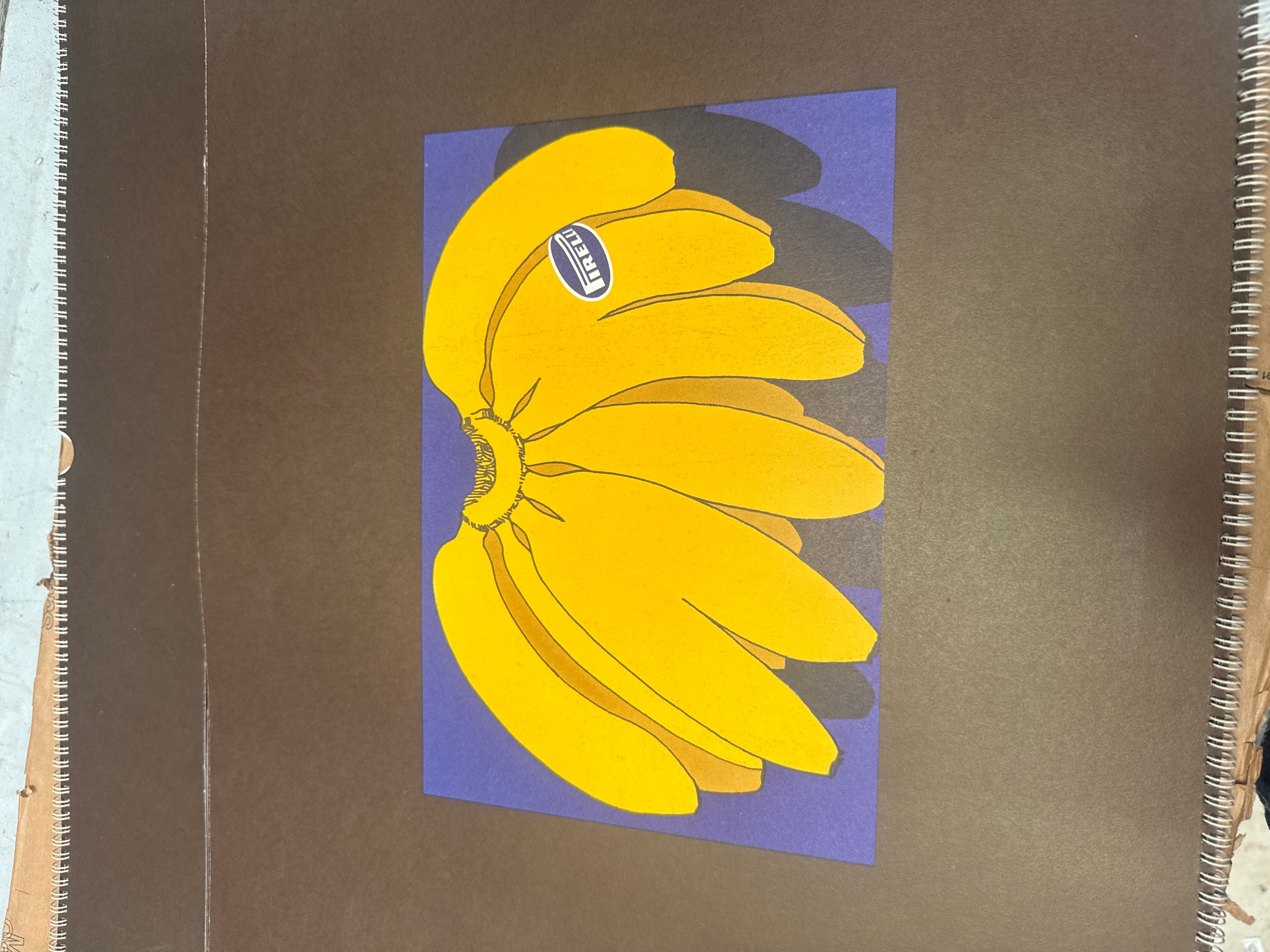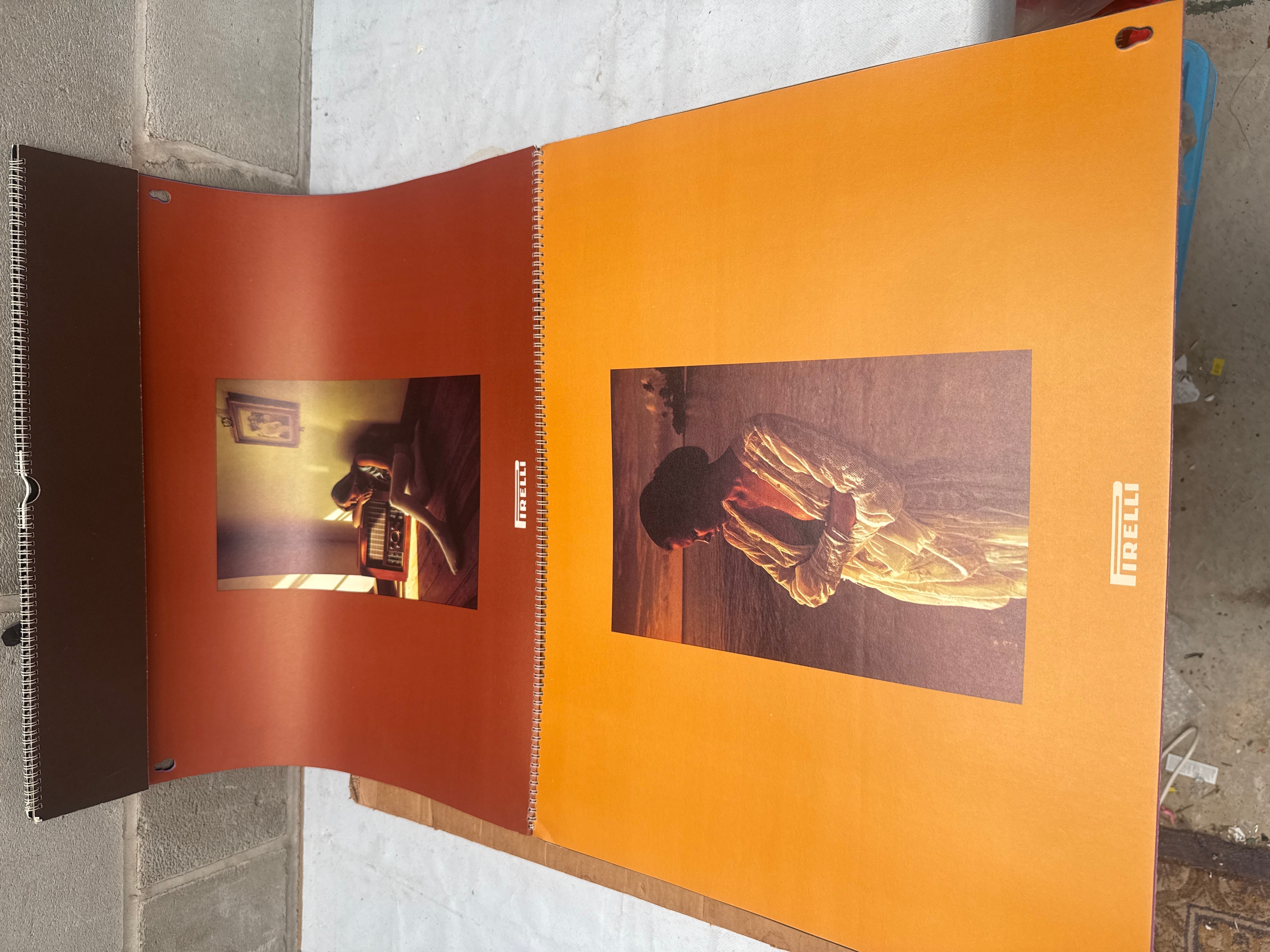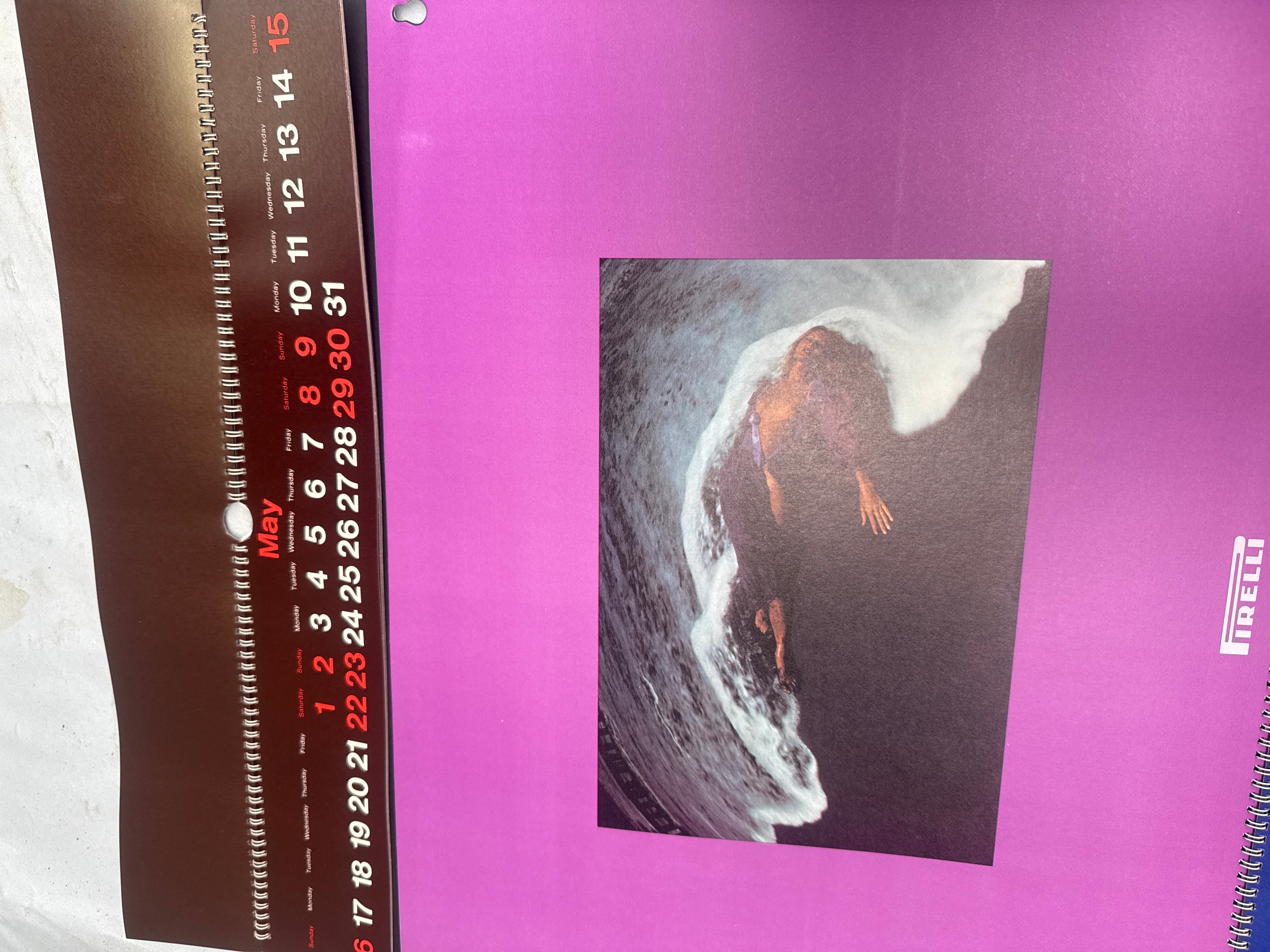 A 1975 Pirelli Calendar, a large-format, spiral-bound wall calendar constructed from printed paper or cardstock pages. It features a metal or plastic coil binding and metal hanging eyelets. The pages display diverse artistic photography and graphic design, including an interior scene with a figure playing an instrument, a finely dressed figure in an outdoor setting, a vibrant illustration of bananas, and a person surfing in a wave. Each page prominently features the ‘PIRELLI’ logo, typically oriented vertically along the right edge, with an additional ‘PIRELLI’ label appearing on the banana illustration. A visible calendar grid for the month of ‘May’ indicates standard English days and dates.
