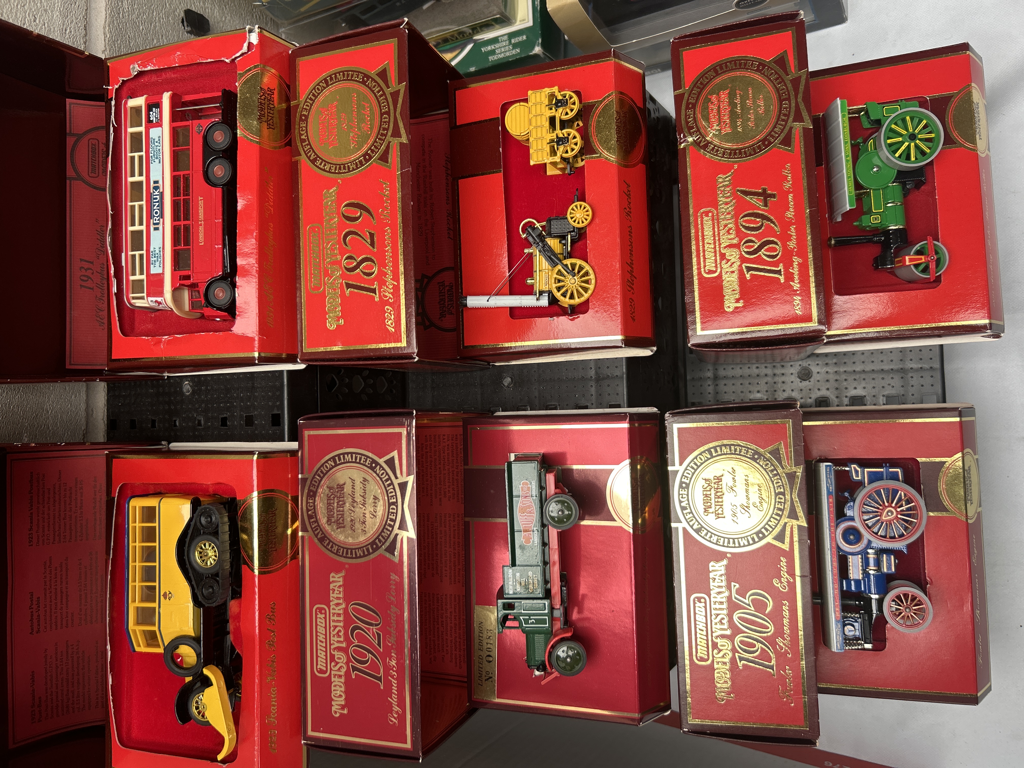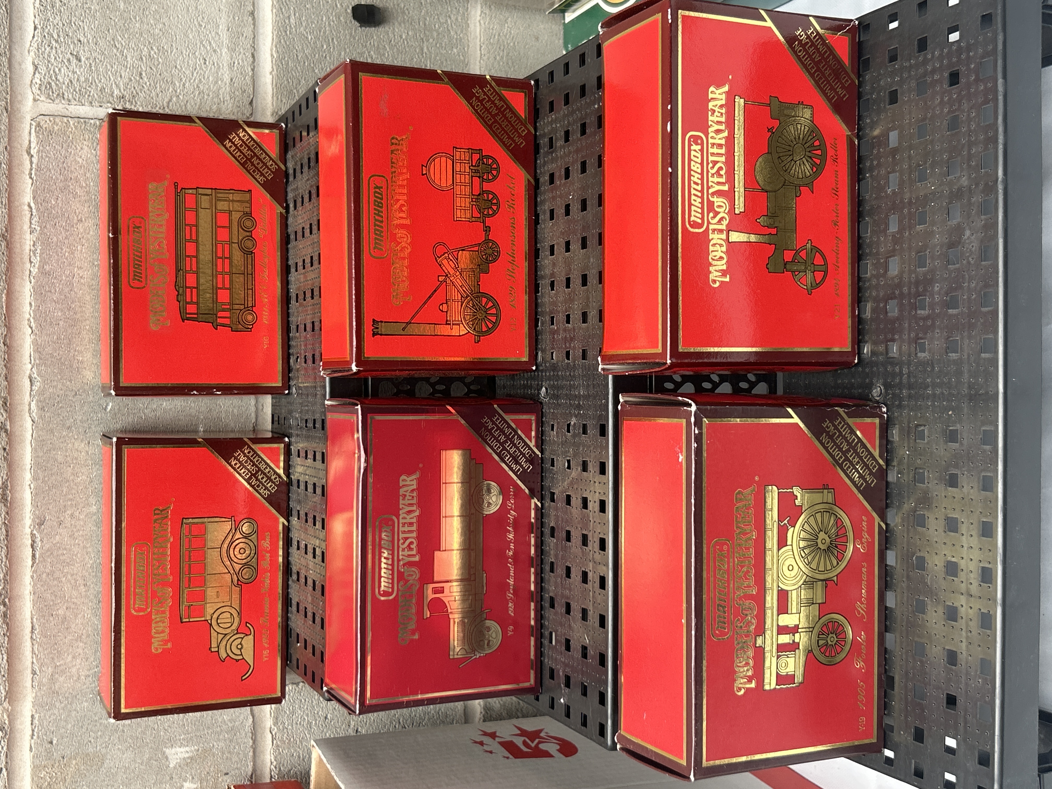 A collection of six Matchbox ‘Models of Yesteryear’ Limited Edition die-cast vehicle replicas, each presented in its original red and gold cardboard packaging. The boxes are prominently marked “MATCHBOX,” “MODELS OF YESTERYEAR,” and “LIMITED EDITION,” displaying illustrations of the specific model contained within. The collection comprises: