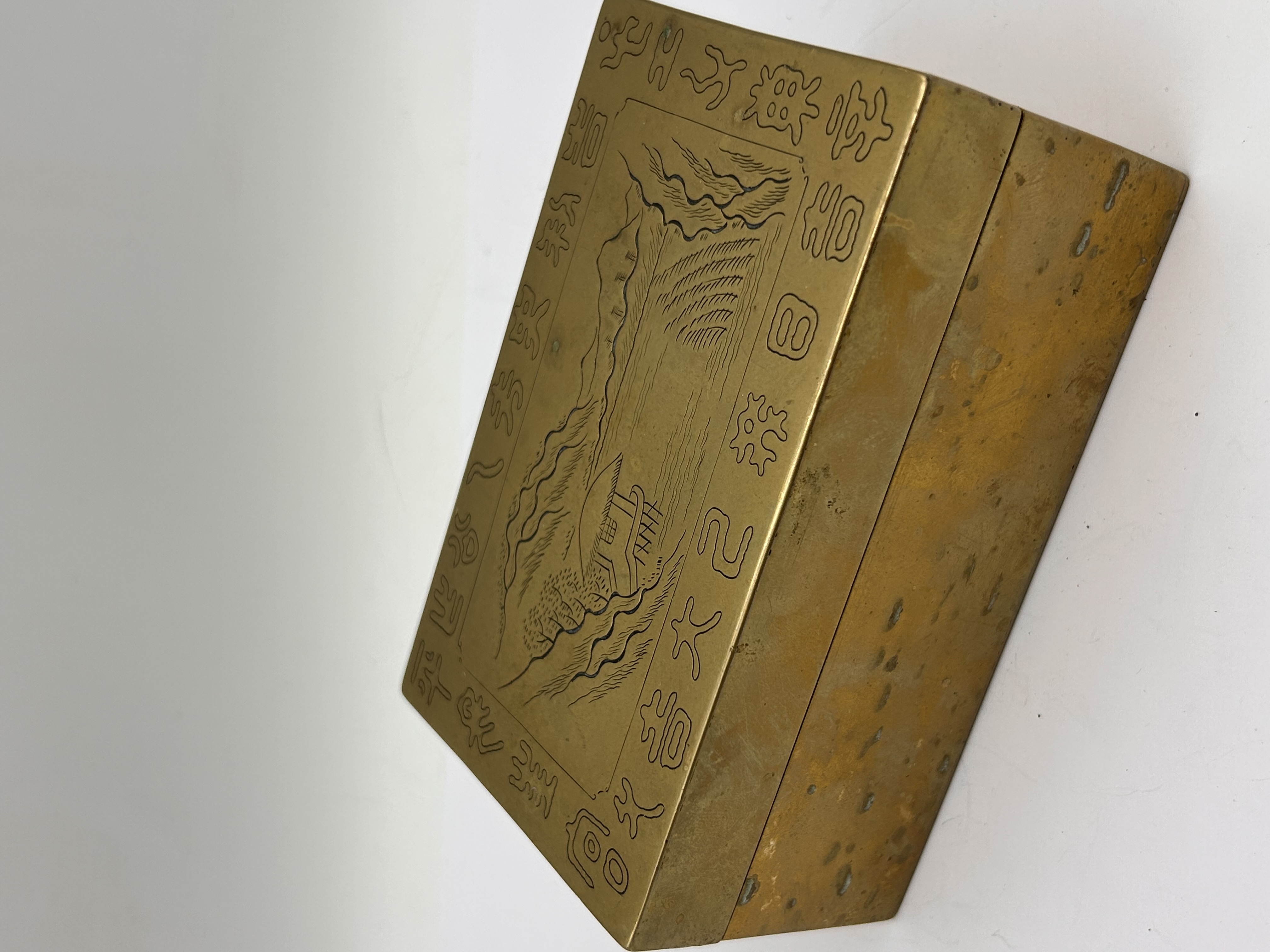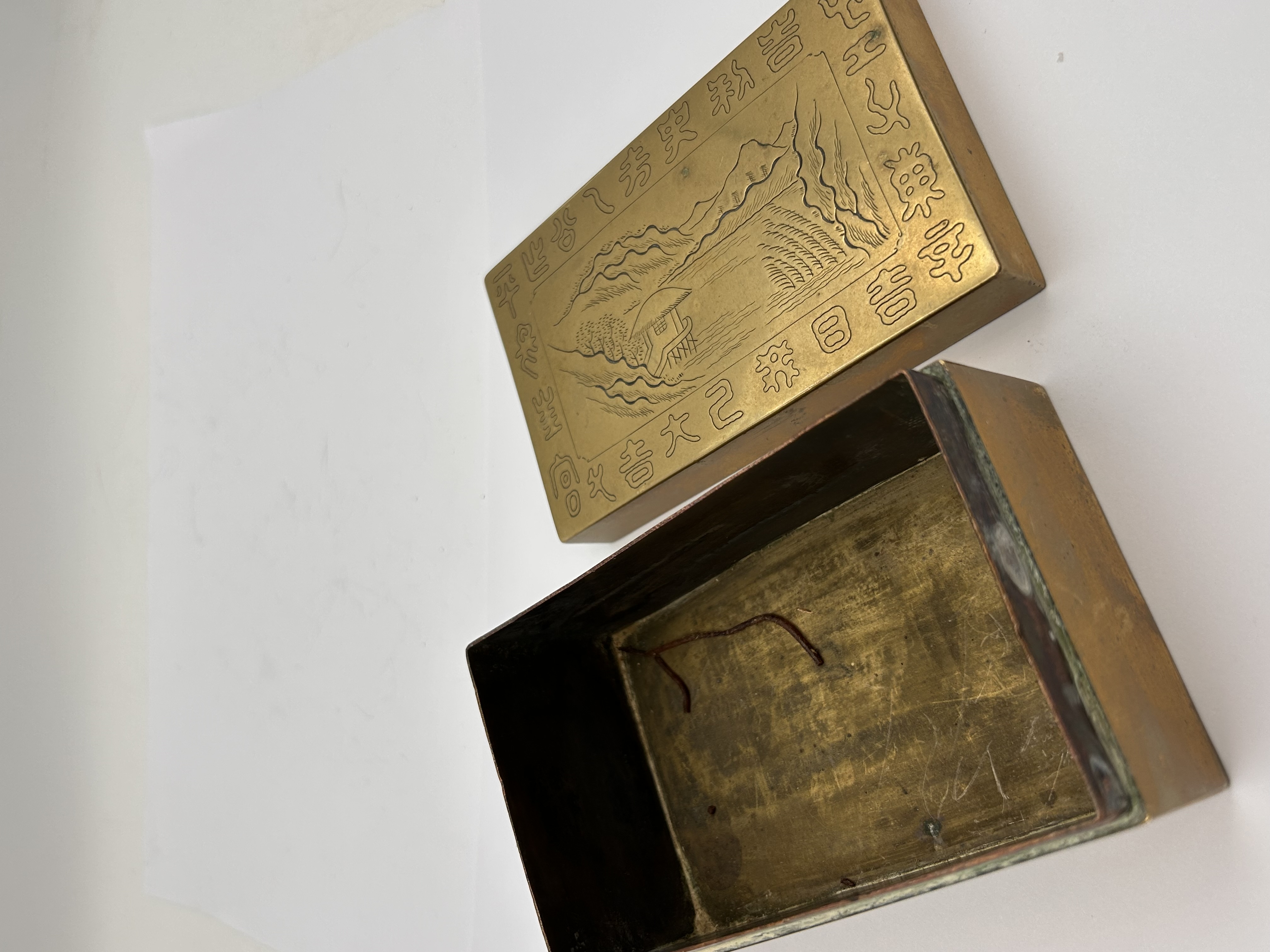 A rectangular lidded box, likely of East Asian origin, crafted from brass. The lid features an engraved landscape scene depicting mountains, a structure, and water, bordered by prominent Chinese calligraphic characters. These characters translate to auspicious phrases including “大吉大利” (Great auspiciousness and great prosperity), “長命富貴” (Long life, wealth, and honor), “向來大吉” (Always very auspicious), and the character “宜” (Suitable/Appropriate). The interior is similarly tarnished, with a small piece of dark string or thread present.