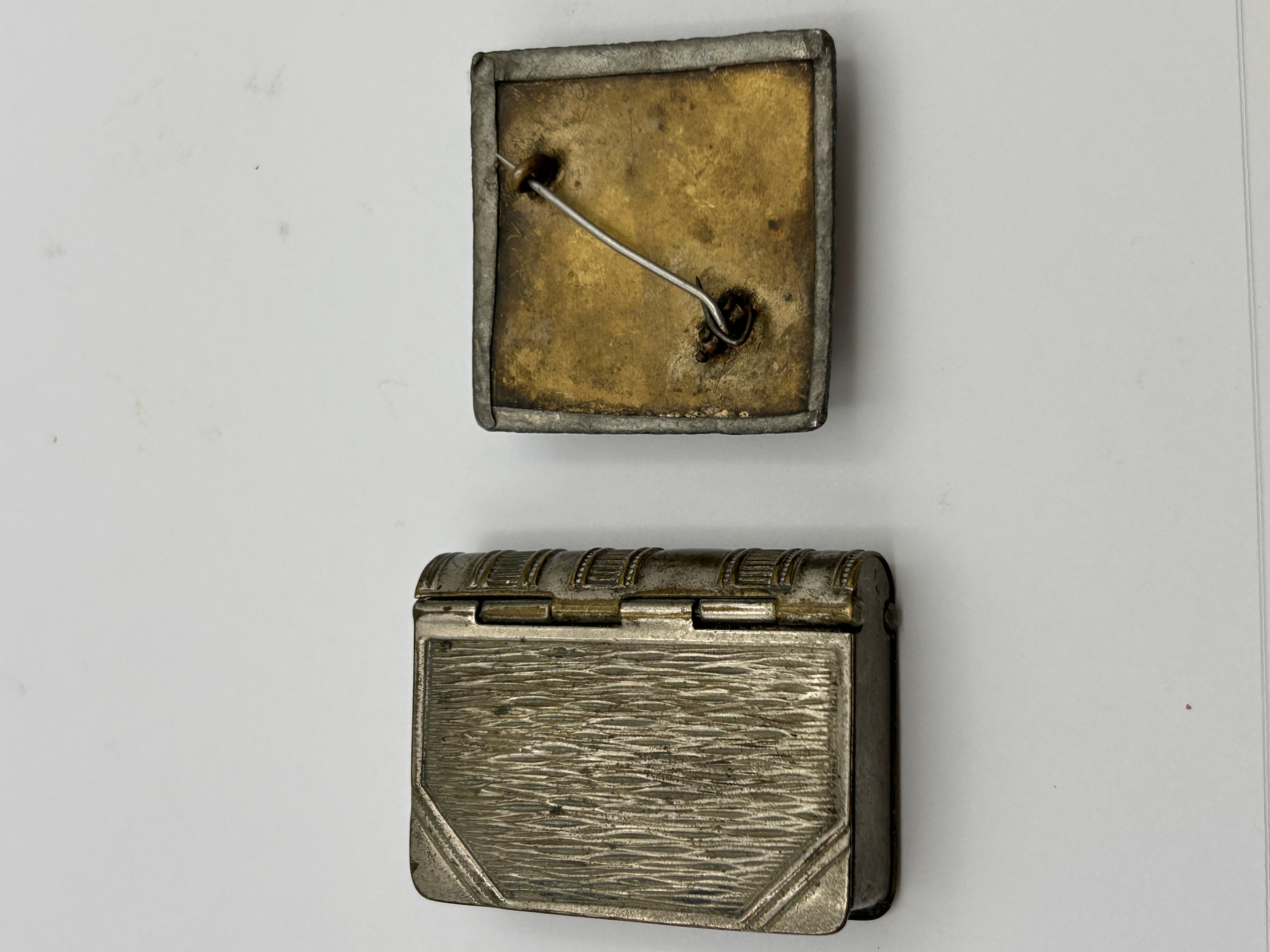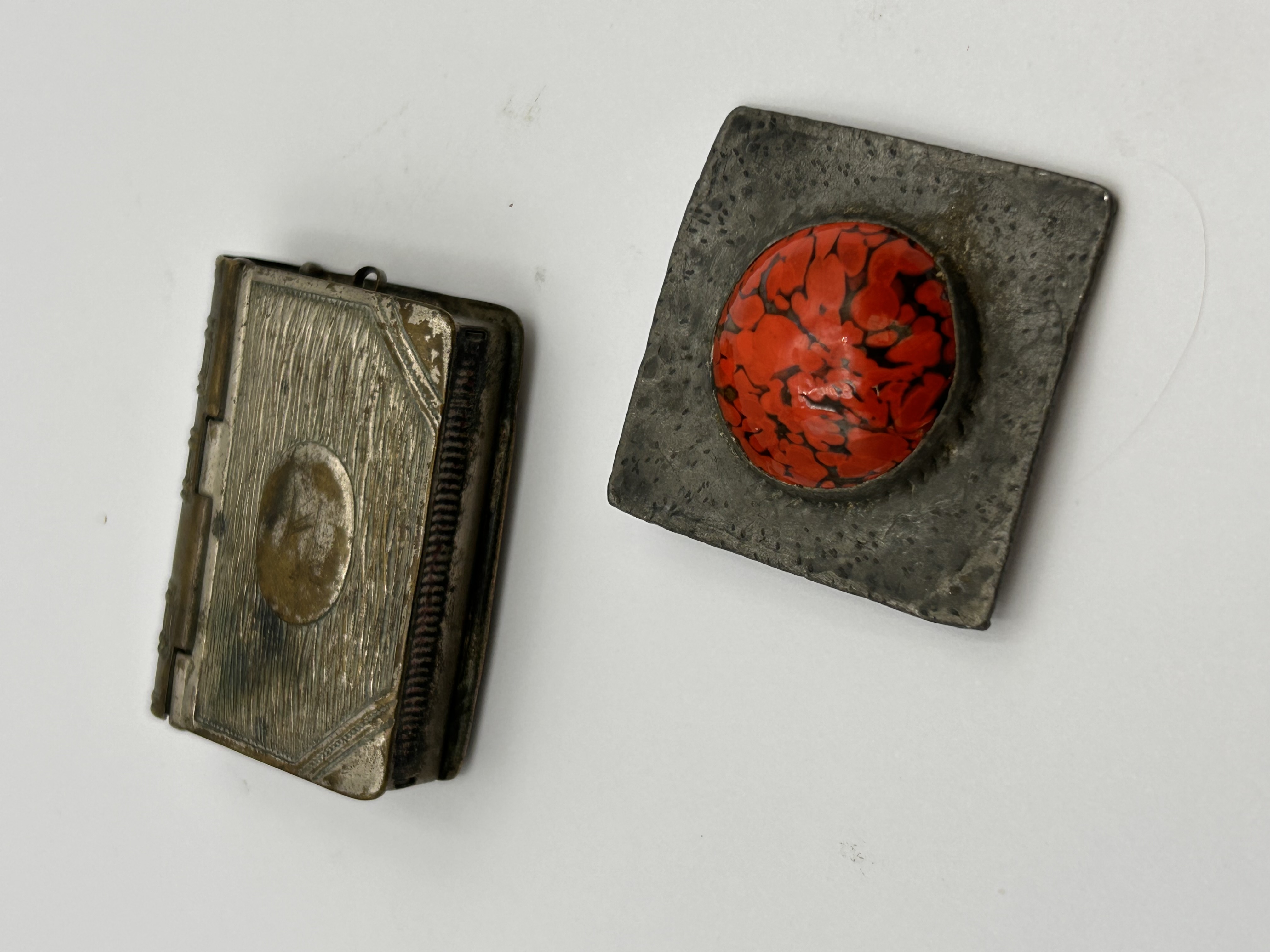 This lot presents two decorative items. The first is a small, rectangular hinged box designed to resemble a miniature book, crafted from a silver-toned base metal with a textured surface and an oval brass-toned escutcheon on its lid, secured by a small clasp. The second item is a square-shaped brooch or badge made from a dark, heavily patinated base metal with a rustic, irregular texture, centered with a prominent domed cabochon of mottled red and black material, possibly stone or glass. Its reverse side is brass-toned and features a basic pin mechanism.