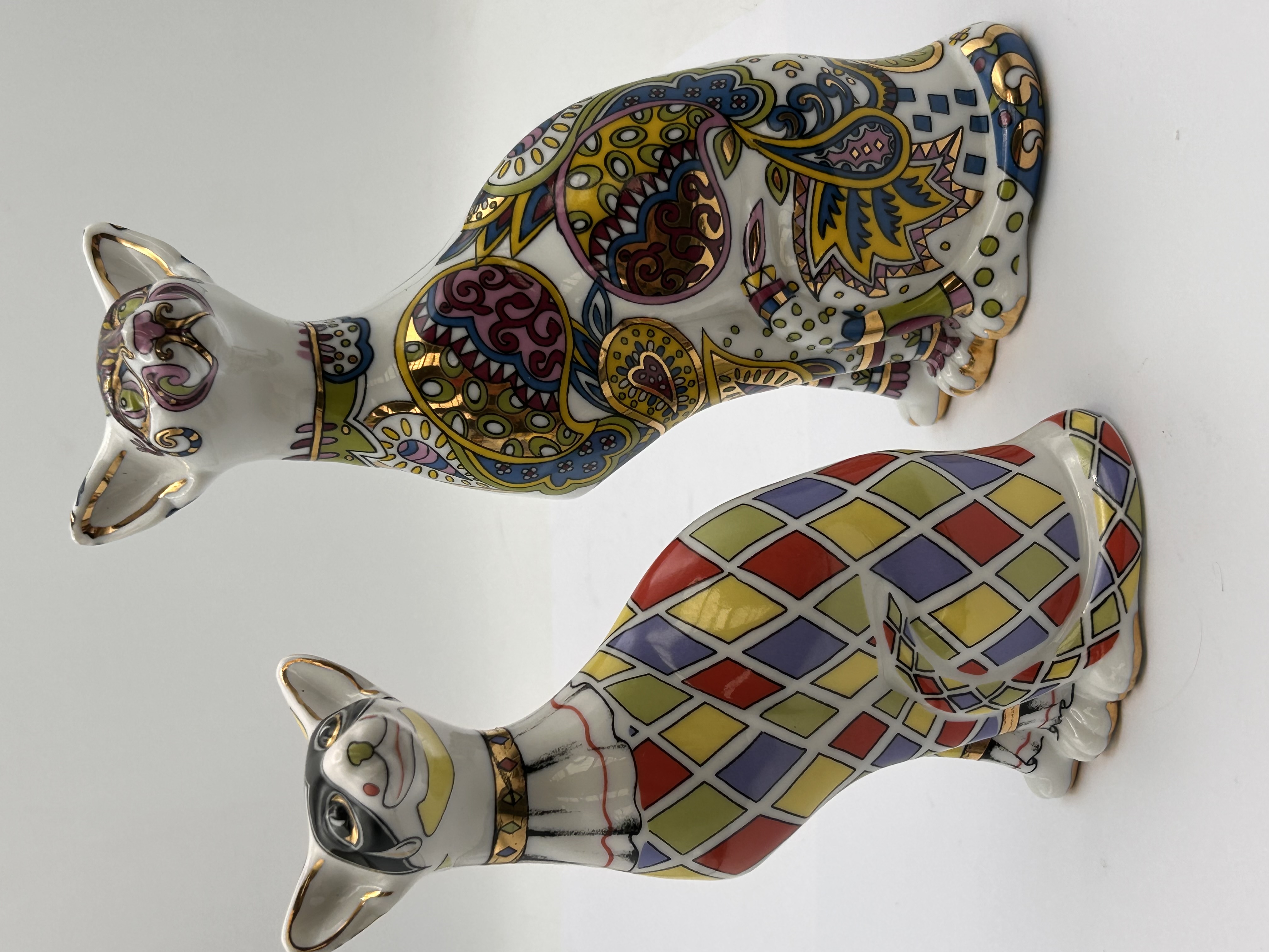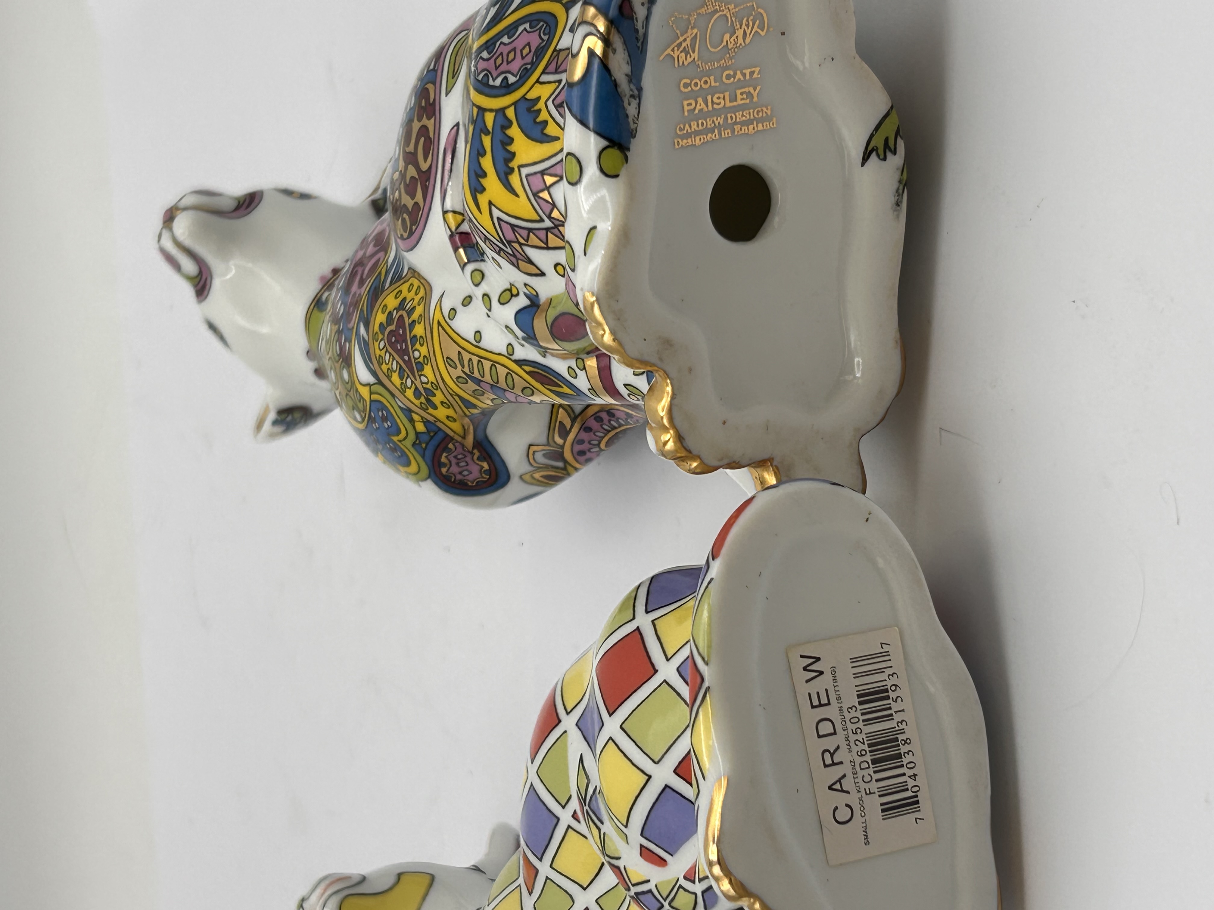A pair of Paul Cardew ‘Cool Catz’ decorative cat figurines, comprising a ‘Harlequin’ pattern example and a ‘Paisley’ pattern example. Each figurine is likely made of glazed ceramic or porcelain, featuring distinct polychrome patterns with gilt accents. The left figurine is adorned with a harlequin-style diamond pattern in various colors, while the right displays an intricate paisley-like motif in multiple hues with gold detailing. Both exhibit stylized forms with upright ears and collars. Visible markings on their bases include a sticker identifying the left as “CARDEW SMALL COCO CAT HARLEQUIN FC062403” with a barcode, and the right as “CRABTREE & EVELYN PAISLEY COCO CAT Designed in England”.