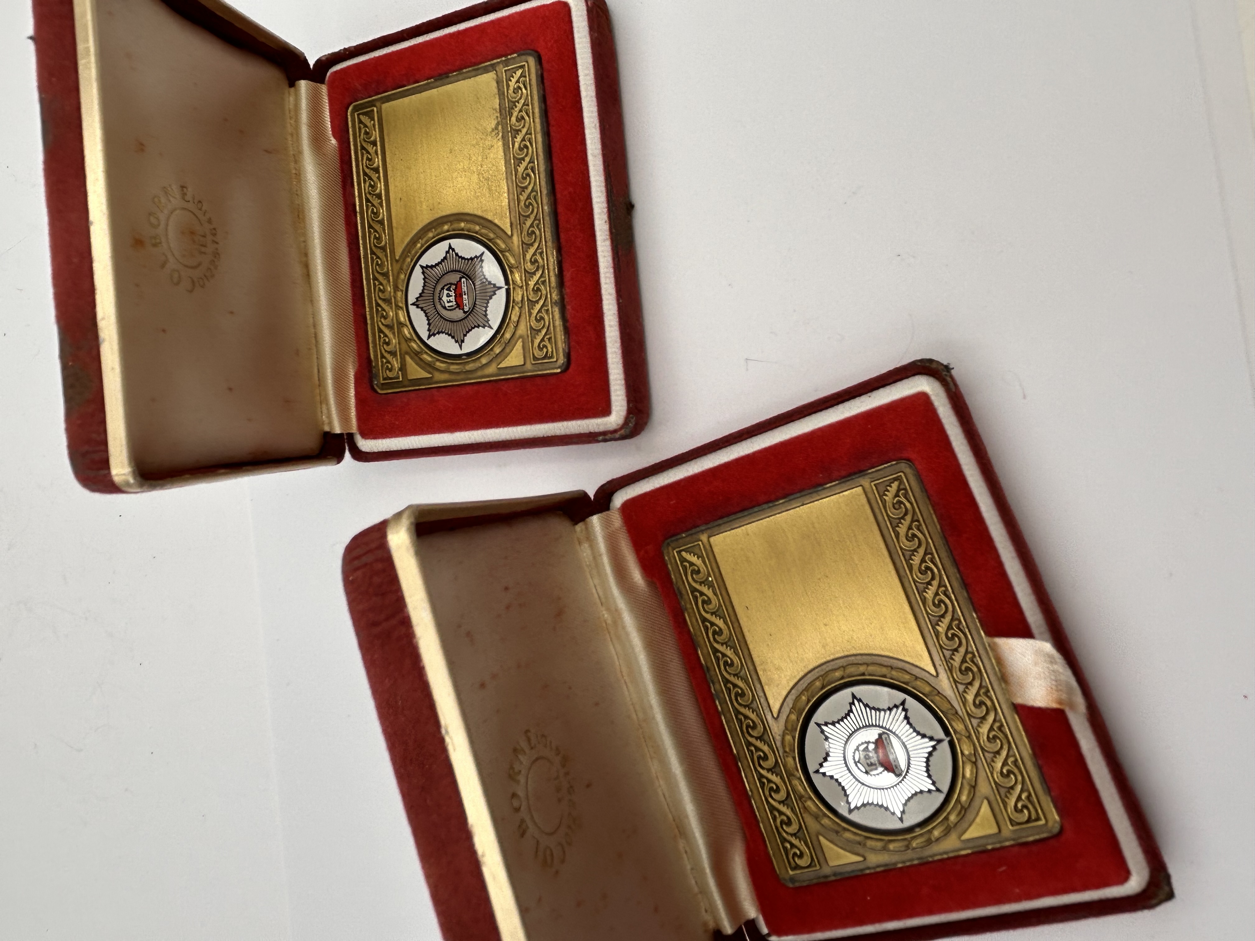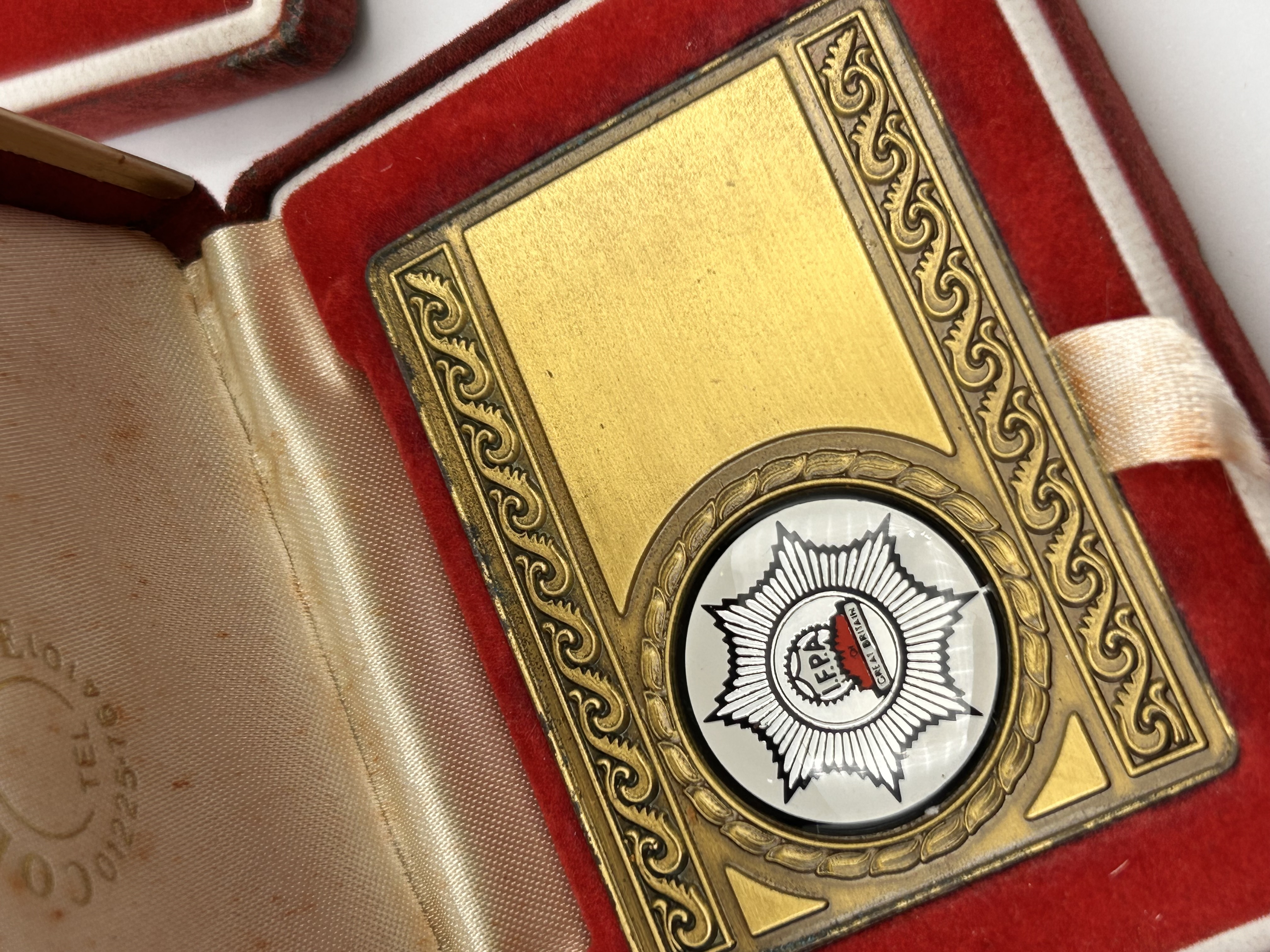 A pair of vintage gold-tone metal presentation plaques, each housed in its original red velvet and cream satin-lined hinged presentation box. Each plaque features a central domed emblem with a white background, a red banner, and text reading “I.F.P.A. GREAT BRITAIN”, surrounded by a decorative border and extensive scrollwork engraving on the main rectangular body. The interior lid of the boxes bears the impressed mark “OLBORNE WILTSHIRE TEL 01225-7901”, indicating a likely mid-to-late 20th-century origin.
