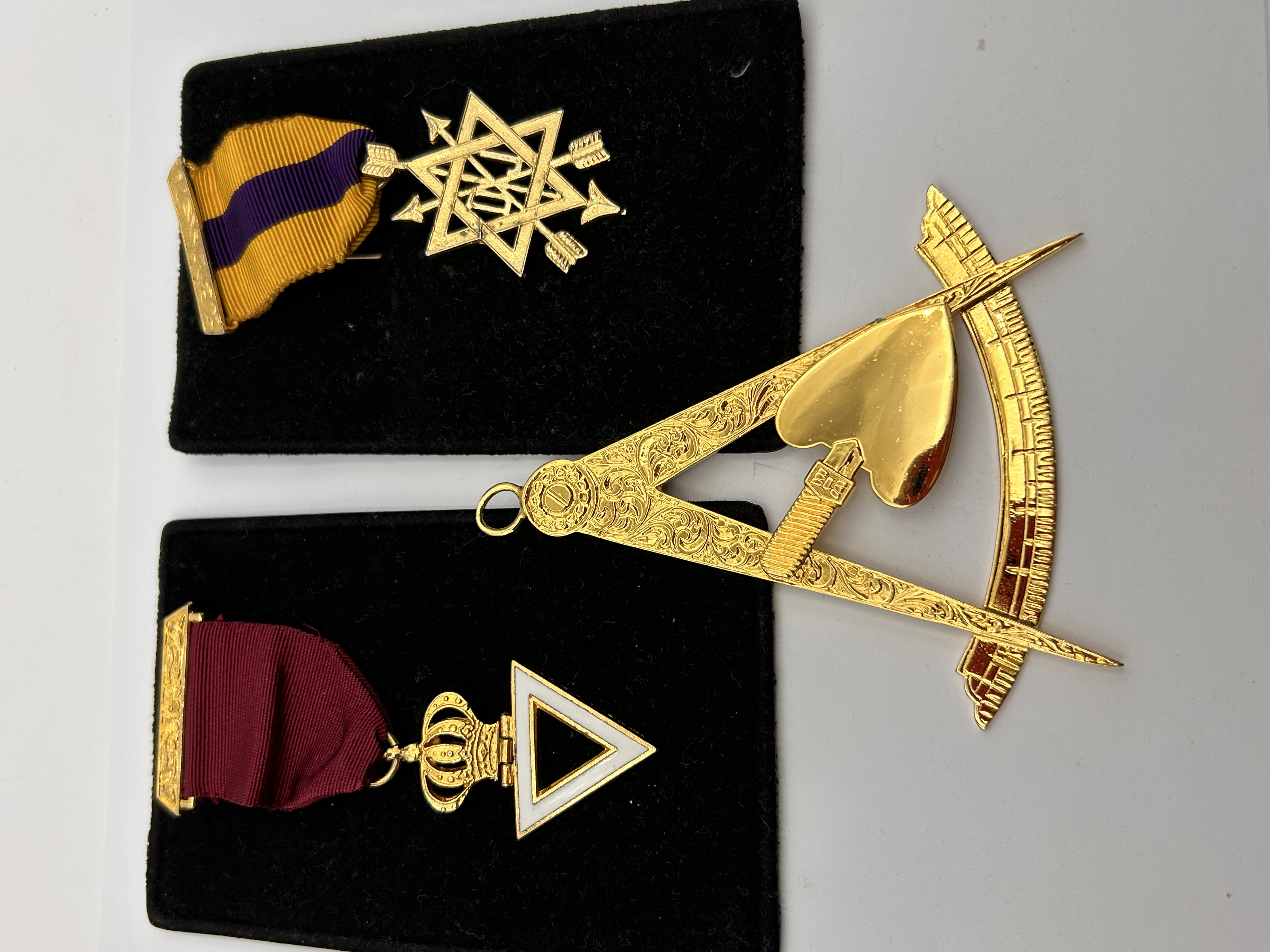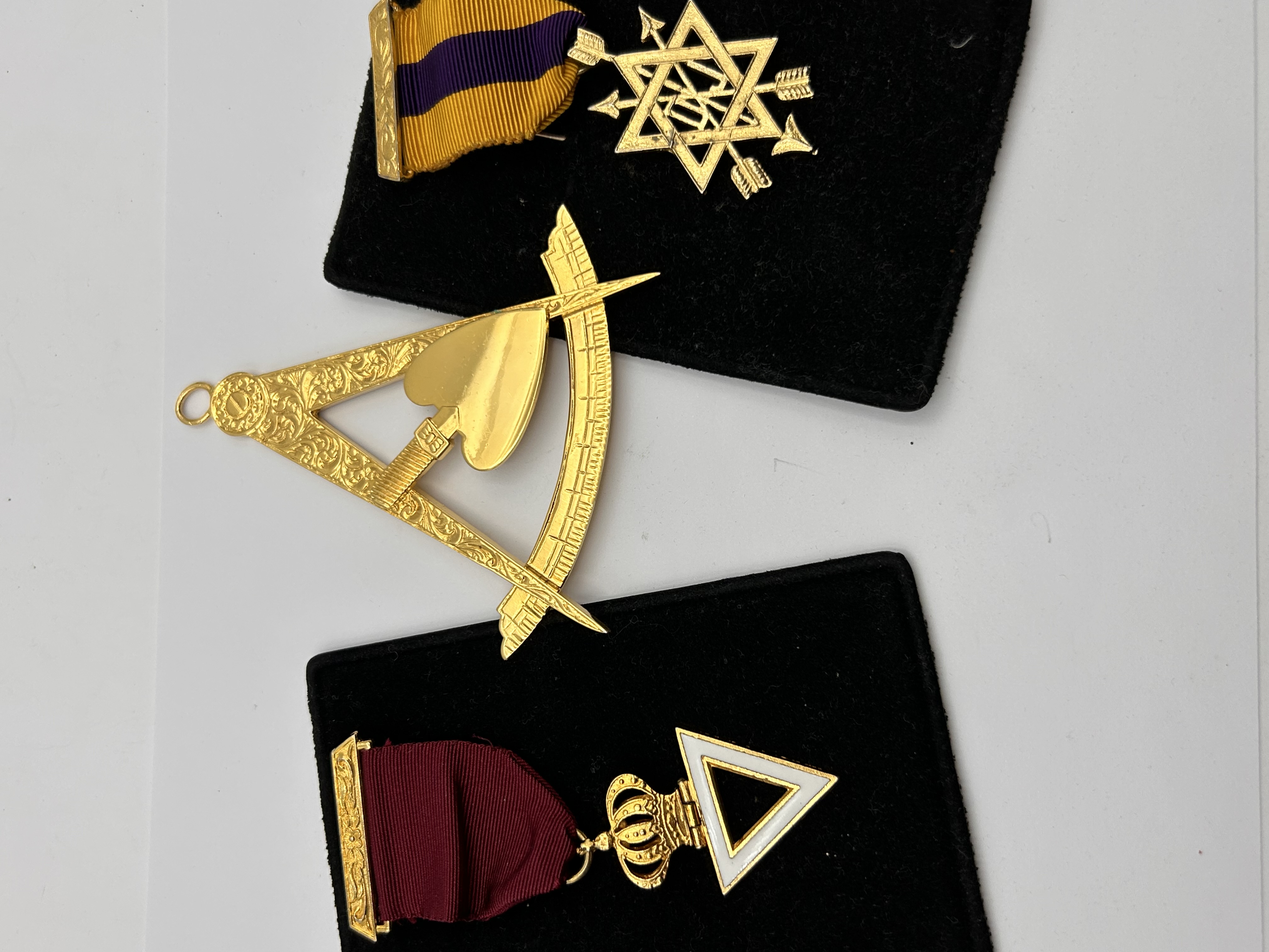 A set of three fraternal regalia jewels, likely from a Masonic or associated order, appearing to be of modern or contemporary manufacture. The group comprises a large, polished yellow metal pendant depicting a compass and square, ornately decorated with scrollwork and featuring an axe head at its center, with one arm of the square incorporating a protractor scale. To the left, a medal with a deep red fabric ribbon suspends a gilded crown surmounting an inverted triangular pendant with a white enameled field and gold trim. To the right, another medal with a striped yellow and purple fabric ribbon suspends a gilded six-pointed star pendant with stylized arrows and an intertwined central monogram, which visually suggests an acronym such as “OES”.
