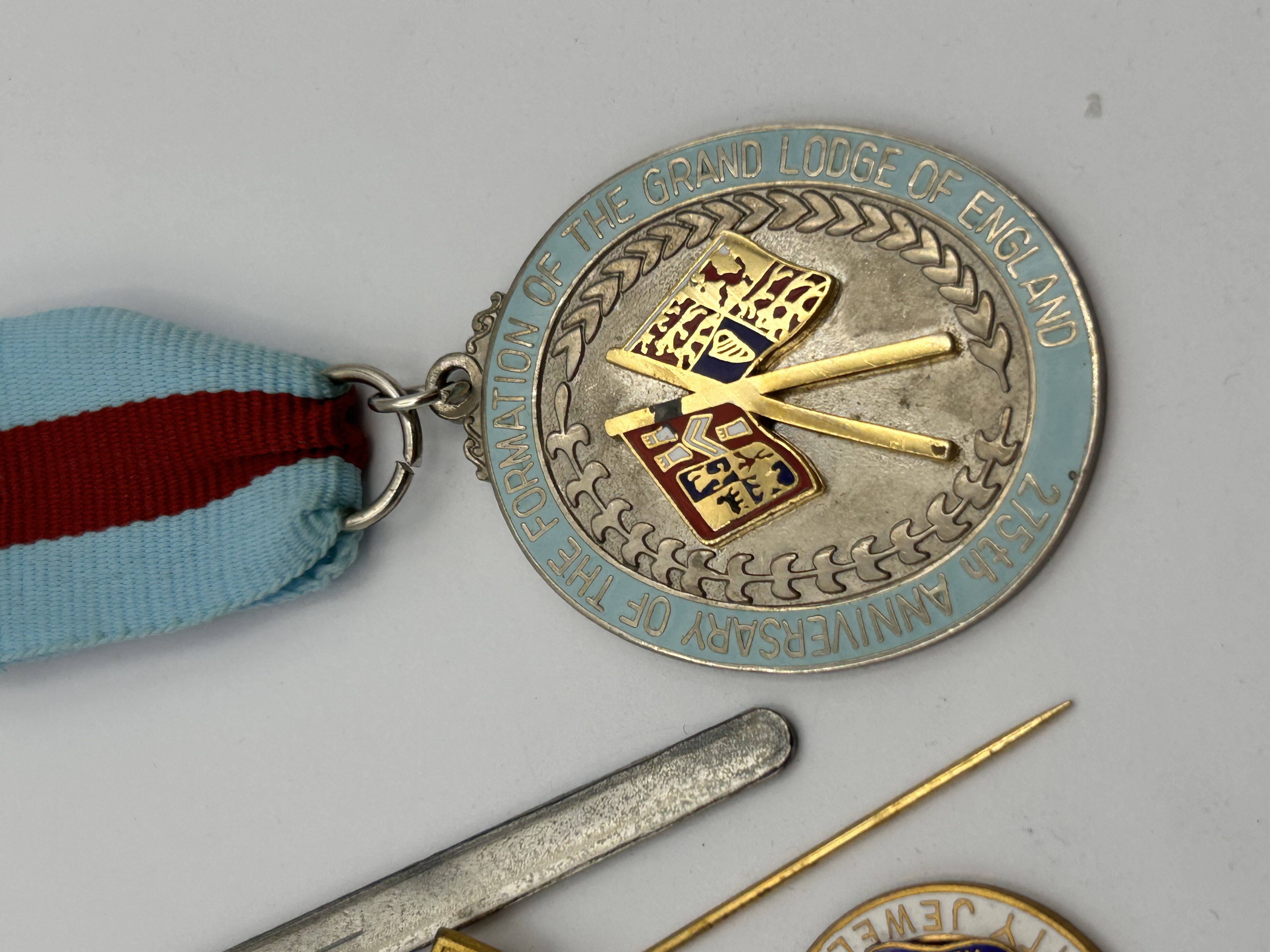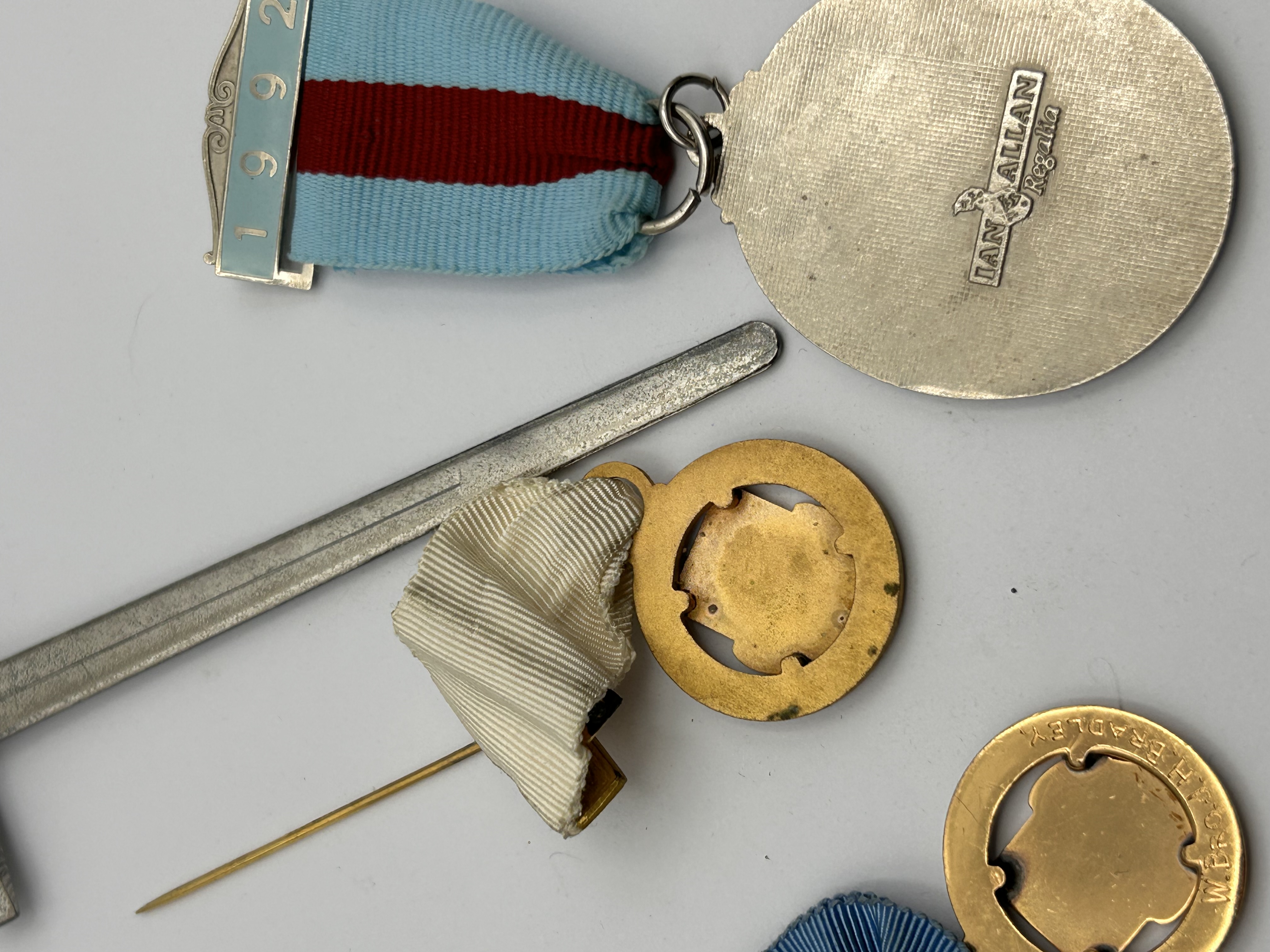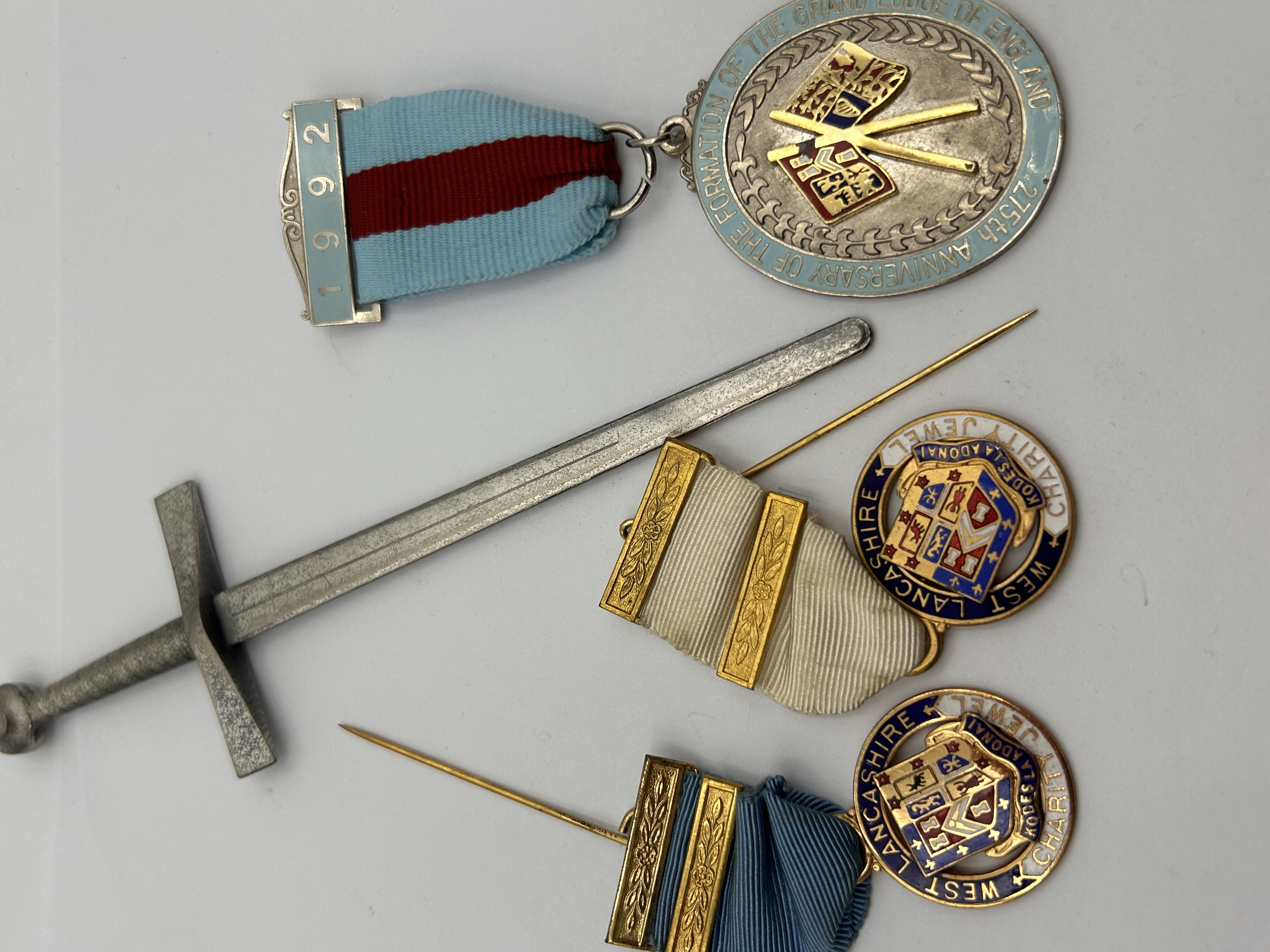 This lot presents a collection of five items, primarily fraternal or commemorative regalia, dating to the late 20th century. The centerpiece is a large, silver-toned medal with a light blue and red striped ribbon, surmounted by a bar inscribed “1992.” Its obverse features a light blue enamel border bearing the inscription “275TH ANNIVERSARY OF THE FORMATION OF THE GRAND LODGE OF ENGLAND” and a central motif of crossed flags. The reverse is marked “IAN ALLAN Regalia.” Accompanying this are two smaller, circular gold-toned medals, each with blue and white enamel detailing a shield crest, suspended from light blue and cream-colored ribbons respectively. These bear the inscriptions “WEST LANCASHIRE ROYAL ARCH JEWELS CHARITY JEWEL,” with one reverse marked “W.BRO. A.S. BRADLEY.” The collection also includes a miniature silver-toned ceremonial sword with a cruciform hilt and a simple gold-toned stick pin. All items are constructed from various metals and textile ribbons.