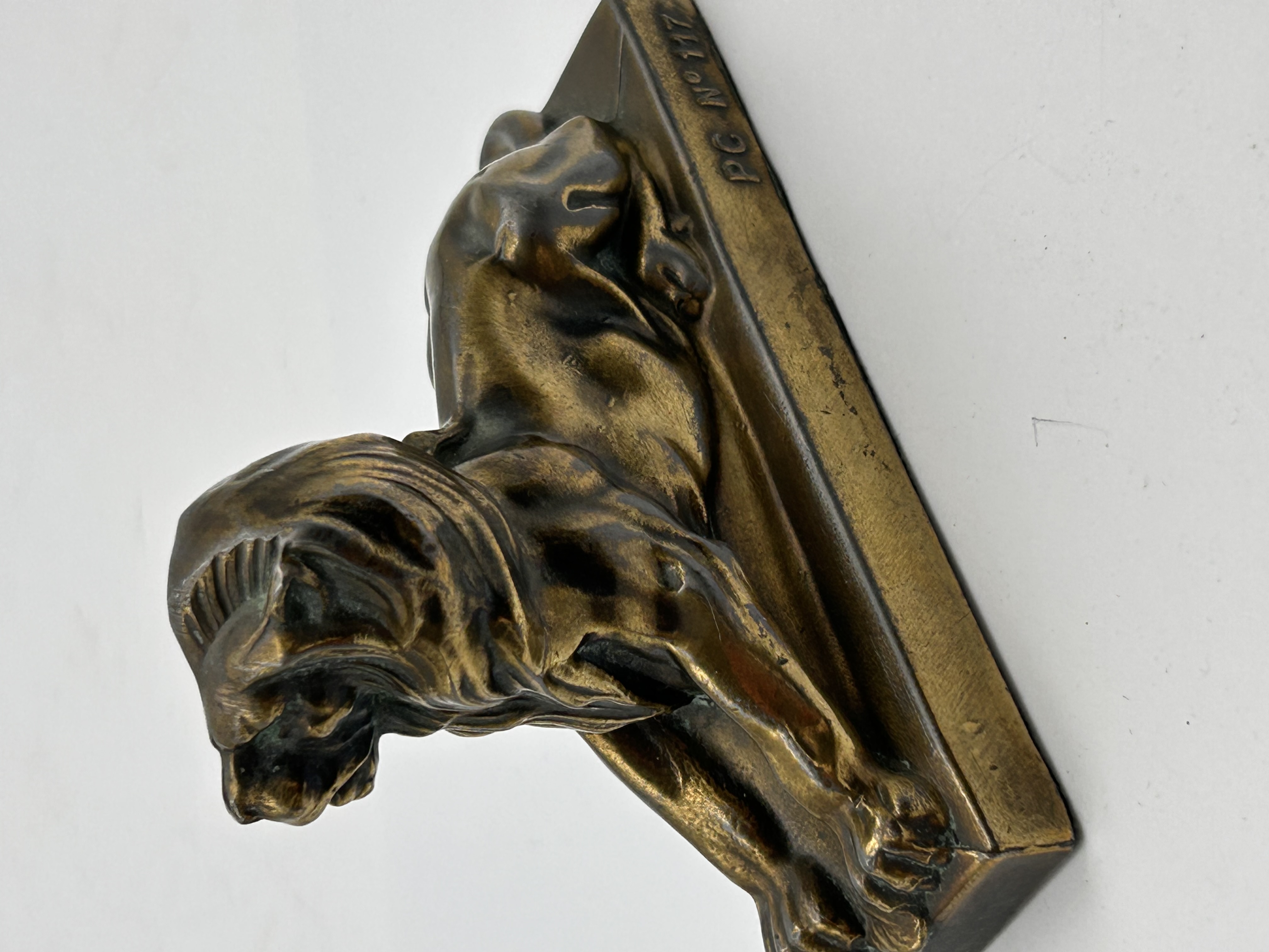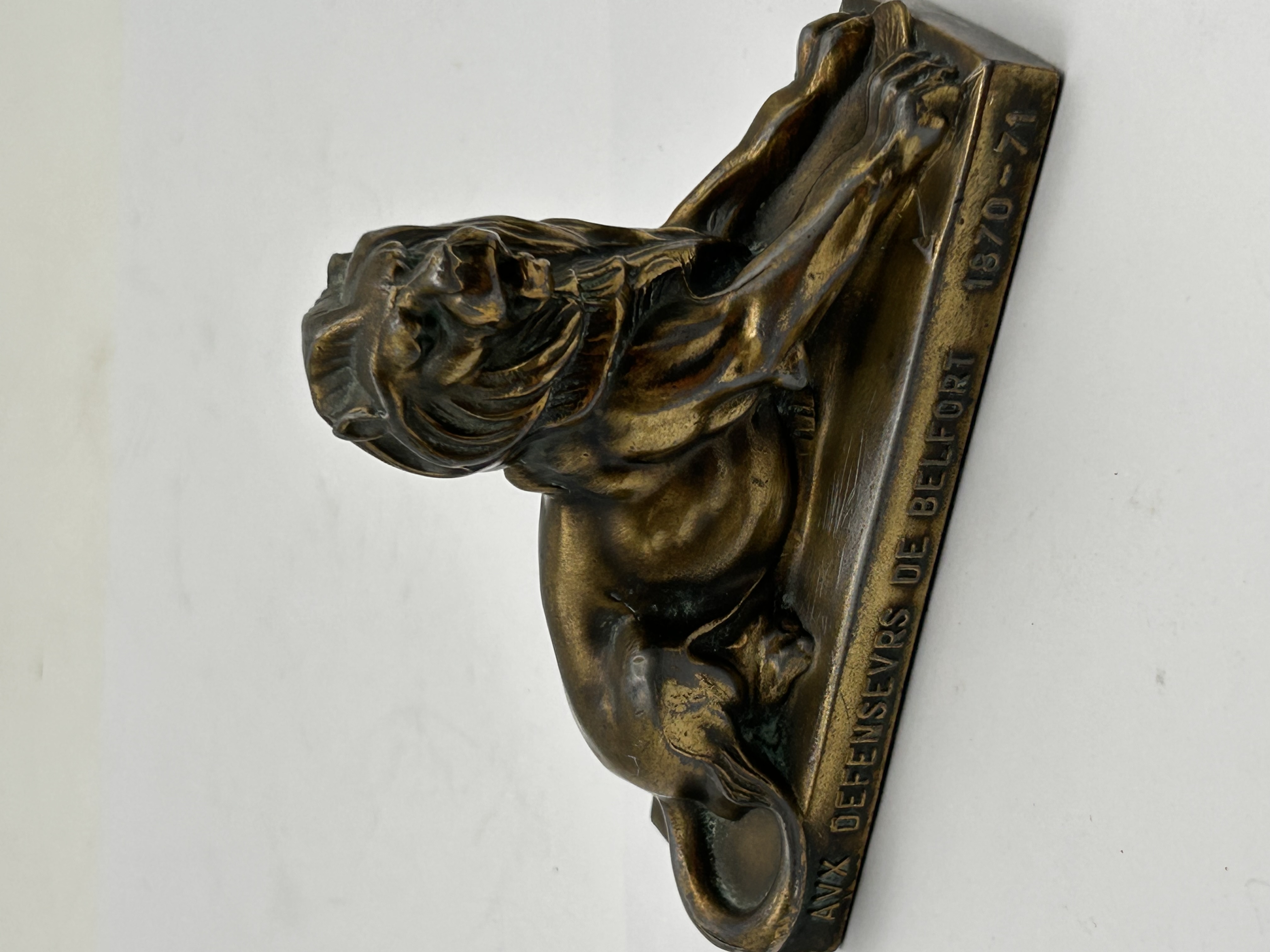 A cast metal sculpture depicting a recumbent lion, rendered in a realistic, classical style, resting on a rectangular base. The lion’s head is turned to the right with its mouth slightly open, and it features a prominent mane. Inscribed on the front of the base are the words “AVX DEFENSEVRS DE BELFORT 1870-71” (To the Defenders of Belfort 1870-71), referencing a historical period. The reverse side of the base bears the marking “PG N° 117.”