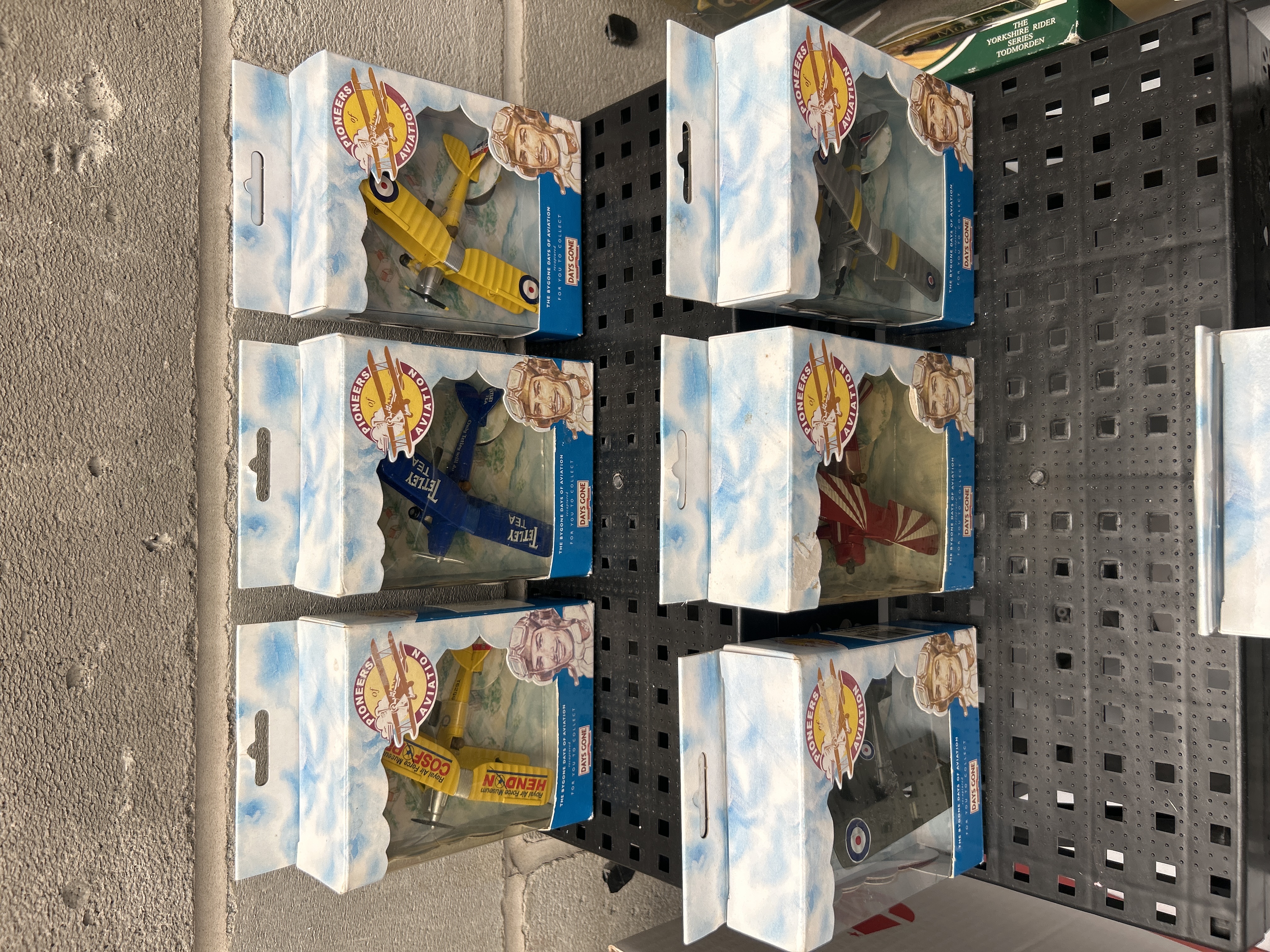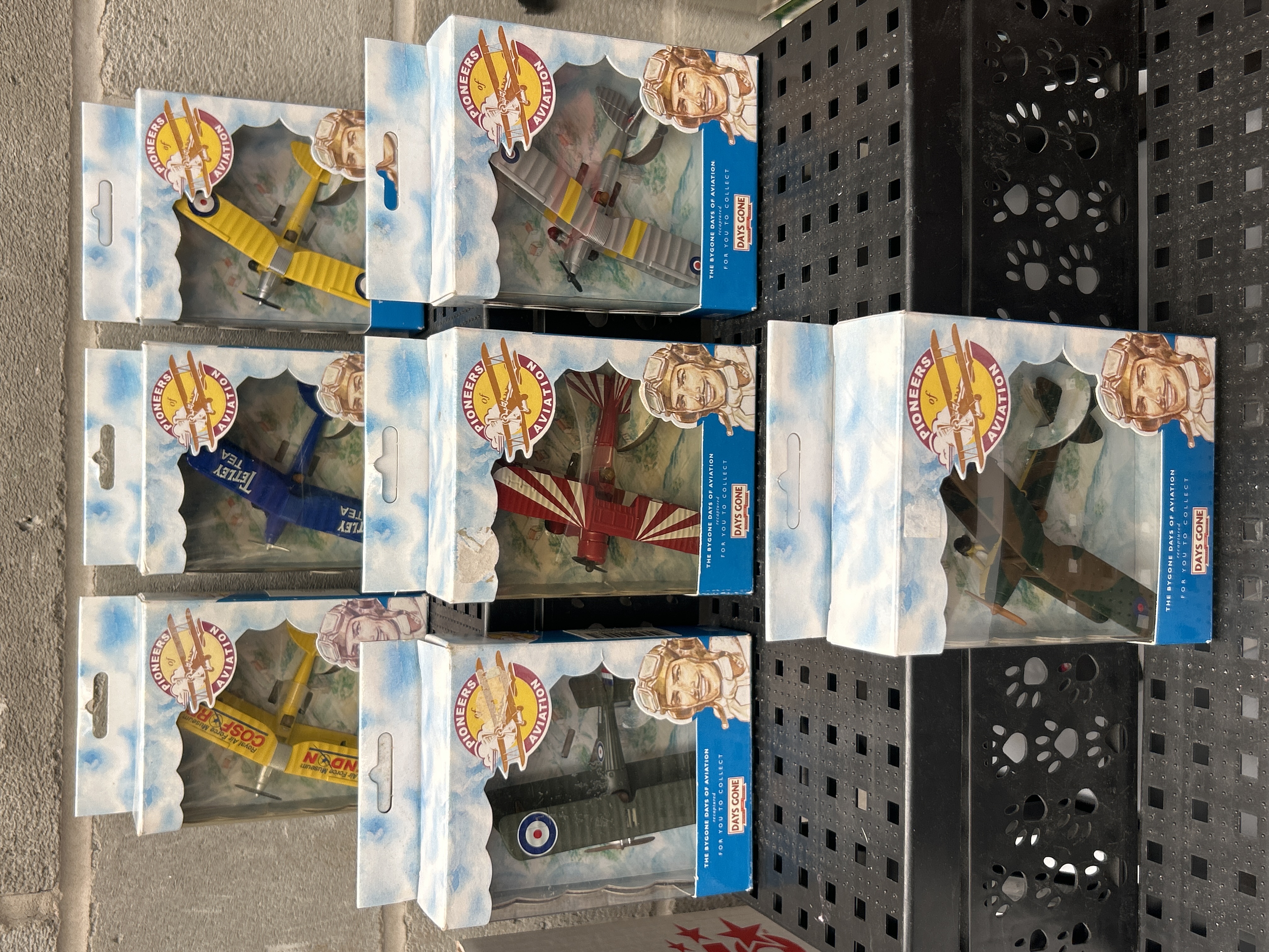 A collection of Lledo Days Gone ‘Pioneers of Aviation’ scale model aircraft. This collection consists of seven individually boxed scale model aircraft, predominantly biplanes and triplanes. The items feature packaging with a cloud motif and a vintage pilot illustration, bearing the text “THE STORIE DAYS OF AVIATION” (likely intended as ‘Storied Days’) and “FOR YOU TO COLLECT.” Visible models include the “CURTISS JN-4 ‘JENNY'”, “BLERIOT XI”, “SOPWITH CAMEL”, and “SPAD XIII,” alongside other distinctive early 20th-century aircraft designs, some displaying national insignia such as the British Roundel. The models appear to be constructed from plastic or die-cast metal and are presented in their original, unopened window boxes.