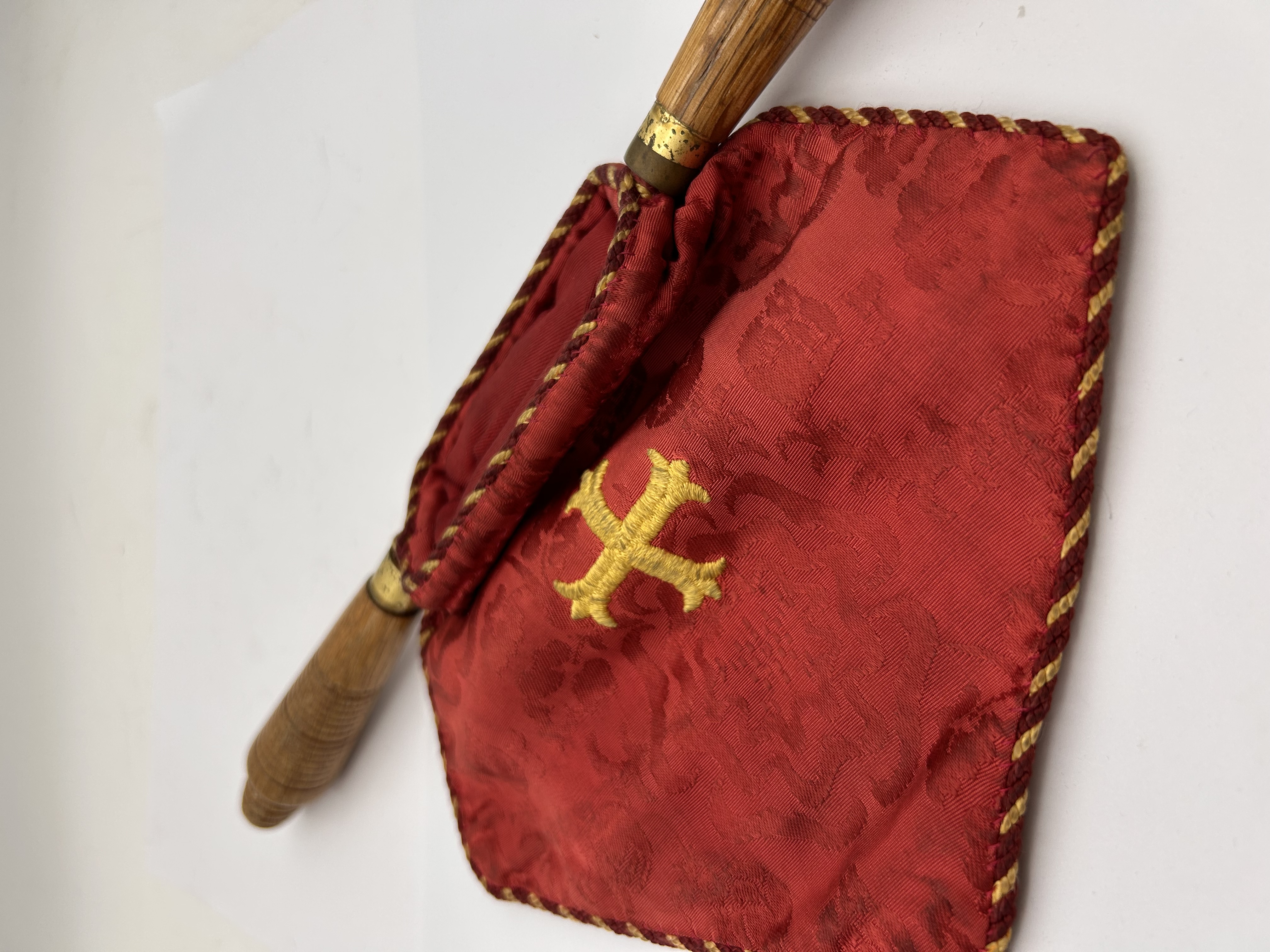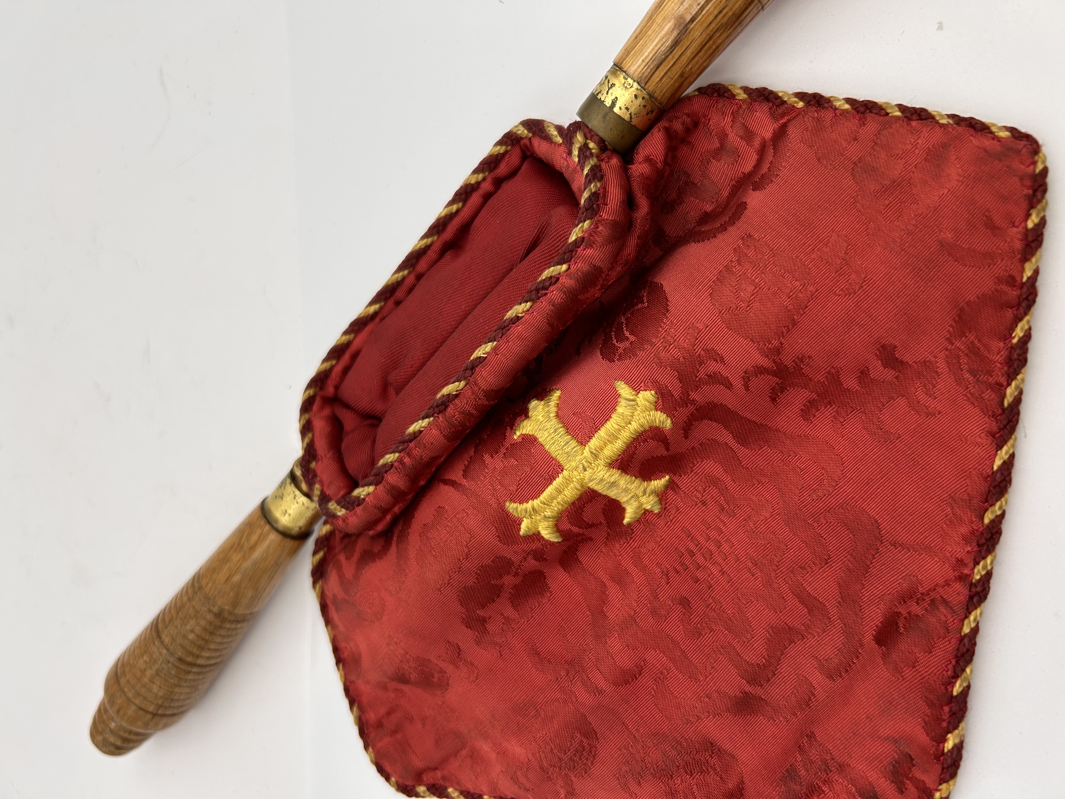 A vintage church collection pouch, comprising a square-shaped, richly woven red fabric panel, possibly silk or a blend, featuring a subtle damask-style pattern. The panel is edged with a gold cord trim. A prominent gold-colored, embroidered cross, resembling a Greek cross or cross potent, is centrally placed on the textile. The fabric panel is attached to a turned wooden handle. The light-toned wooden handle exhibits a visible grain and a ribbed grip section, joined to the fabric element by a brass-colored metal collar.
