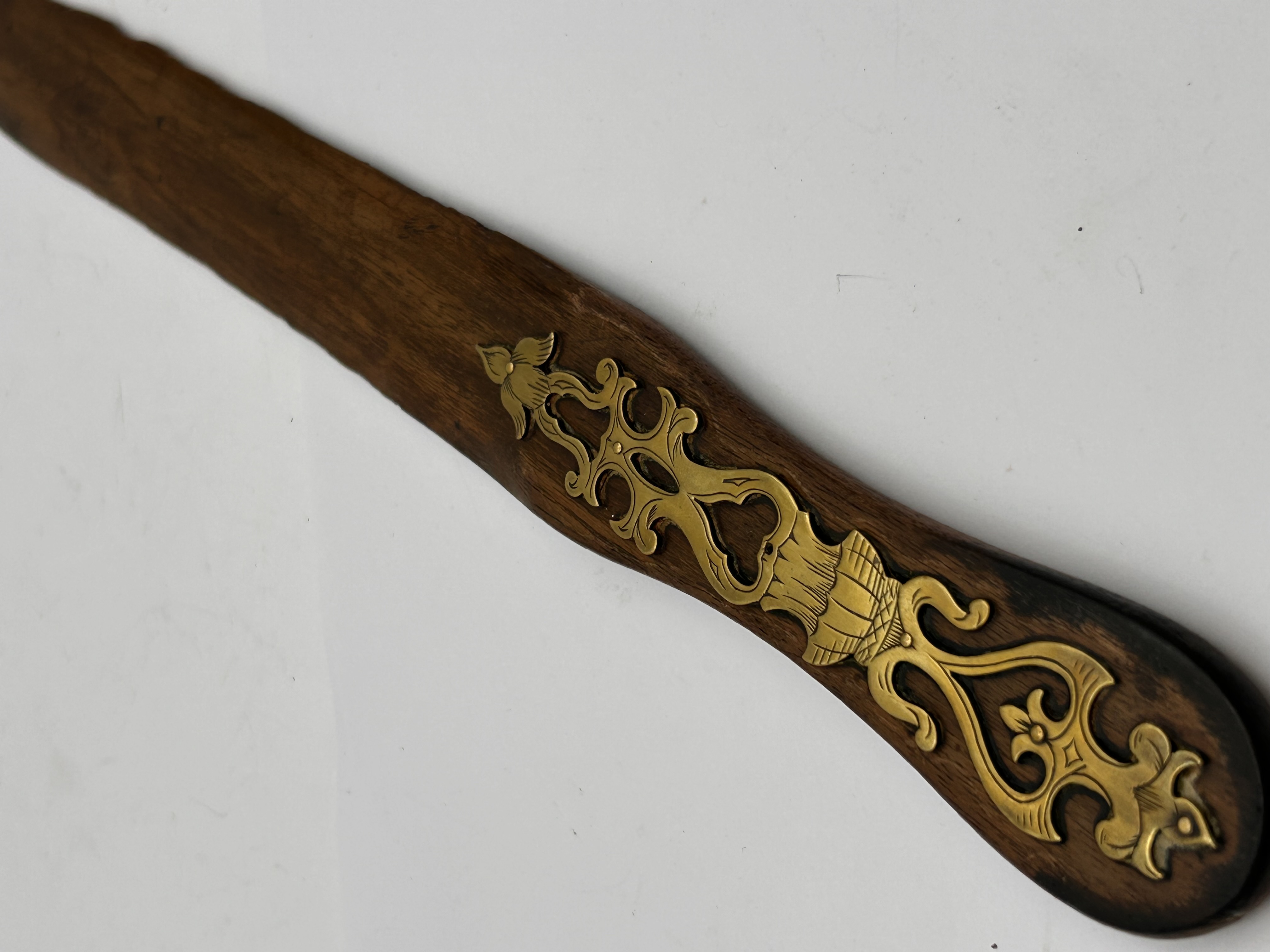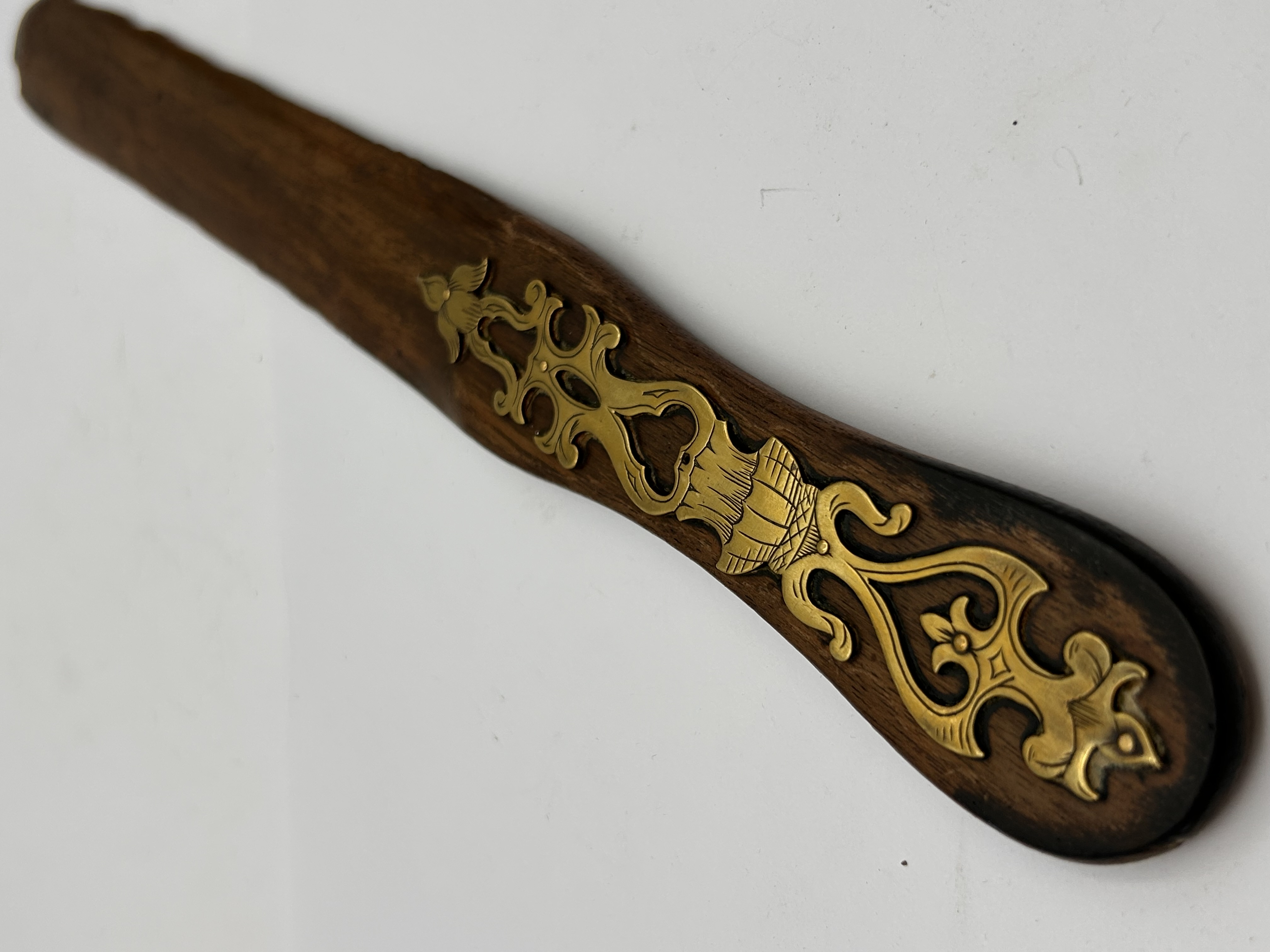 A Victorian brass inlaid wooden page turner. This elongated, flat implement is crafted from dark-stained wood. It features an elaborate central brass inlay comprising interconnected scrollwork, stylized foliage, and a central urn-like motif, exhibiting a decorative, possibly Neo-Baroque or Rococo-inspired aesthetic. No visible text or distinguishing marks are present.
