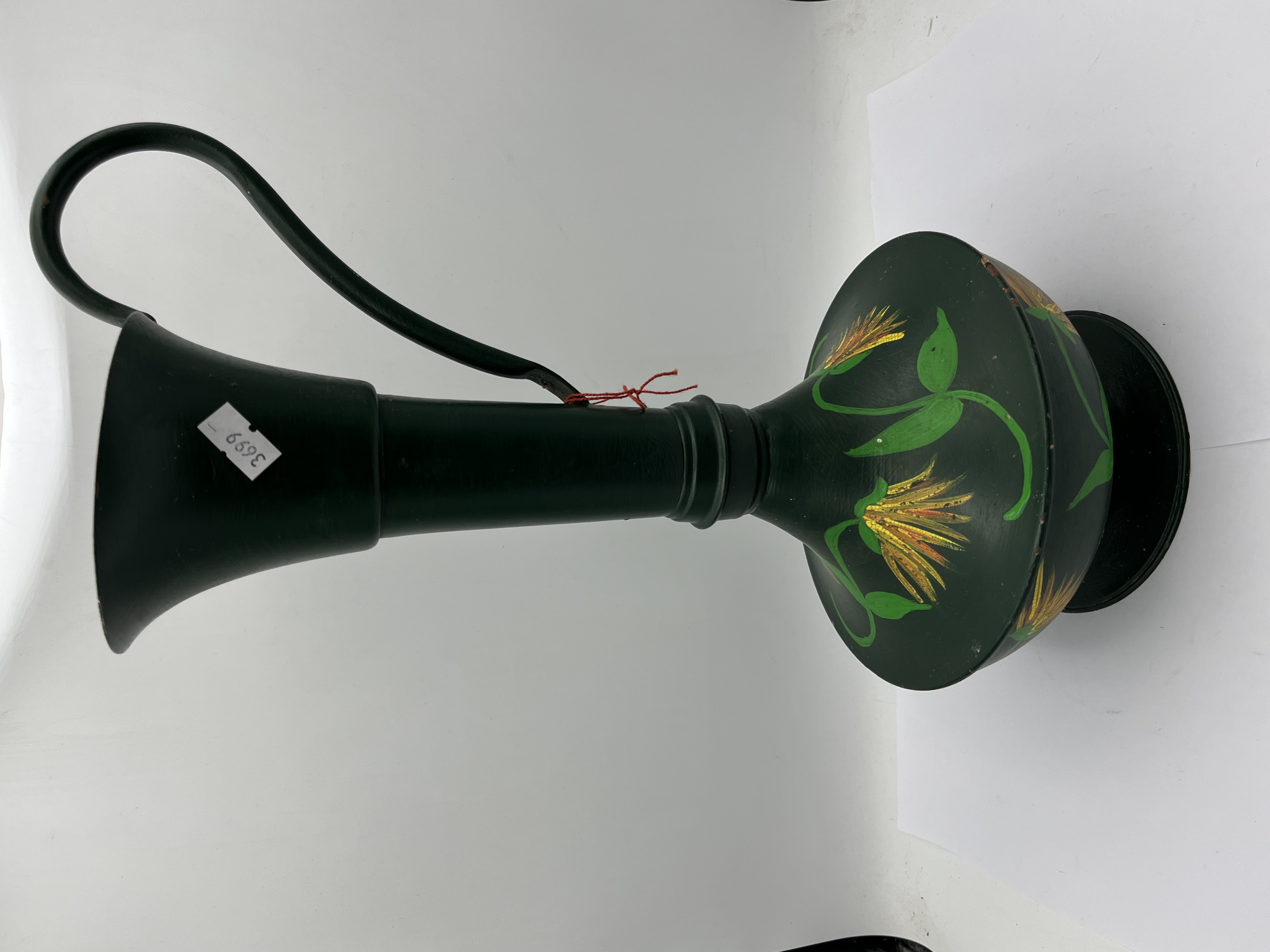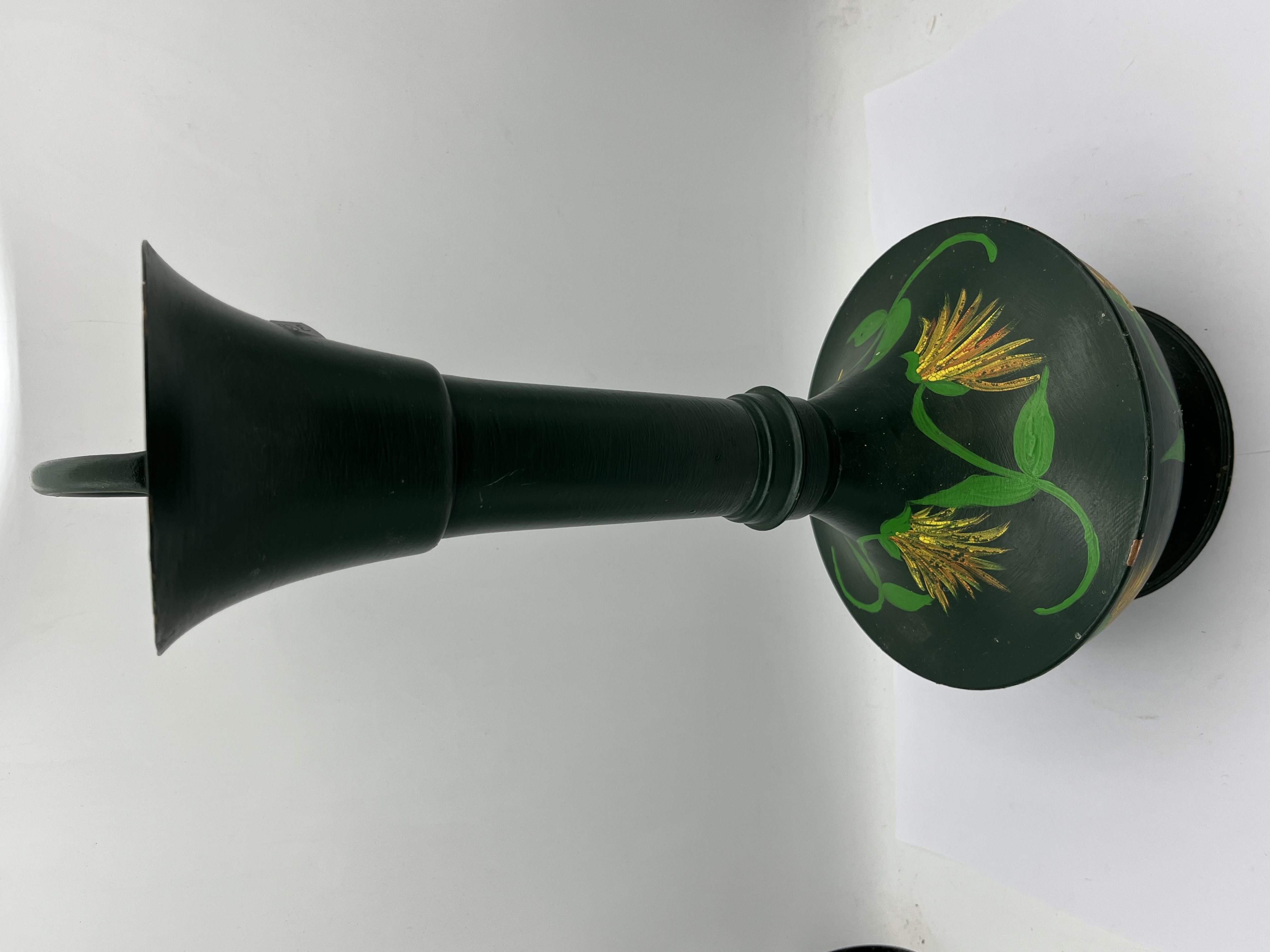 A hand-painted wooden candlestick holder, featuring a dark green painted finish. The piece is designed with a slender neck, a flaring rim, a robust loop handle, and a bulbous base. The base is adorned with folk art-style floral motifs hand-painted in yellow, orange, and green. A white sticker bearing the handwritten numbers “3699” is affixed to the neck, and a small red cord is tied around the base of the handle.