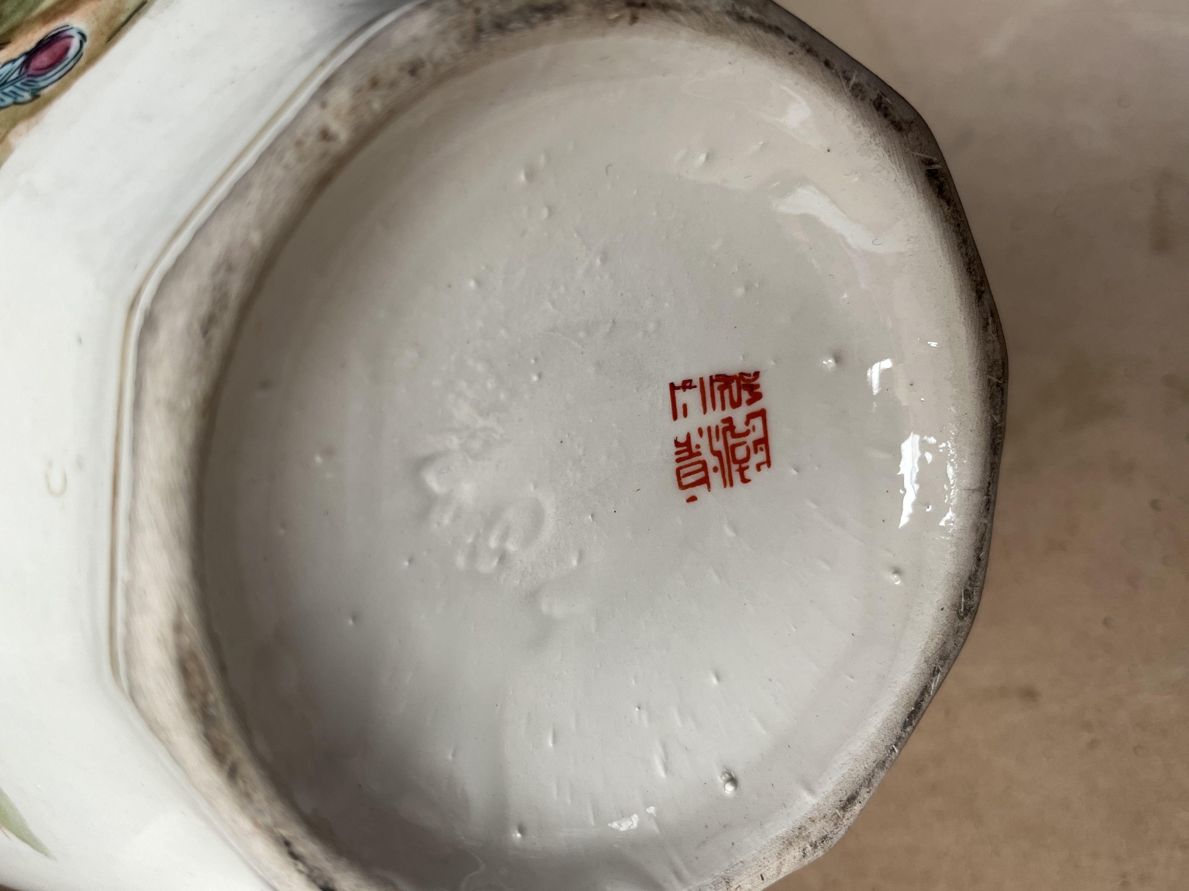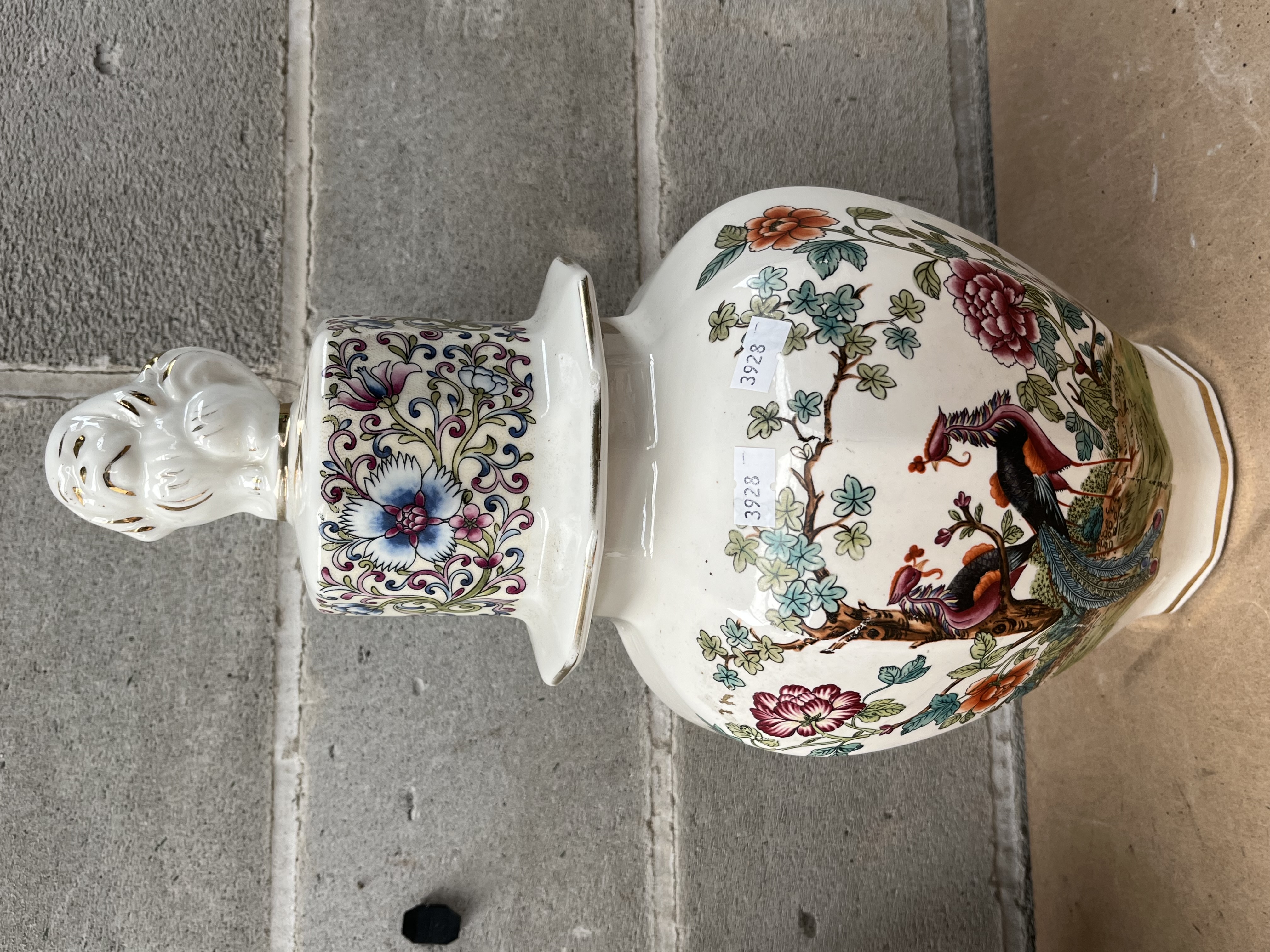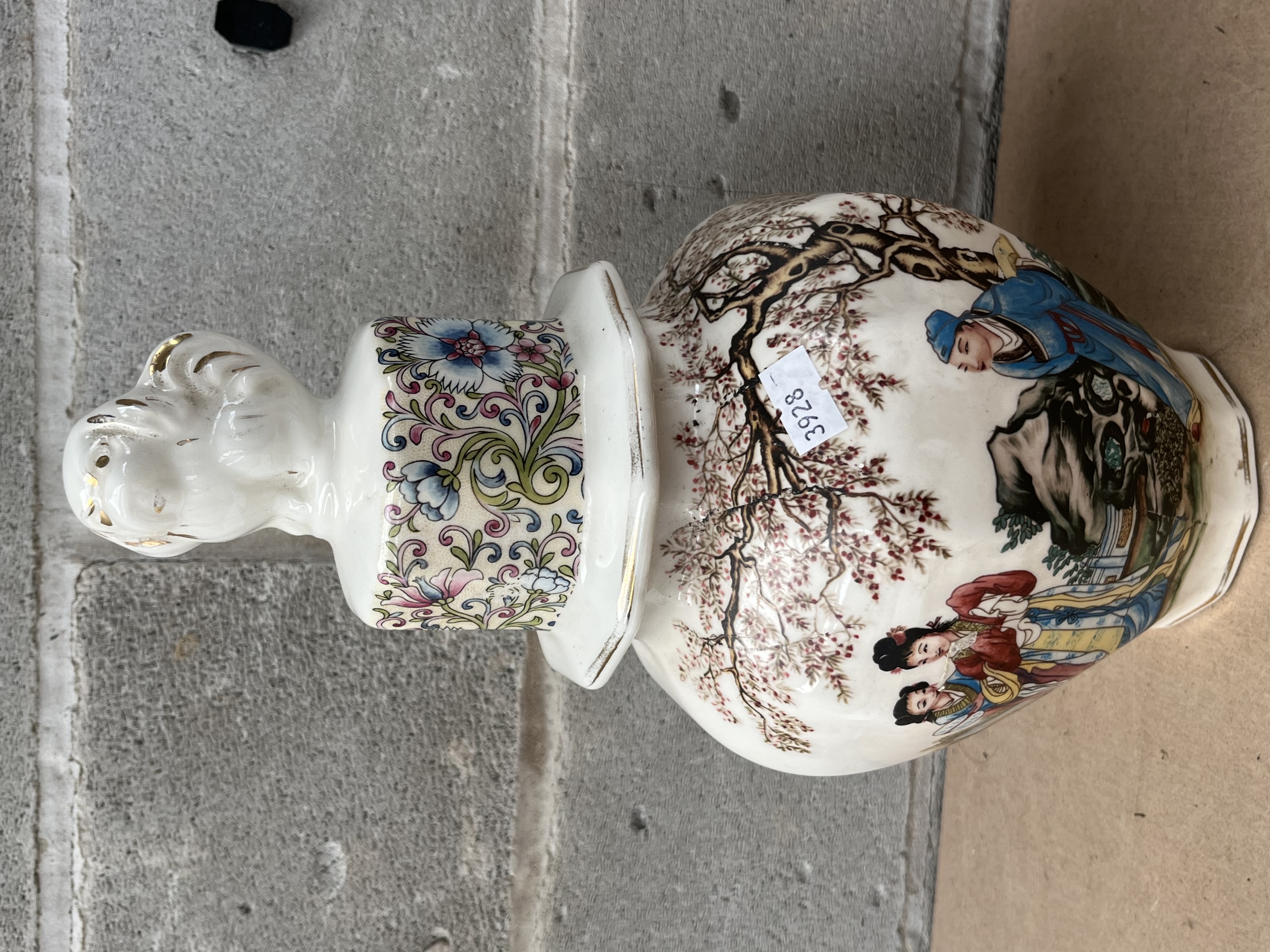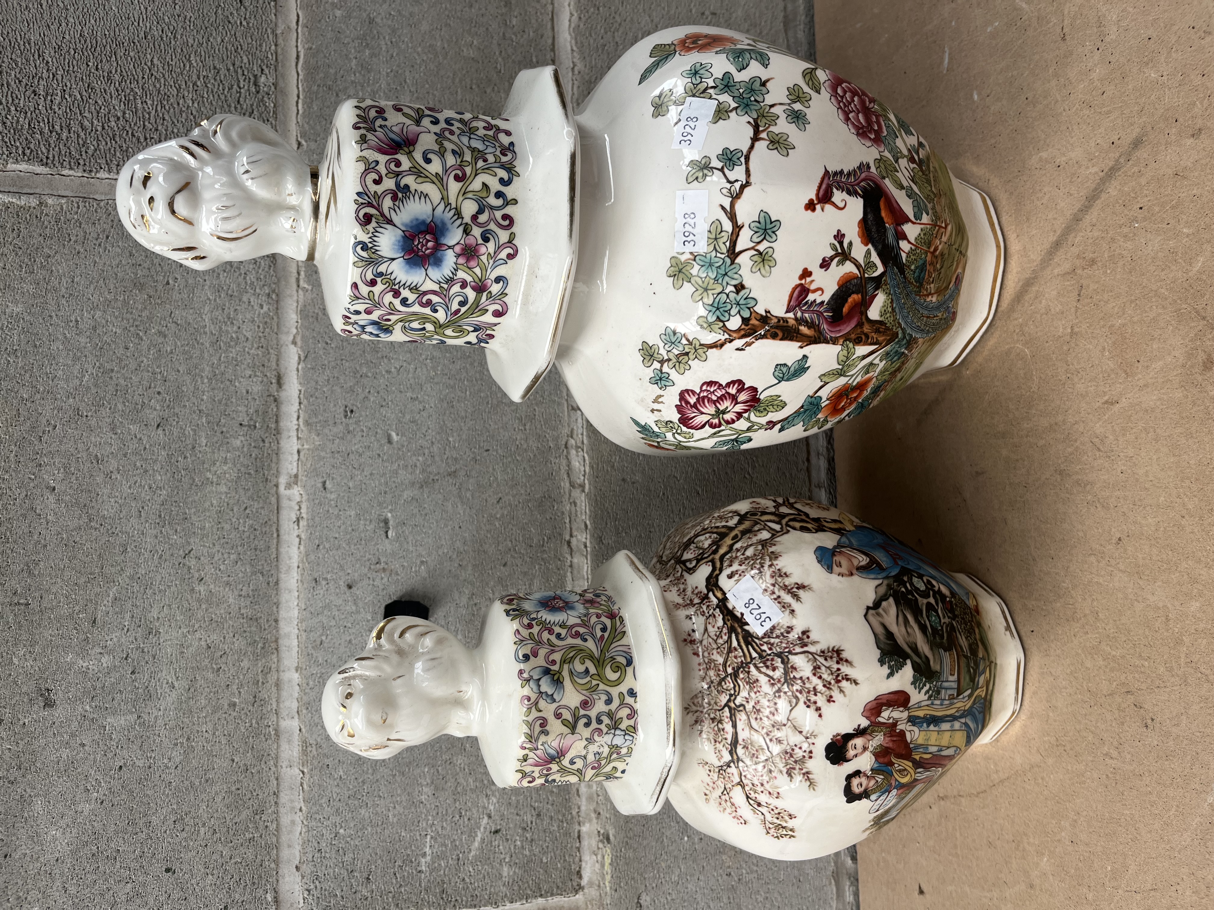 A pair of Chinese Famille Rose porcelain ginger jars. Each jar features a domed lid surmounted by a stylized Foo Dog finial, adorned with floral patterns and gold gilt accents. The body of the left jar is decorated with figures in traditional attire within a landscape featuring a flowering tree. The right jar displays an elaborate design of phoenix-like birds amidst trees and extensive floral motifs. The base of one jar bears a red four-character seal mark reading “乾隆年製” (Qiánlóng Nián Zhì), translating to “Made during the Qianlong Reign,” which is a common apocryphal mark found on later pieces. Both jars bear white inventory stickers marked “3928.”