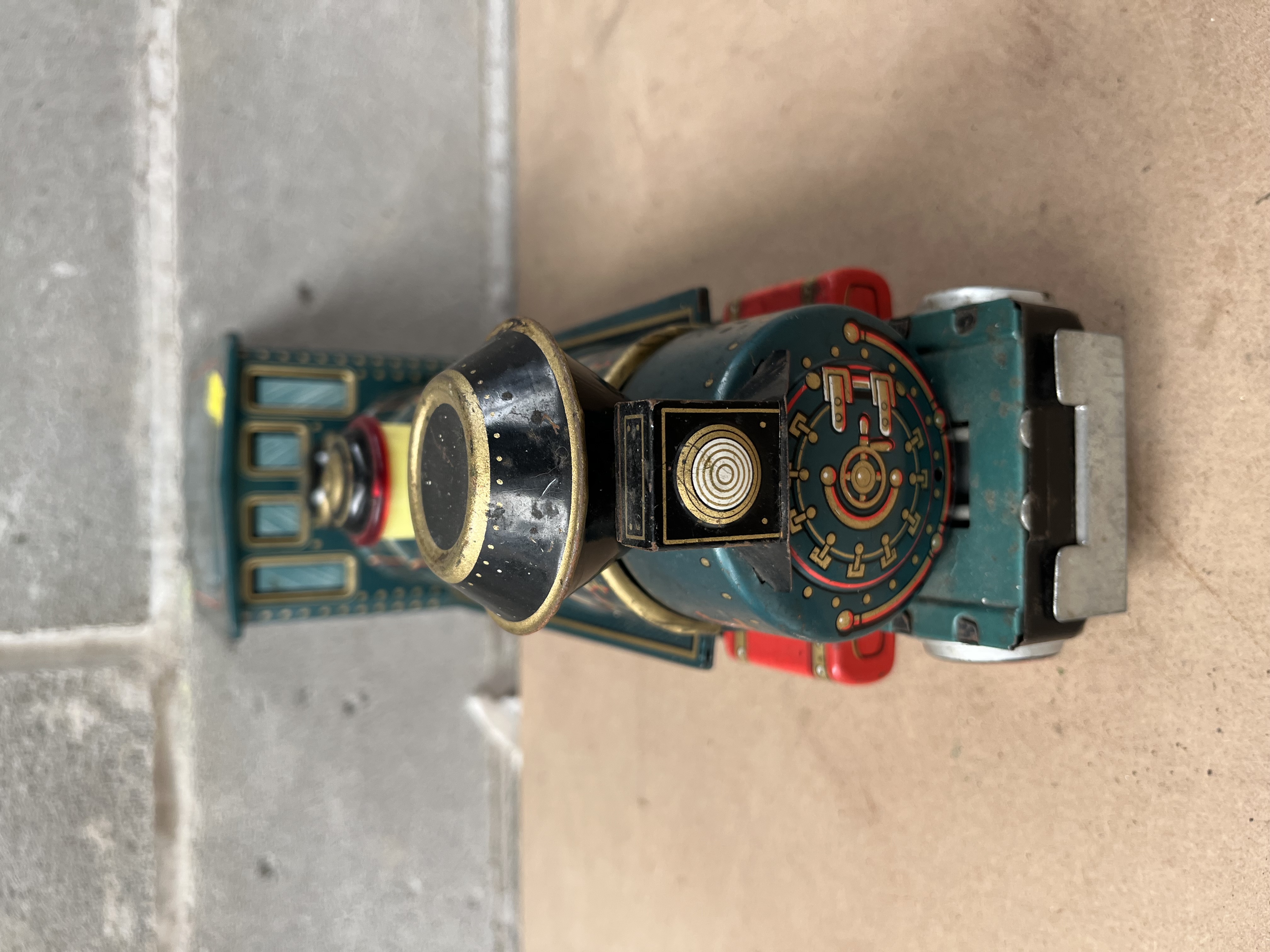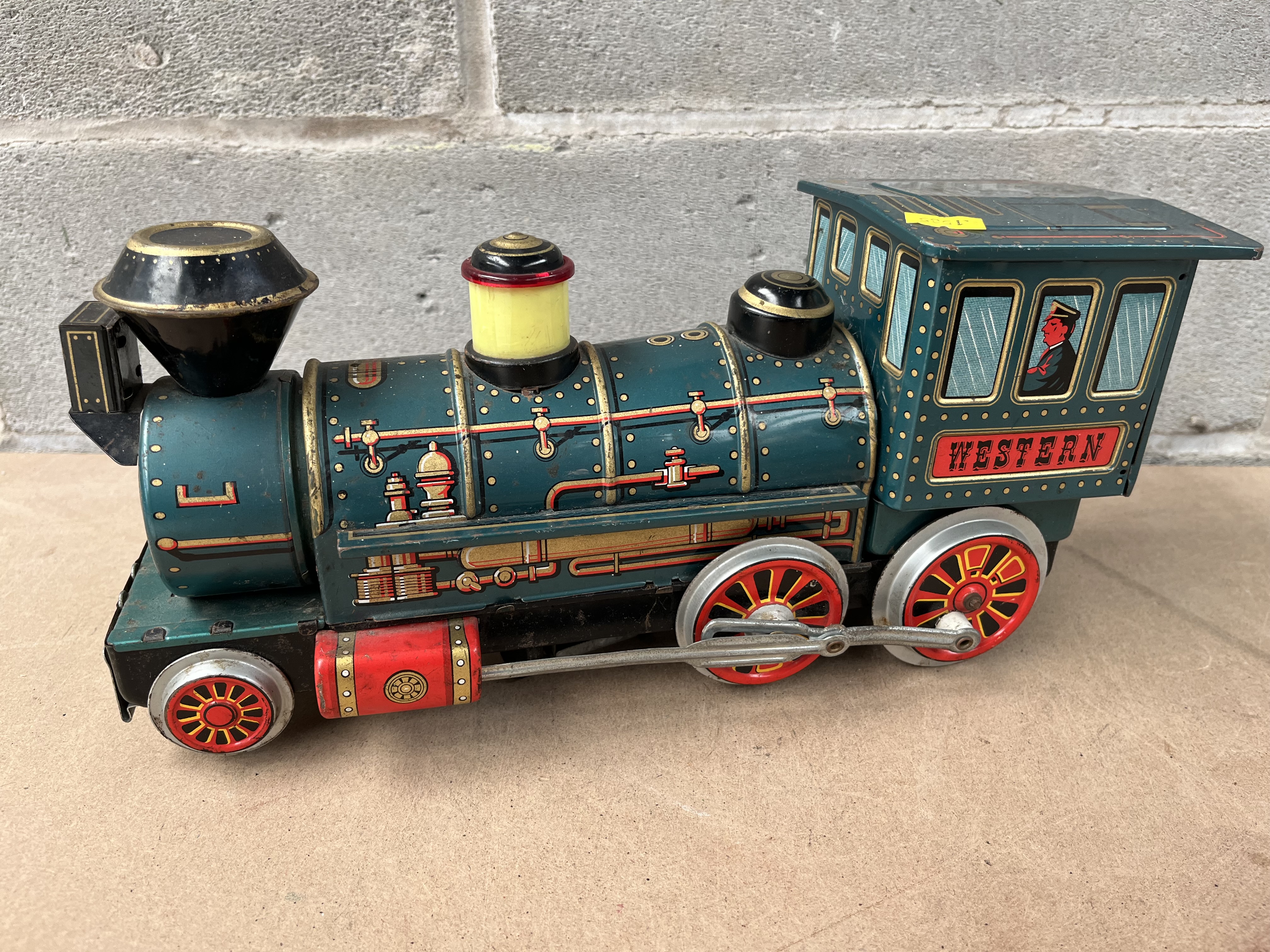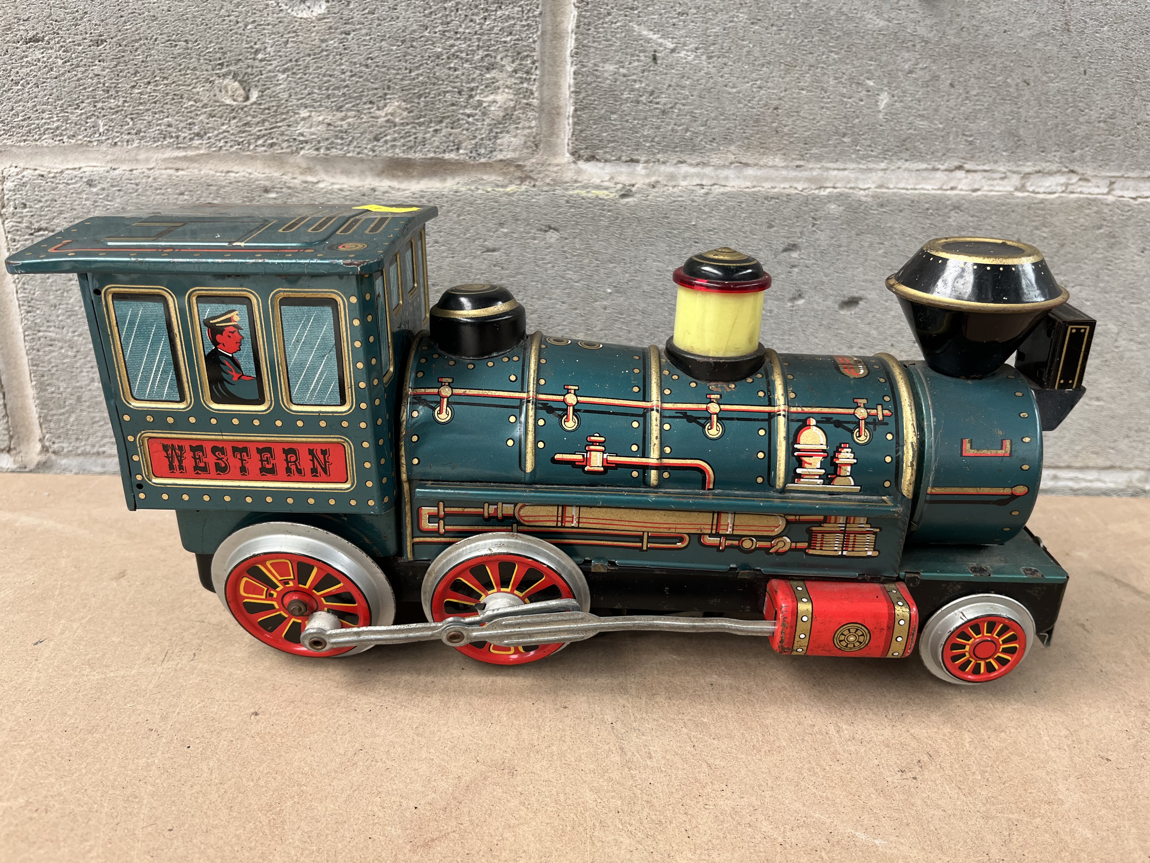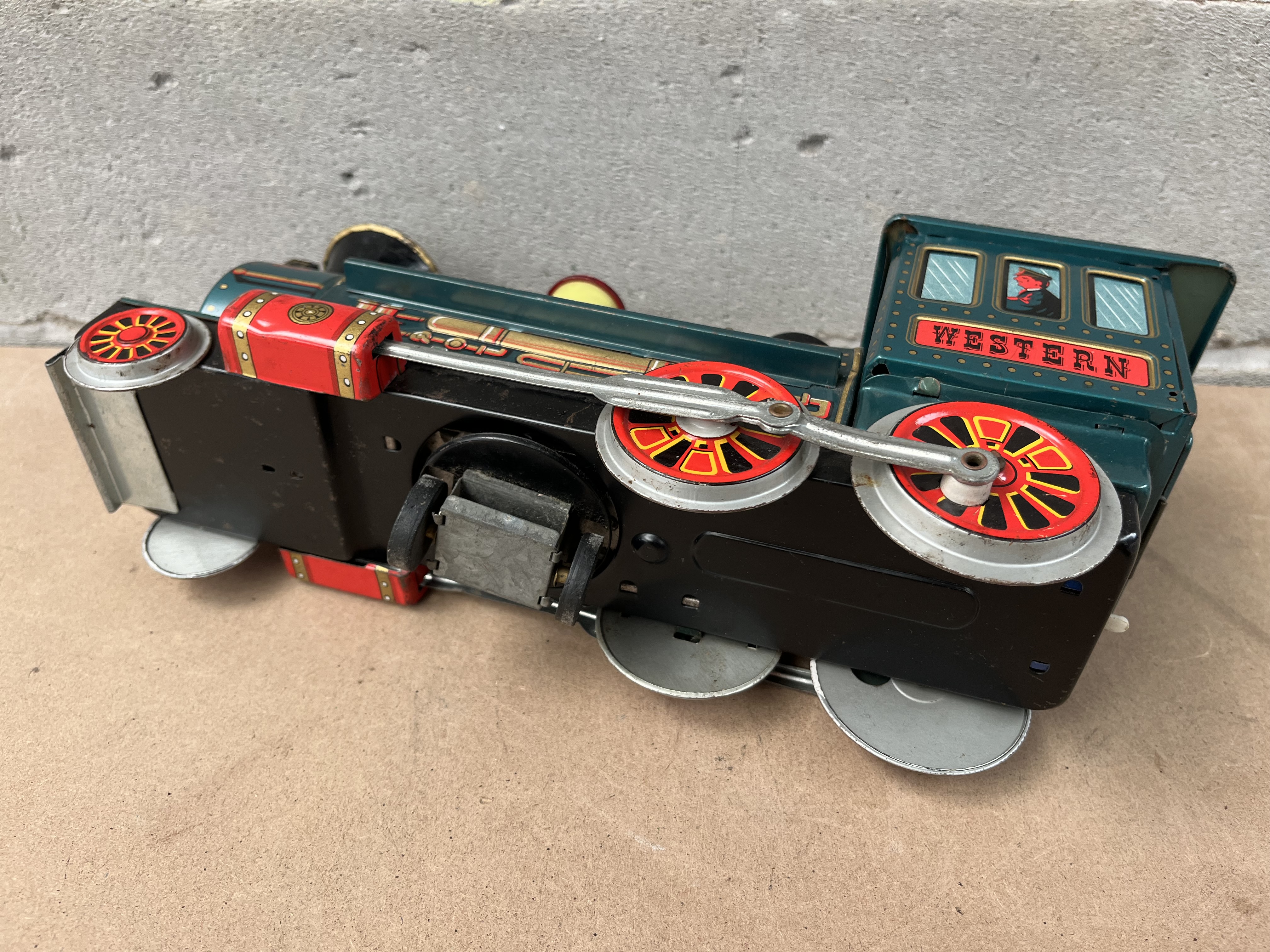 A Modern Toys ‘Western Special Locomotive’ tin lithographed battery-operated toy train, made in Japan. This vintage toy locomotive is styled as a classic steam engine, featuring a teal-green body with elaborate gold, red, and black lithographed details. It has red spoked wheels, a yellow smokestack collar, and a black domed smokebox. The cab side displays “WESTERN” in red text and depicts a driver figure. A small yellow sticker with the number “5” and an additional symbol is affixed to the cab roof.