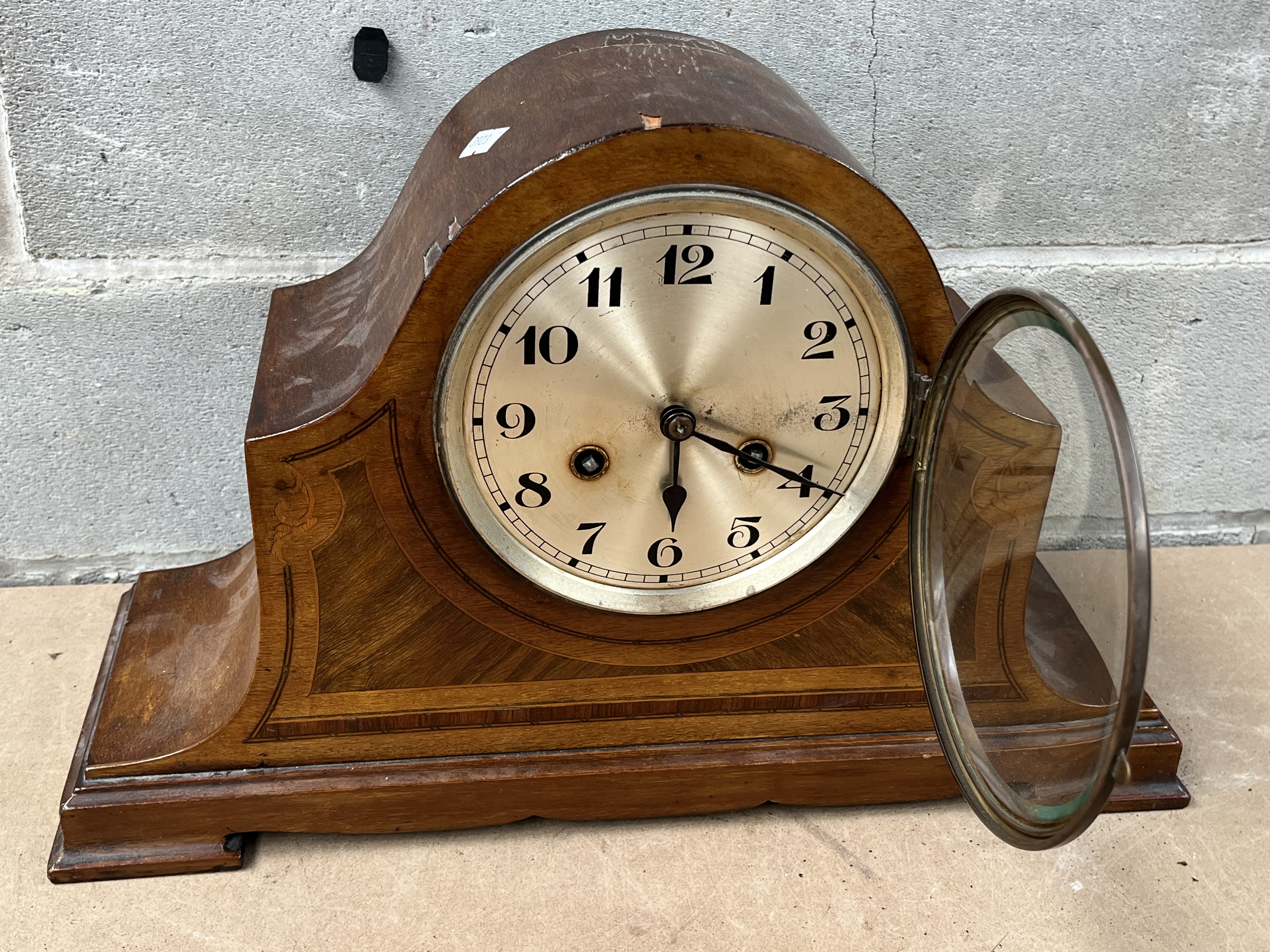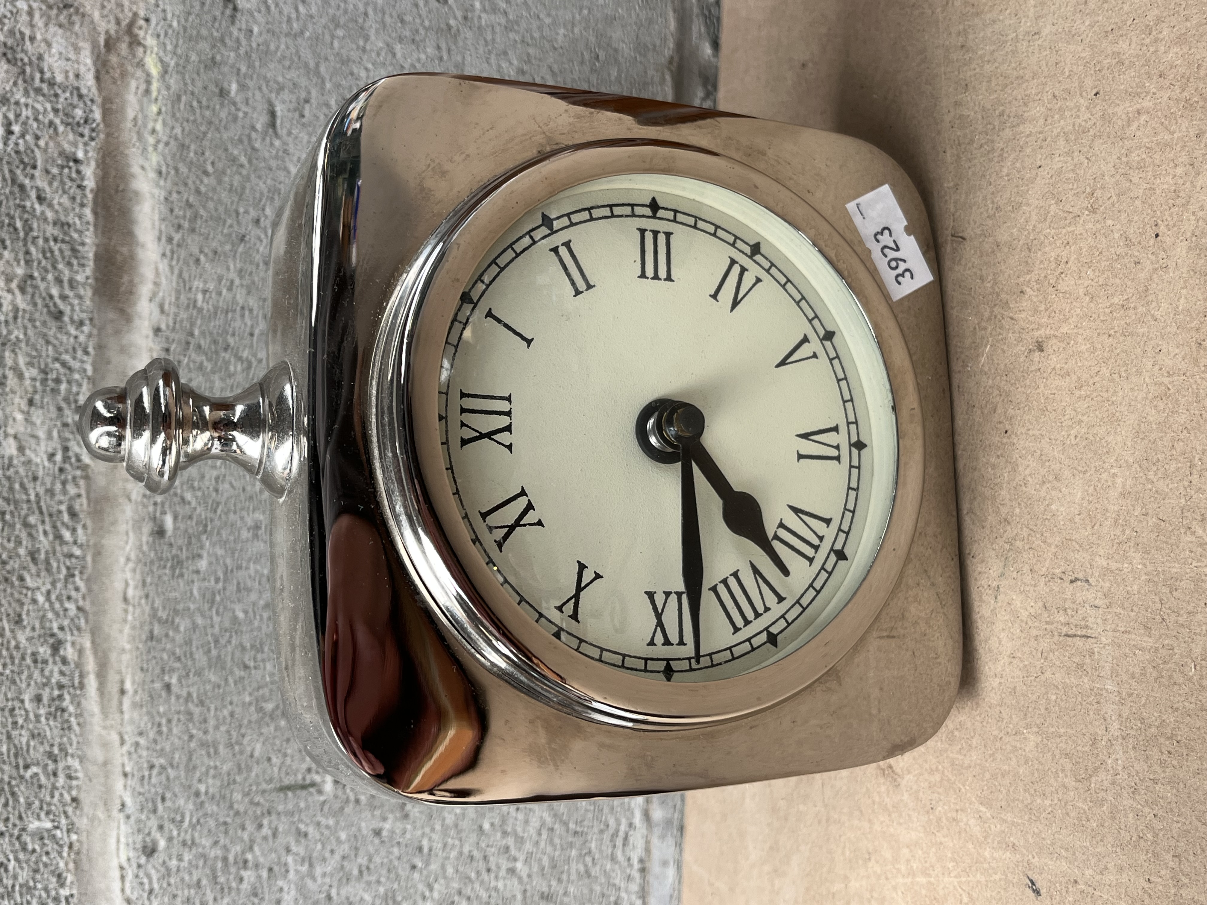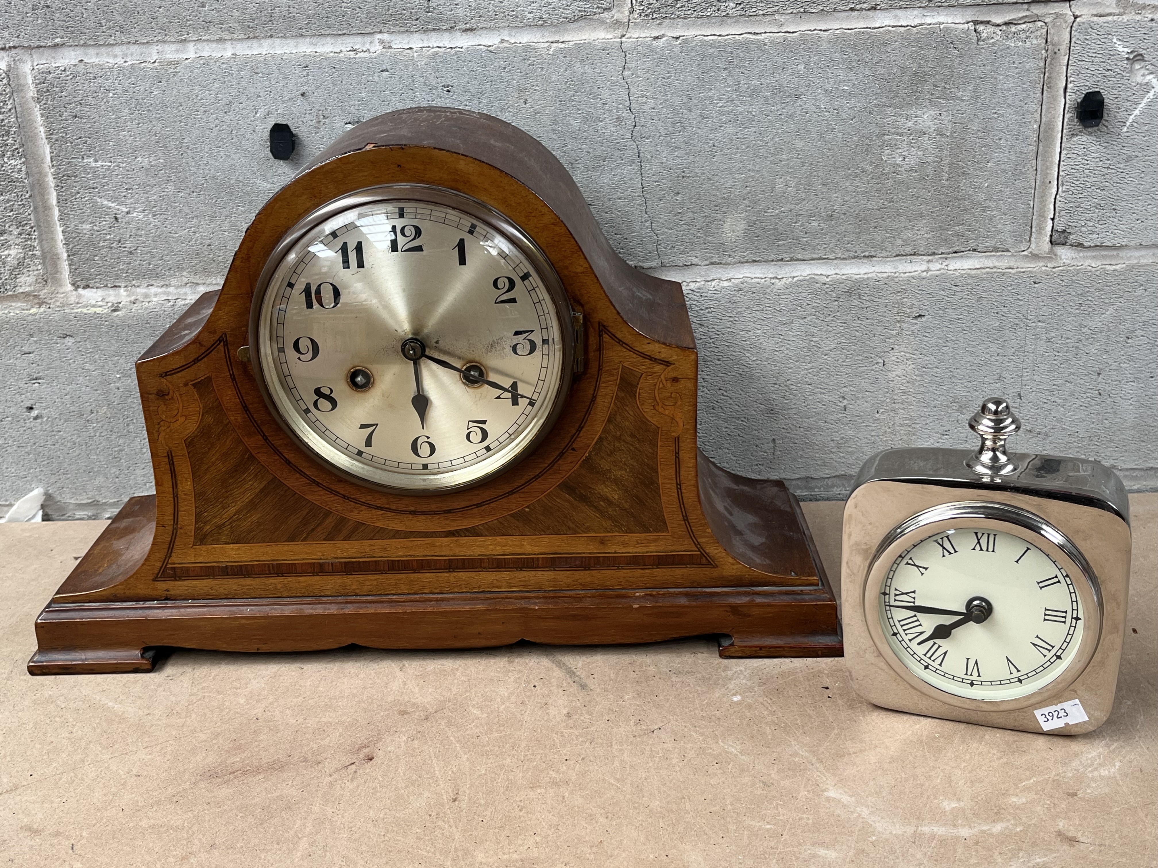 A pair of clocks, including an early 20th century mantel clock and a modern desk clock. The larger mantel clock is constructed from wood with visible veneer, possibly walnut or mahogany, featuring a curved top and base with lighter wood inlay details. It has a brass bezel surrounding a cream-colored dial with black Arabic numerals (1-12) and two winding holes; the glass cover is shown open in one view. The smaller desk or boudoir clock is square-shaped, made of polished silver-tone metal with rounded corners and a decorative finial on top. It features a white dial with black Roman numerals (I-XII) and has a white sticker marked “3923” affixed to its lower right front.