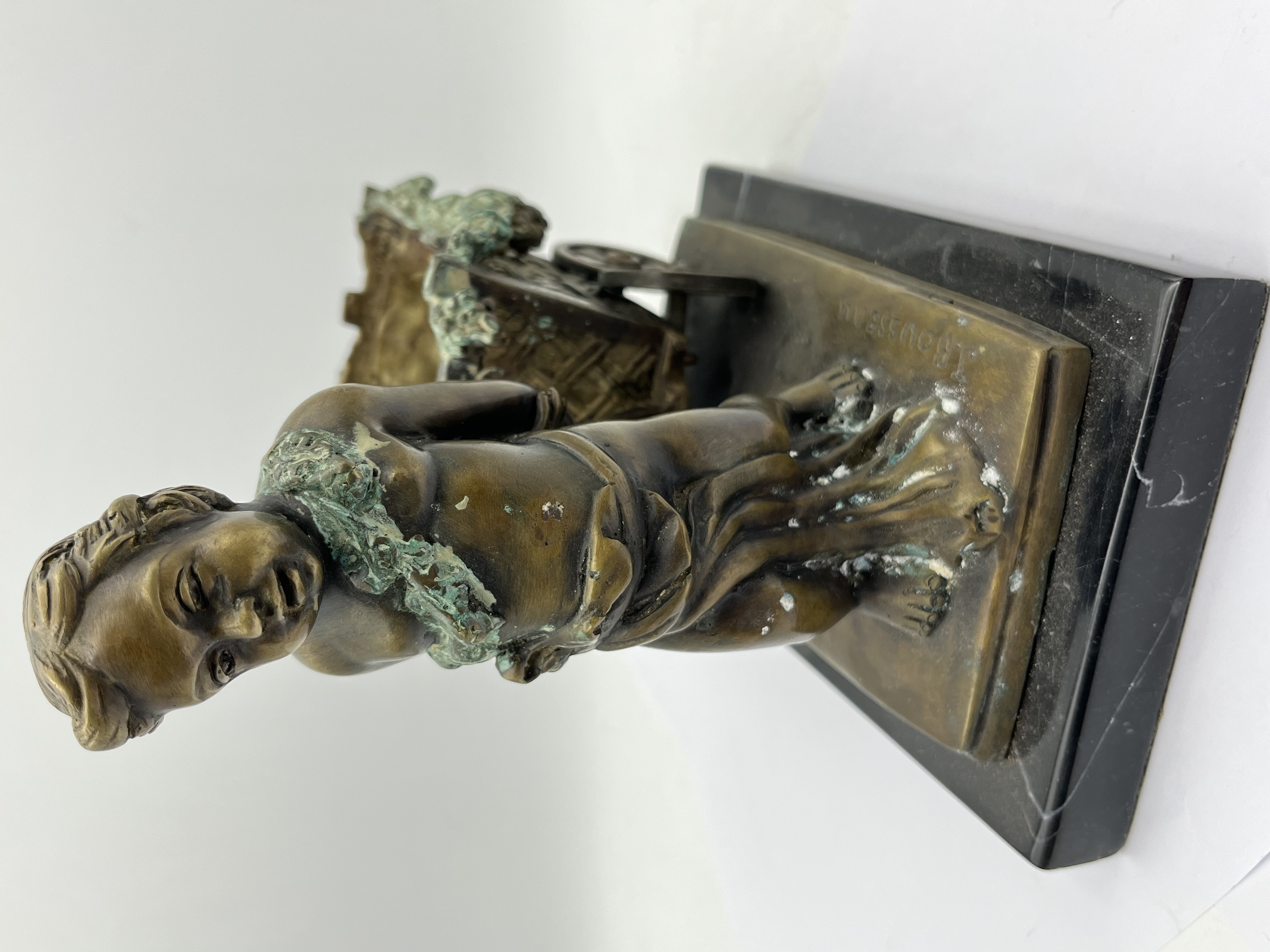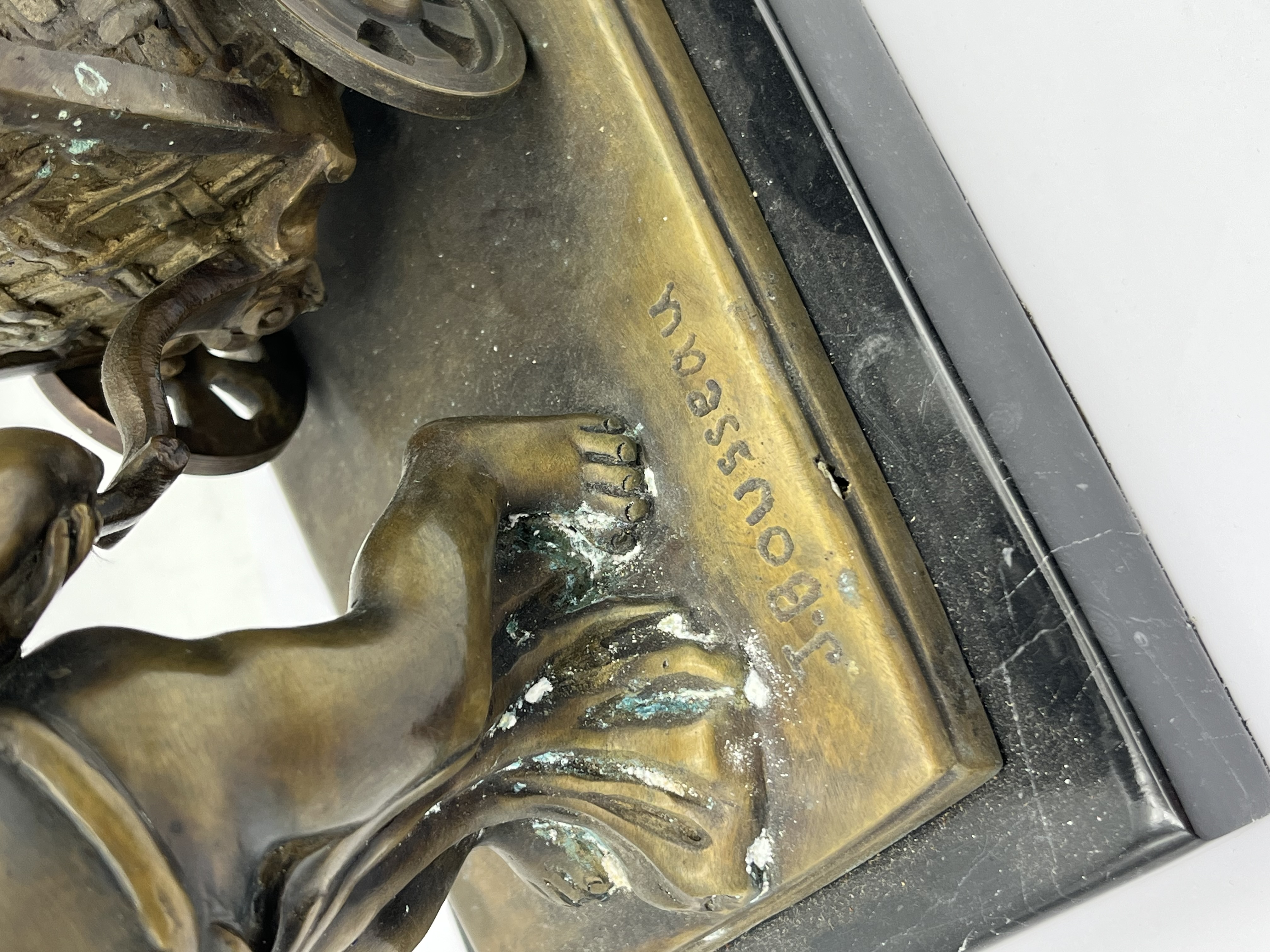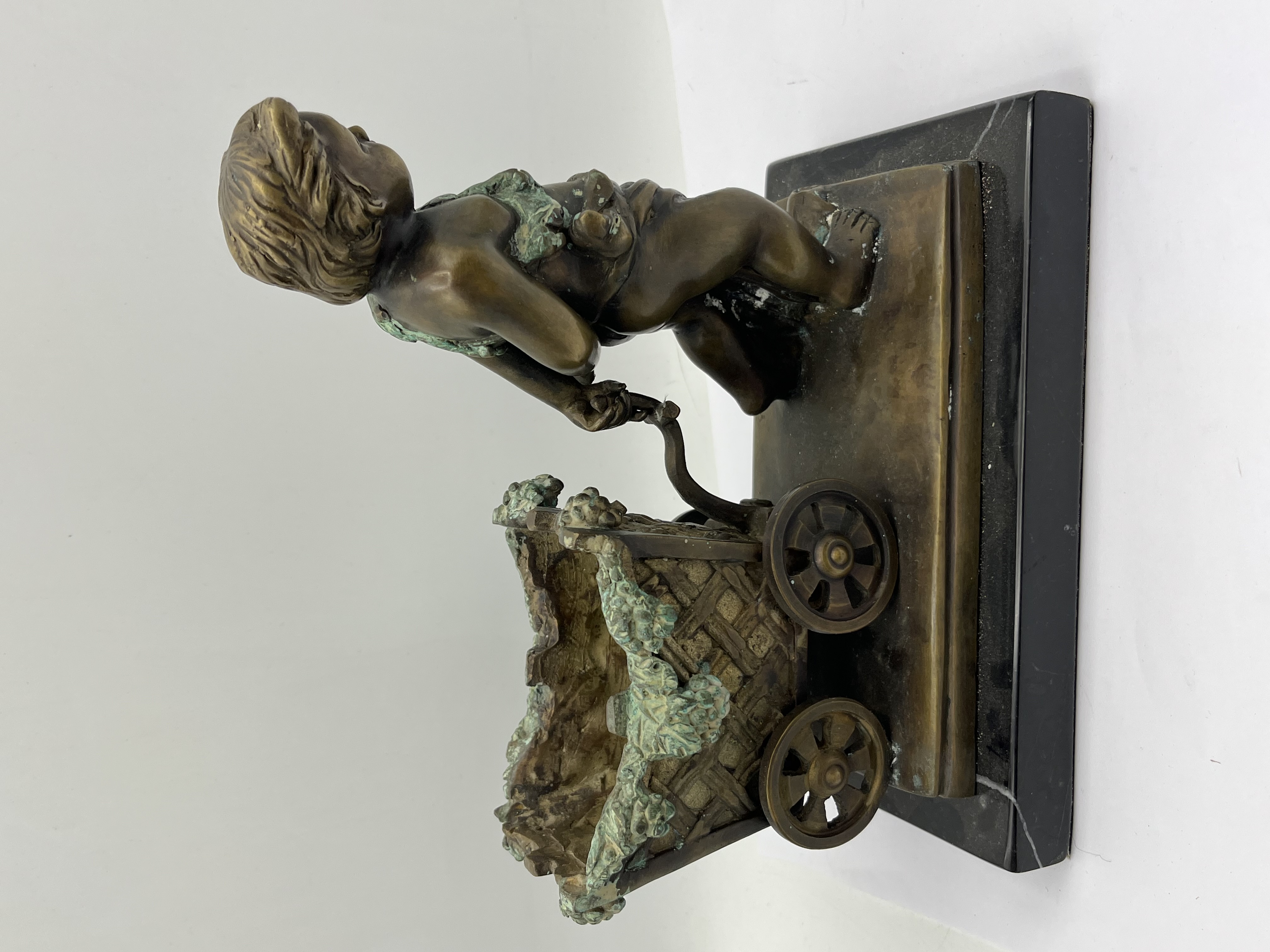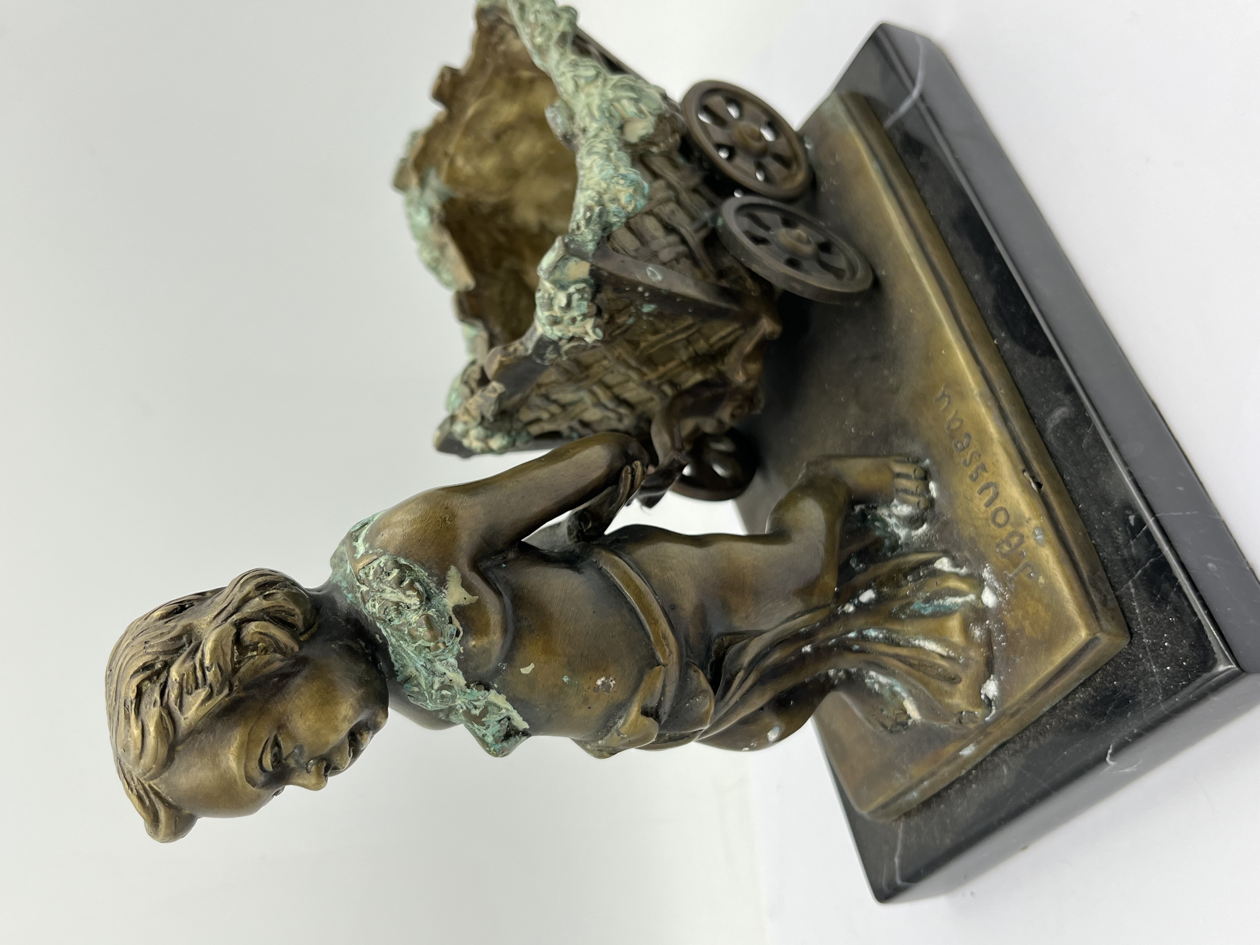 A bronze figural sculpture by J. Rousseau, dating from the late 19th to early 20th century, depicting a putto-like child pulling a two-wheeled cart with a basket-weave texture. Executed in an academic or naturalistic style, the bronze displays a dark, aged patination with prominent green verdigris, particularly visible on the leafy garlands adorning the child and lining the cart. The piece is mounted on a rectangular polished black marble base. An incised signature, ‘J. Rousseau,’ is present on the bronze base near the child’s foot.