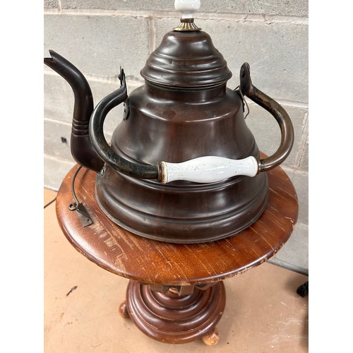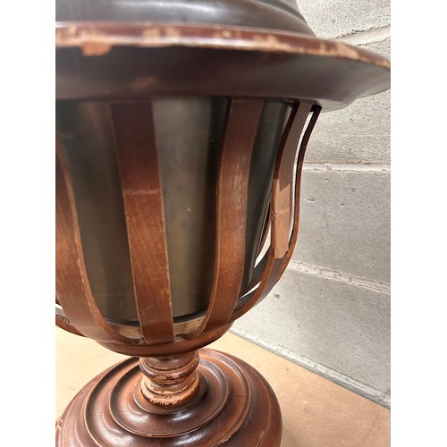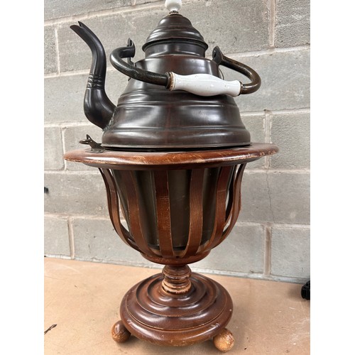 A traditional samovar or hot water urn, dating from the late 19th to early 20th century. The piece features a dark, patinated copper or brass kettle with a white ceramic handle grip and a matching lid finial. It is set upon a coordinating turned wooden pedestal base, which comprises a circular platform, an open-work slatted body encasing an interior metal cylinder, and three bun feet.