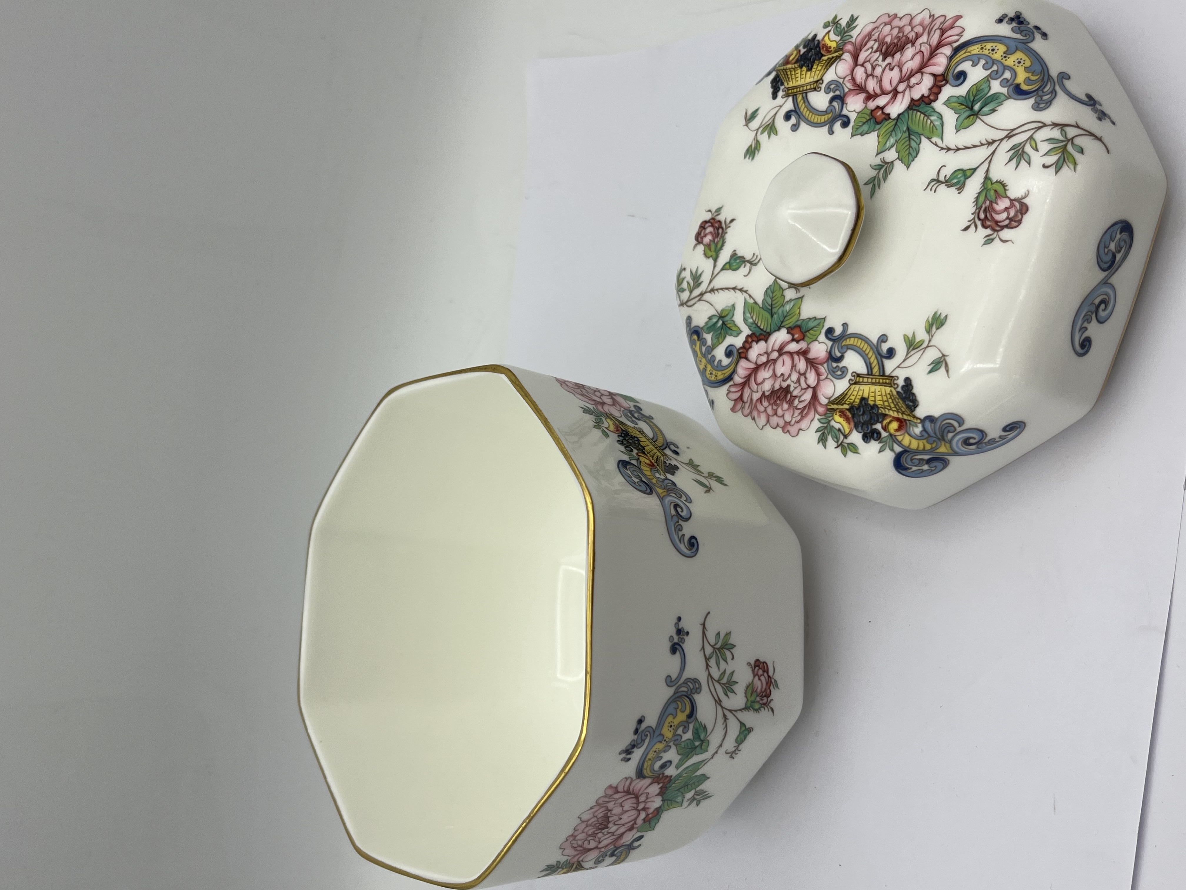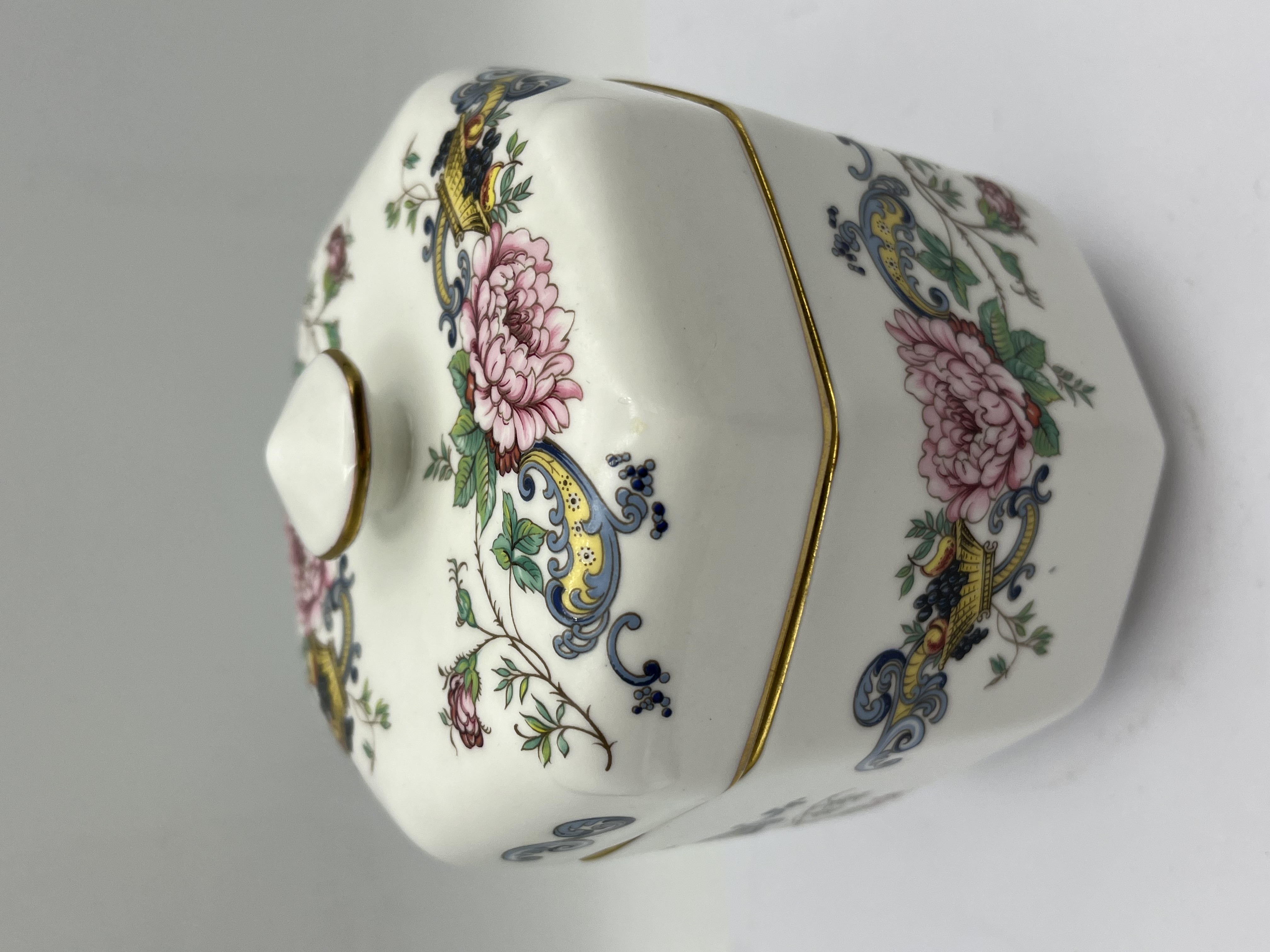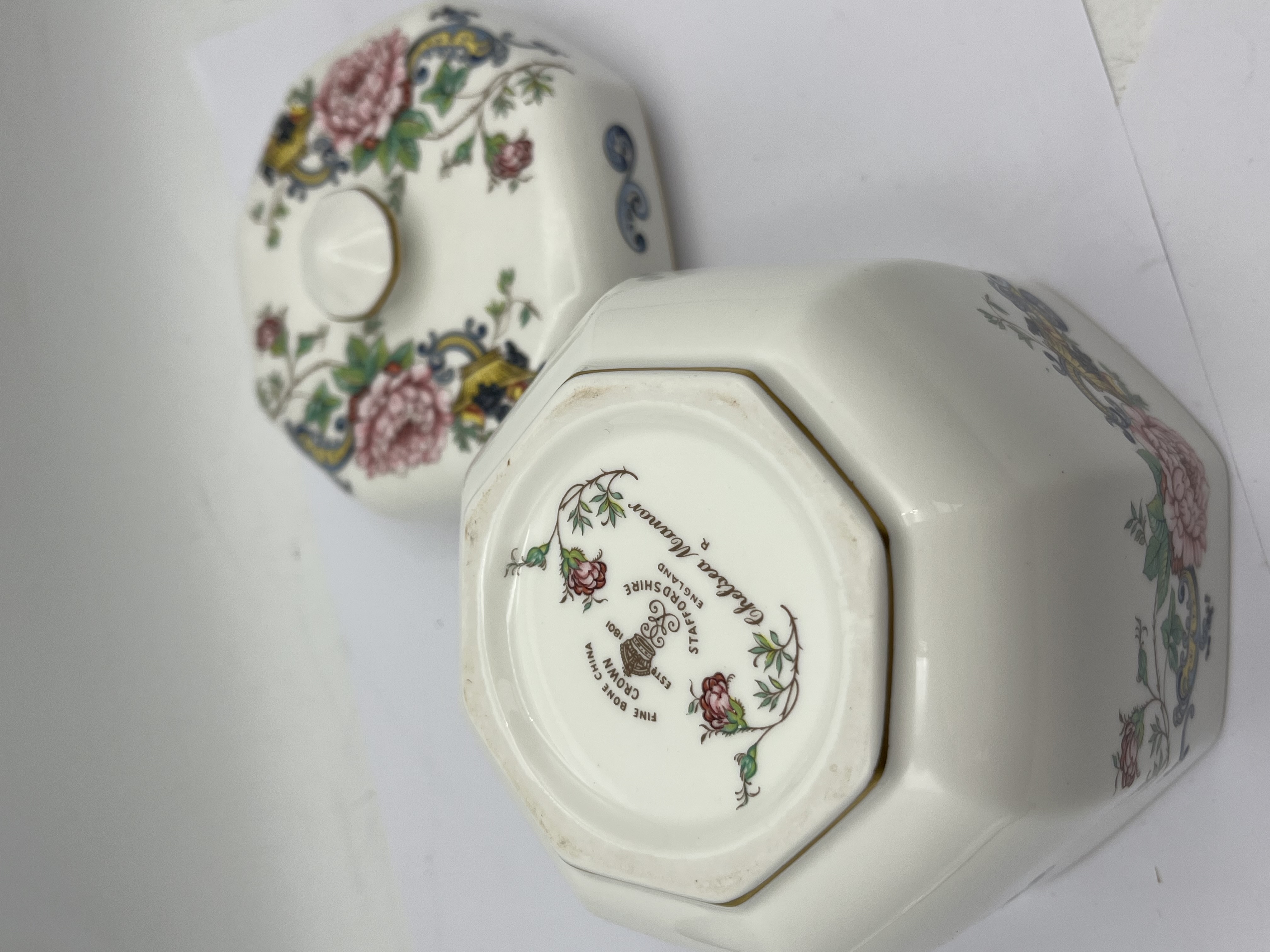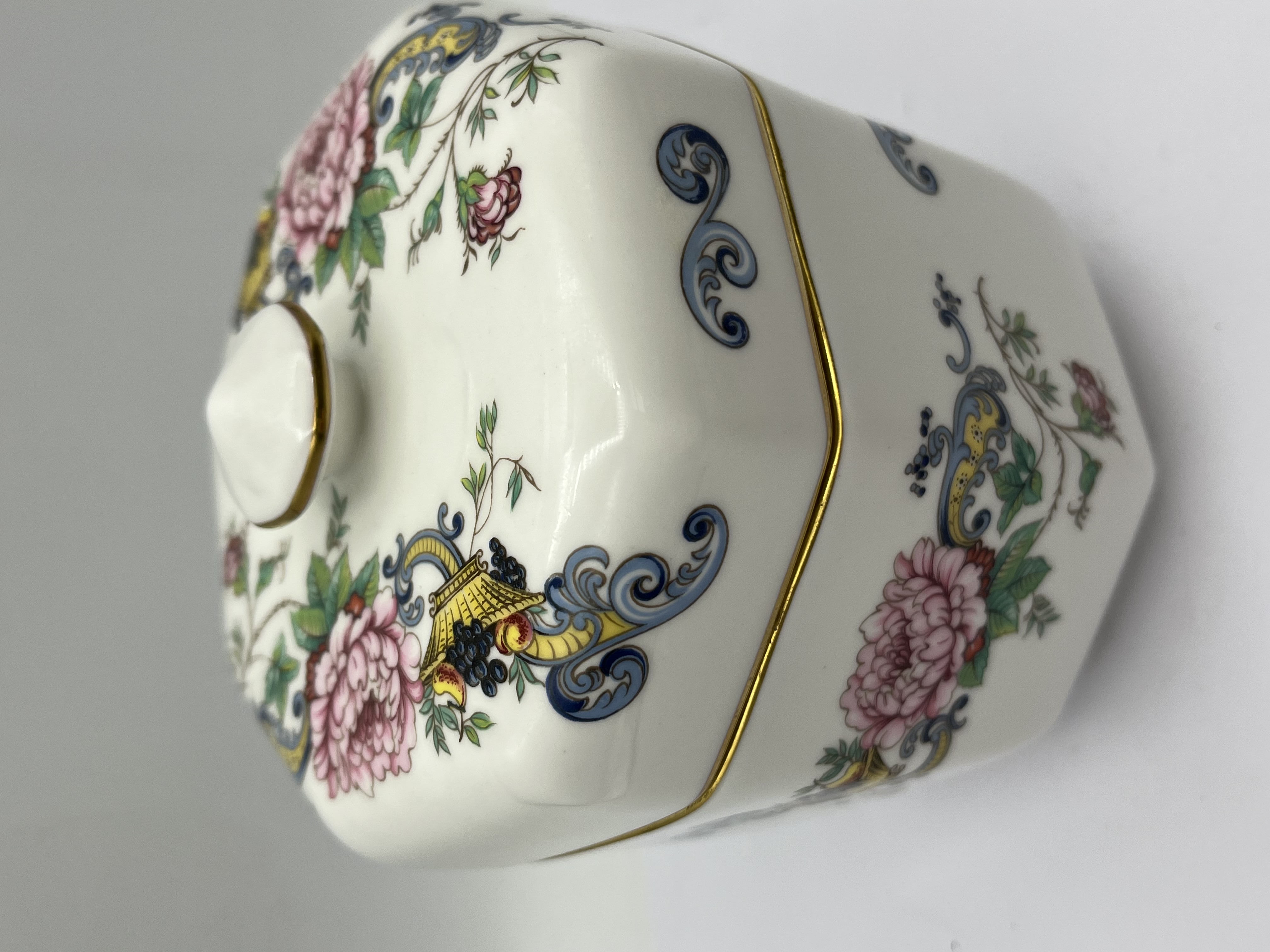 A Crown Staffordshire ‘Chelsea Manor’ octagonal lidded jar, crafted from fine bone china. The piece features a polychrome floral and avian decorative motif in a traditional style, displaying large pink flowers, smaller red blooms, green foliage, blue scrollwork, and yellow bird-like elements, all set against a white ground. Gold trim highlights the rim of the lid, the opening of the box, and the pointed finial. The base bears a backstamp that reads “FINE BONE CHINA EST. 1801 CROWN STAFFORDSHIRE ENGLAND” along with the pattern name “Chelsea Manor” and a small “R” mark.
