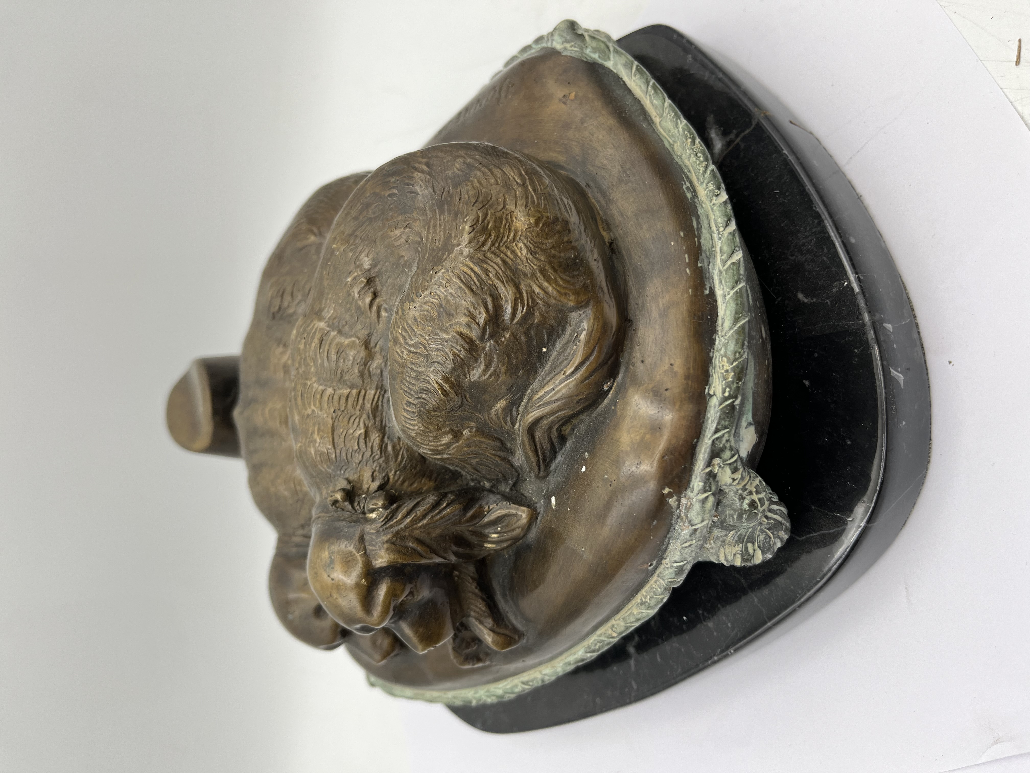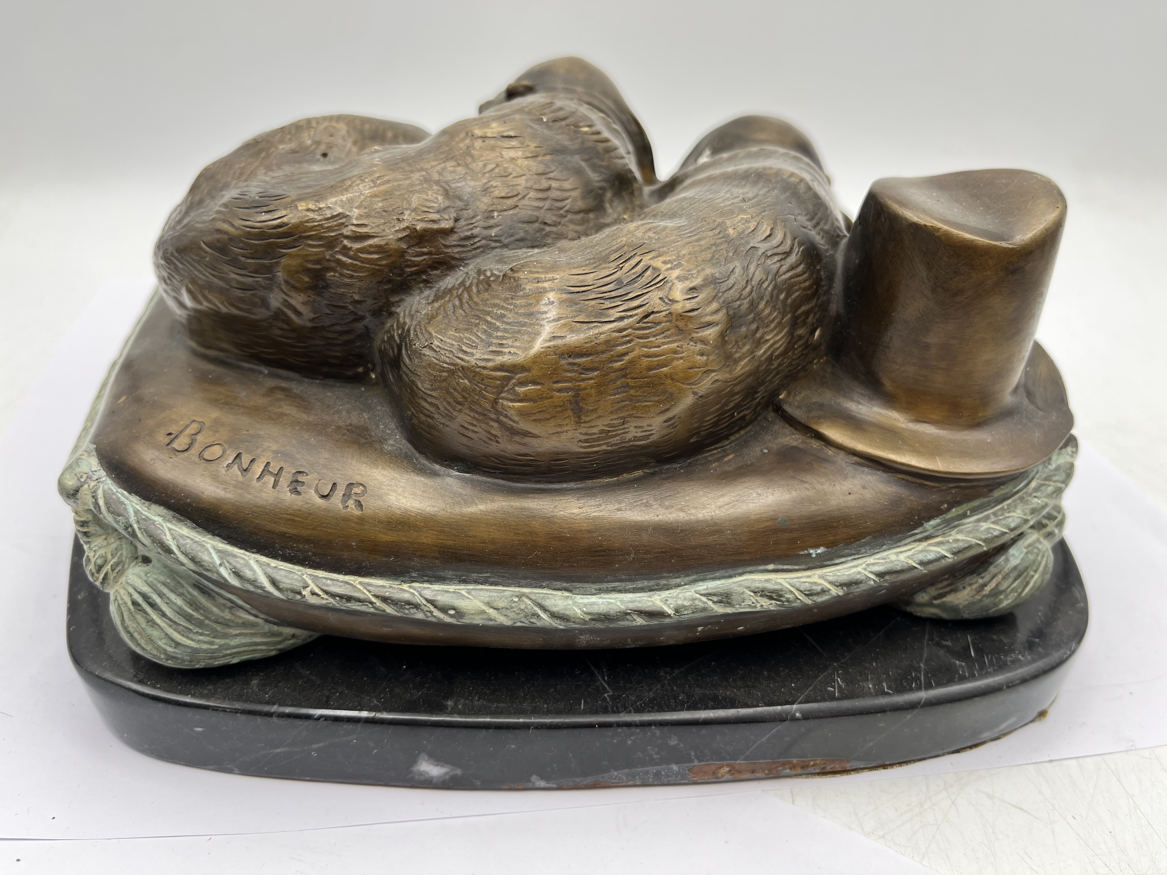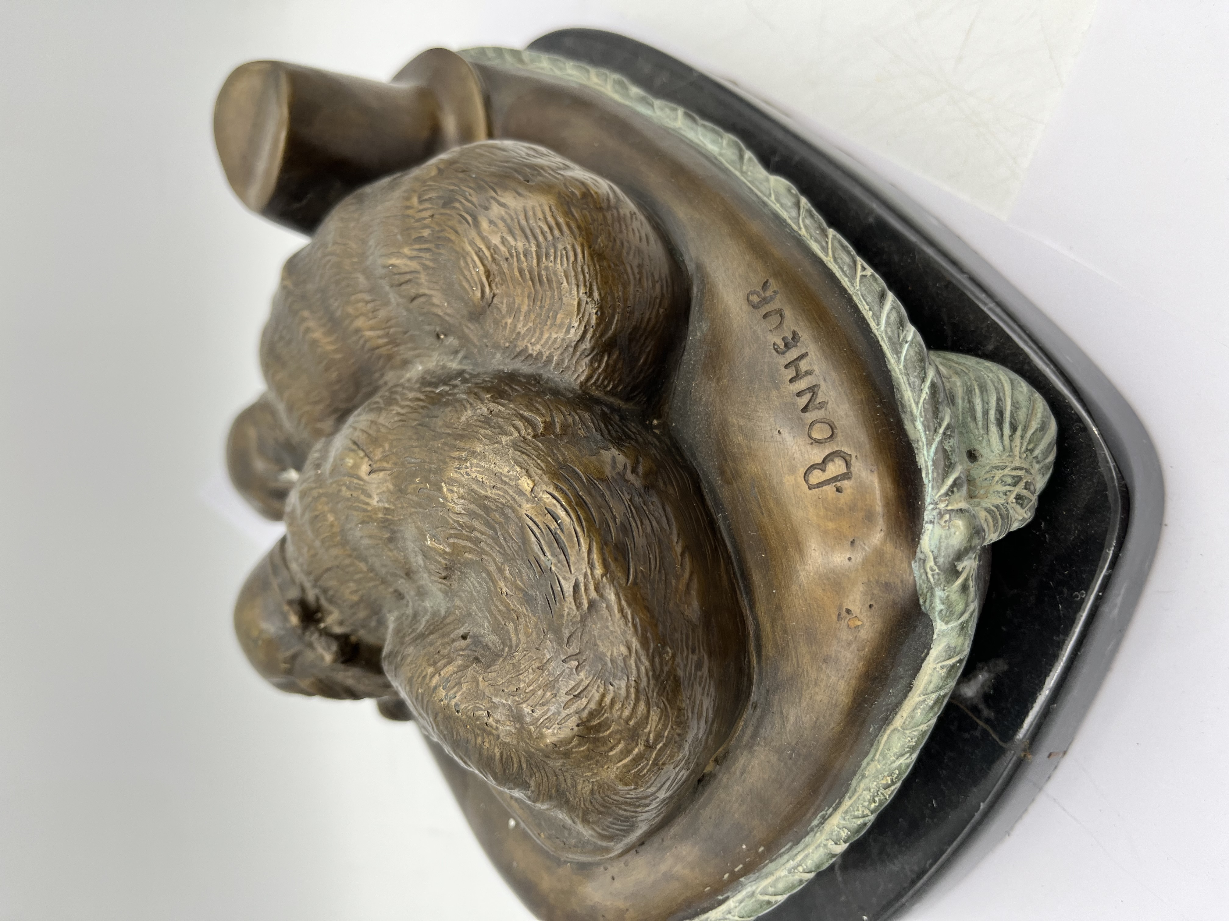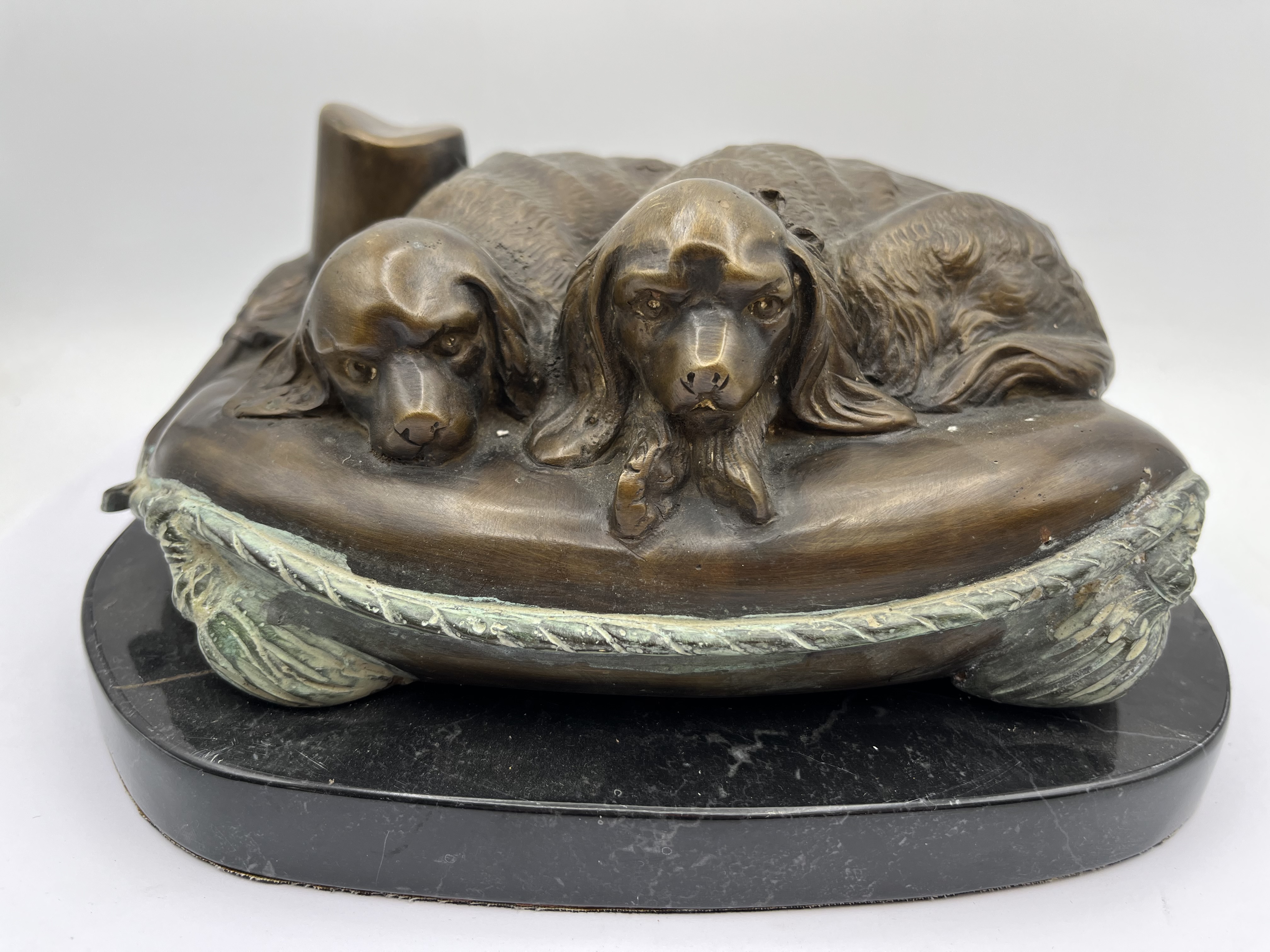 A French cast bronze sculpture by Isidore Jules Bonheur, depicting two dogs resting closely together on a textured cushion. Executed in a realistic, sentimental animalier style, characteristic of the late 19th to early 20th century, the piece features a dark, reddish-brown patination with areas of visible greenish verdigris, particularly along the cushion’s rope-like border. The word “BONHEUR” is incised on the back of the cushion. It is firmly mounted on a polished black marble base. Likely intended as a bookend.
