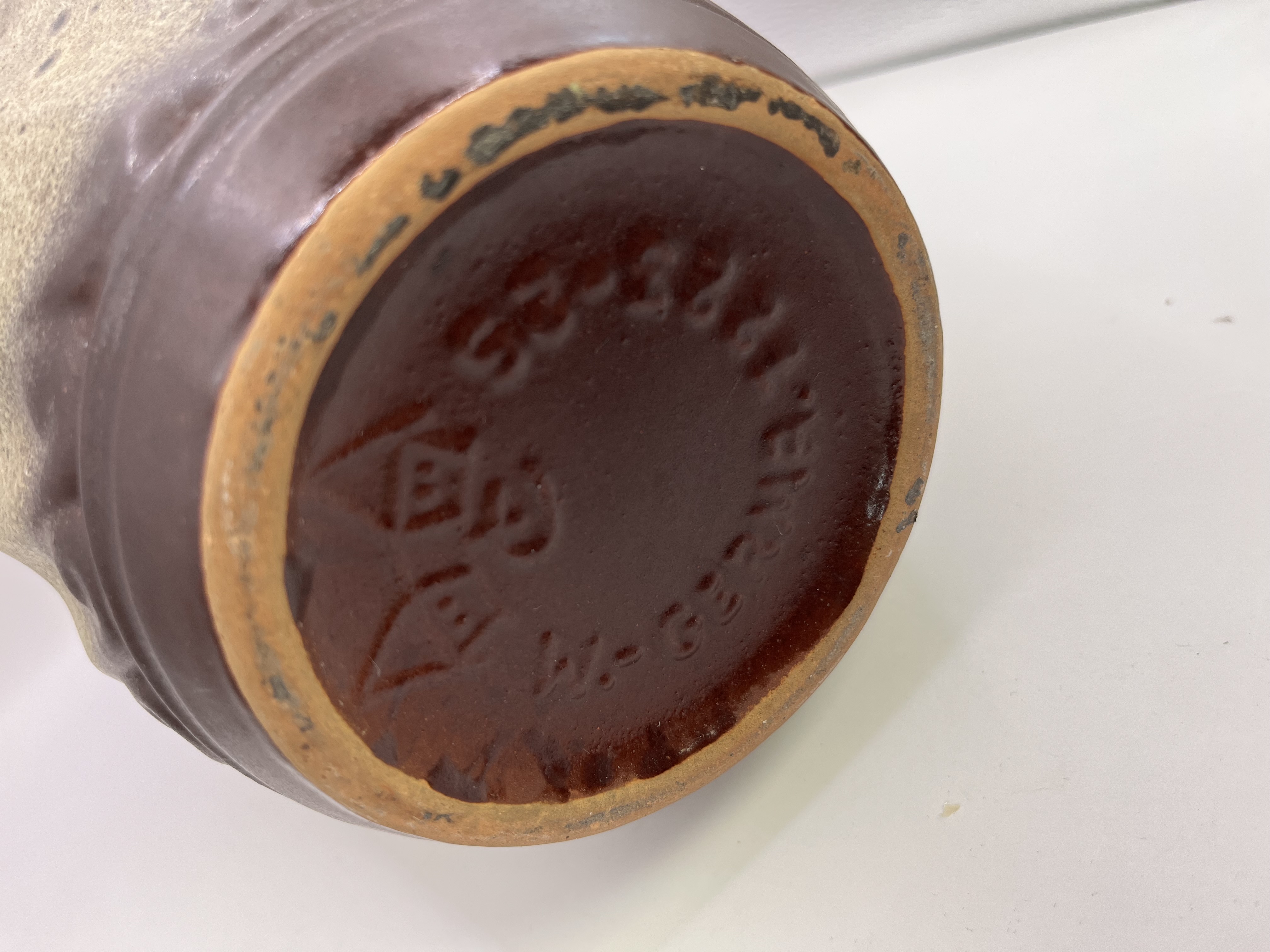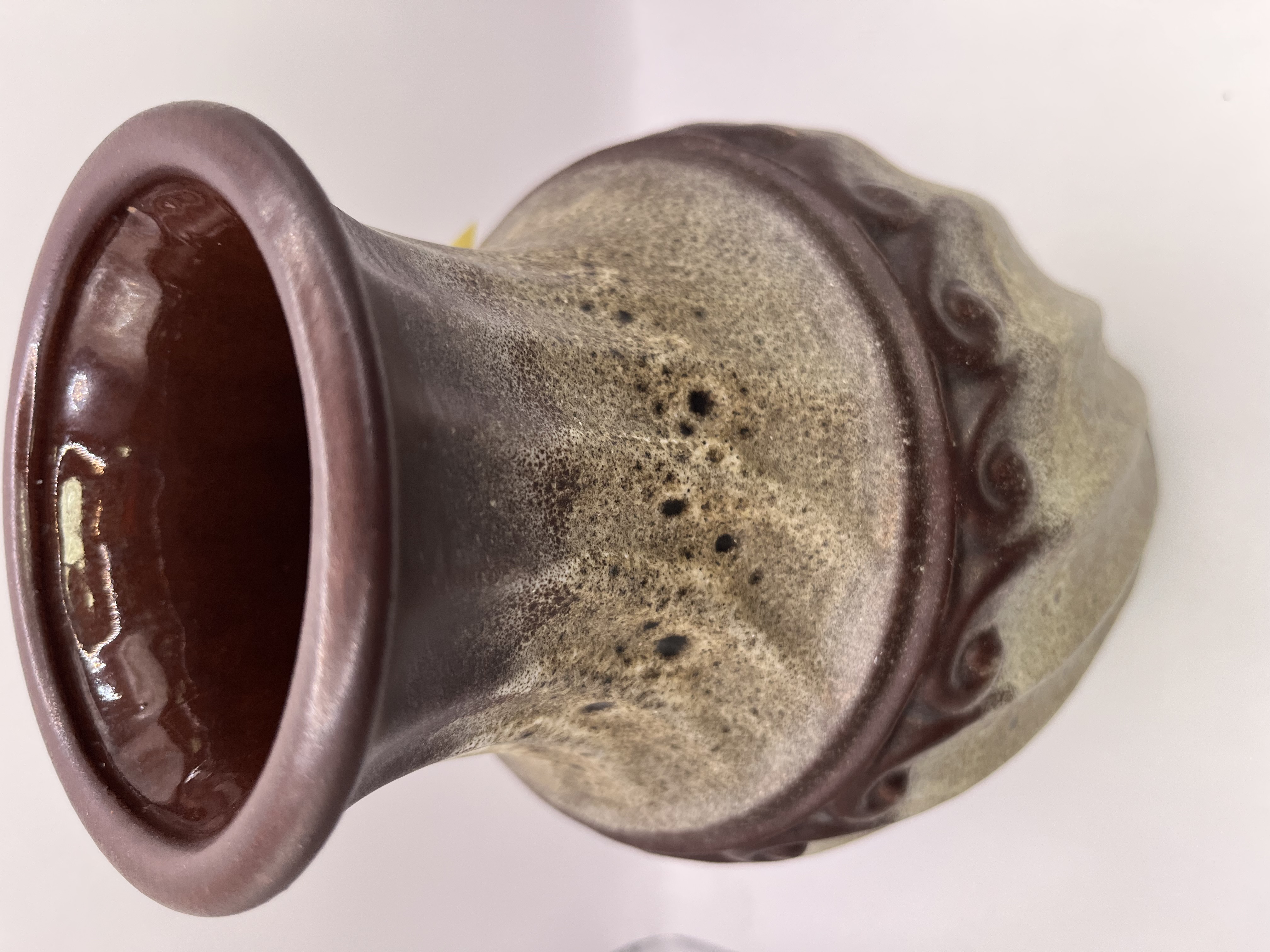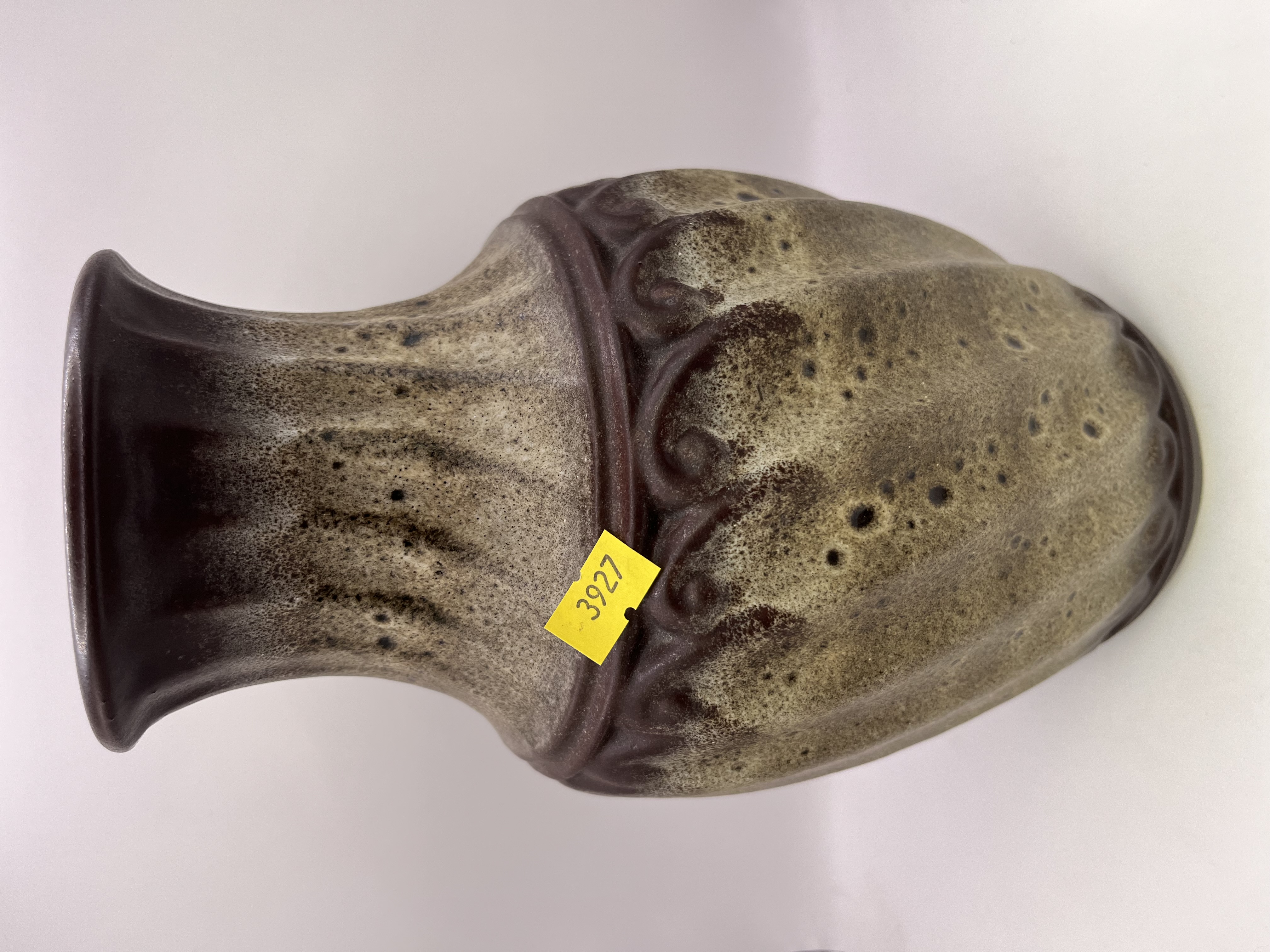 A Bay Keramik German art pottery vase, dating to circa mid-20th century. The ceramic vase features a tall, ovoid form with a flared rim and constricted neck. The body is fluted or swirled, tapering towards the base. It is glazed in a transitional style, with a dark brown glaze on the rim, neck, and a decorative band around the upper body. This band exhibits a subtle relief pattern. The main body is finished with a mottled, speckled beige and light brown glaze. The base is impressed with ‘BAY’ and ‘GERMANY’, along with numerical markings ’51’ and ’20’. A yellow sticker displaying ‘3927’ is affixed to the side.