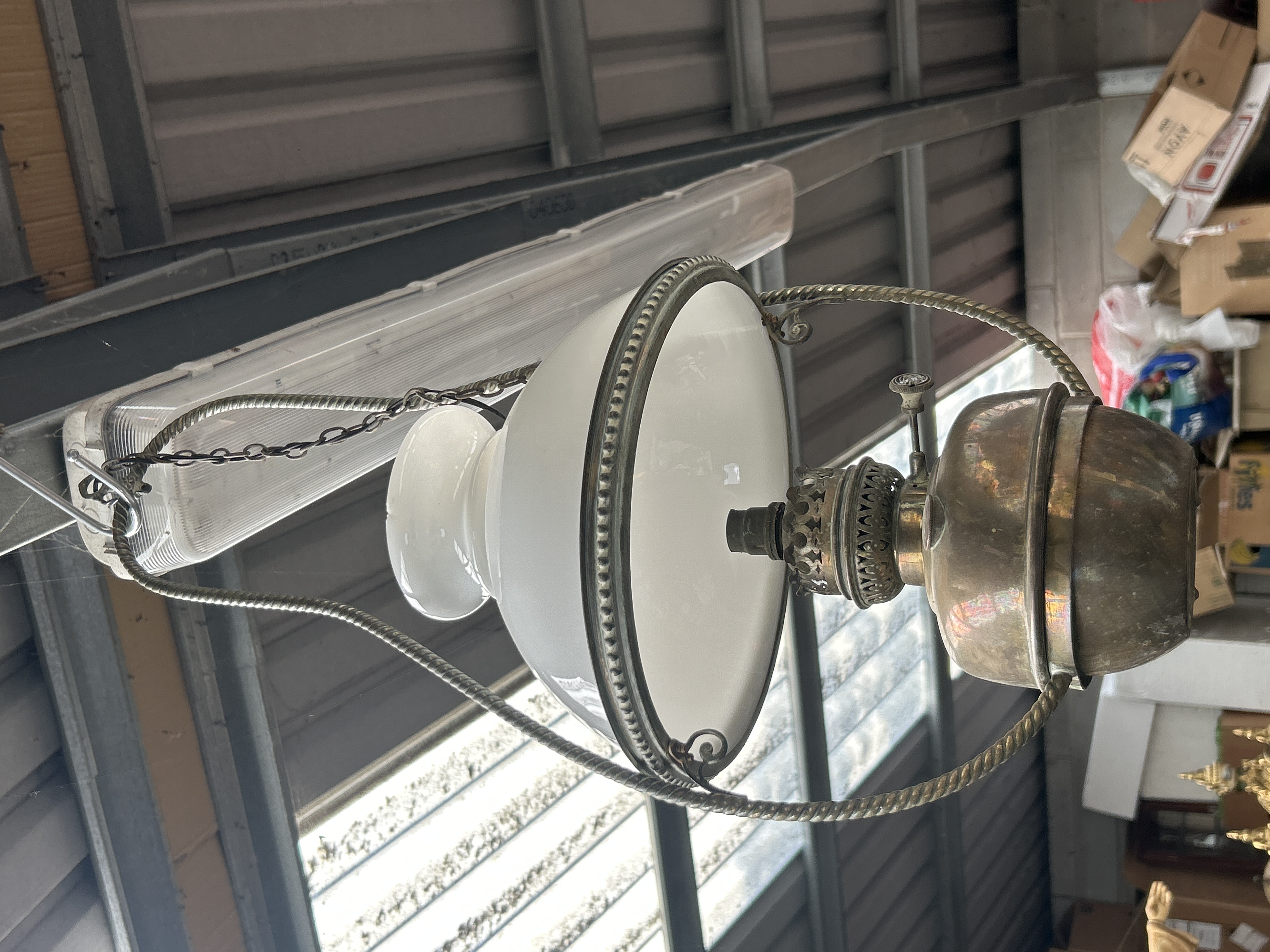 A hanging kerosene or oil lamp, dating to the late 19th or early 20th century. The lamp features a white opaque glass shade, often referred to as opaline or milk glass, with a decorative beaded metal rim. It is suspended by a twisted metal frame attached to a metal chain. The fuel reservoir and burner mechanism are crafted from what appears to be tarnished brass or bronzed metal, featuring intricate openwork patterns around the burner. No clear manufacturer’s marks or legible text are visible.