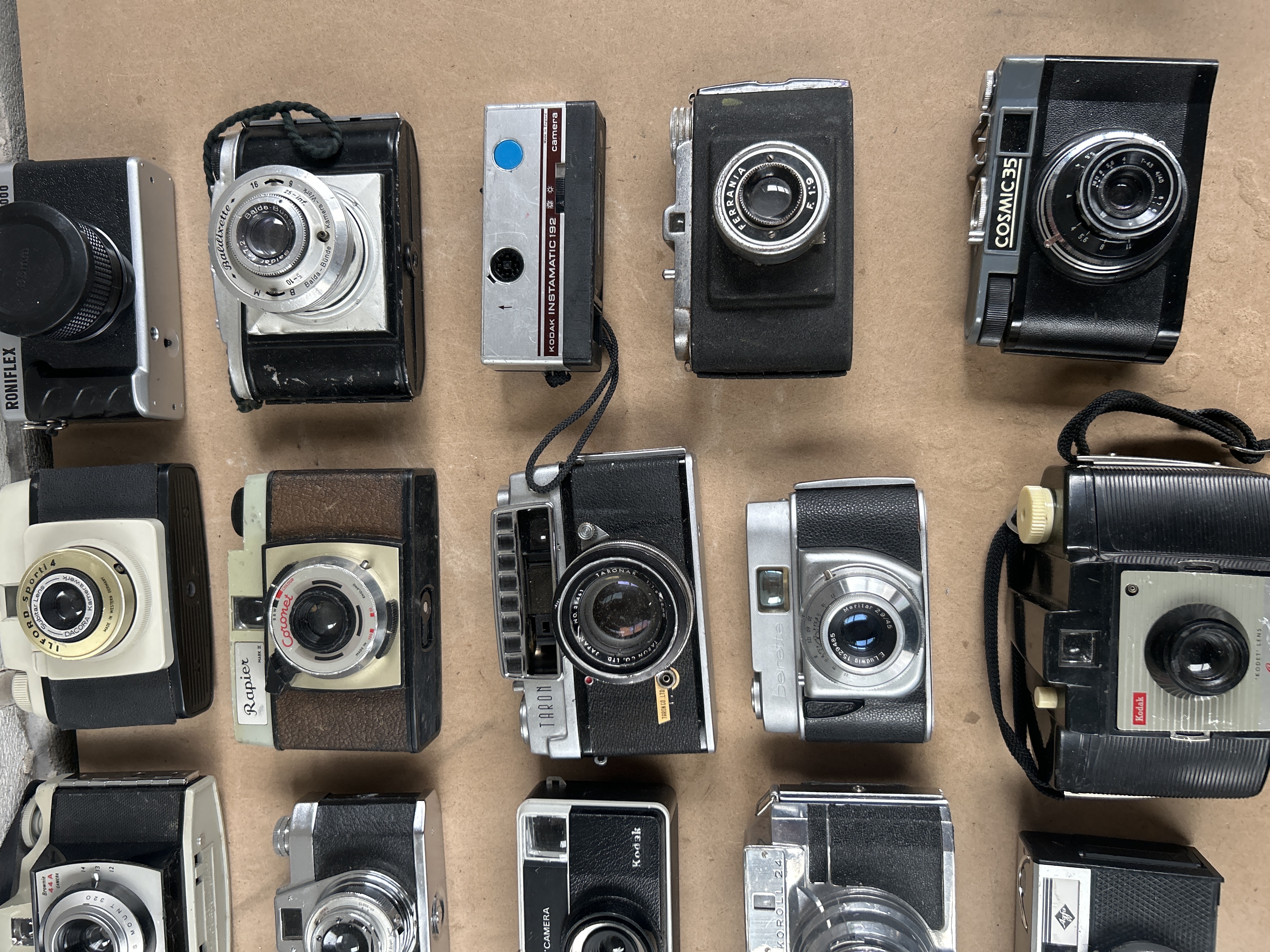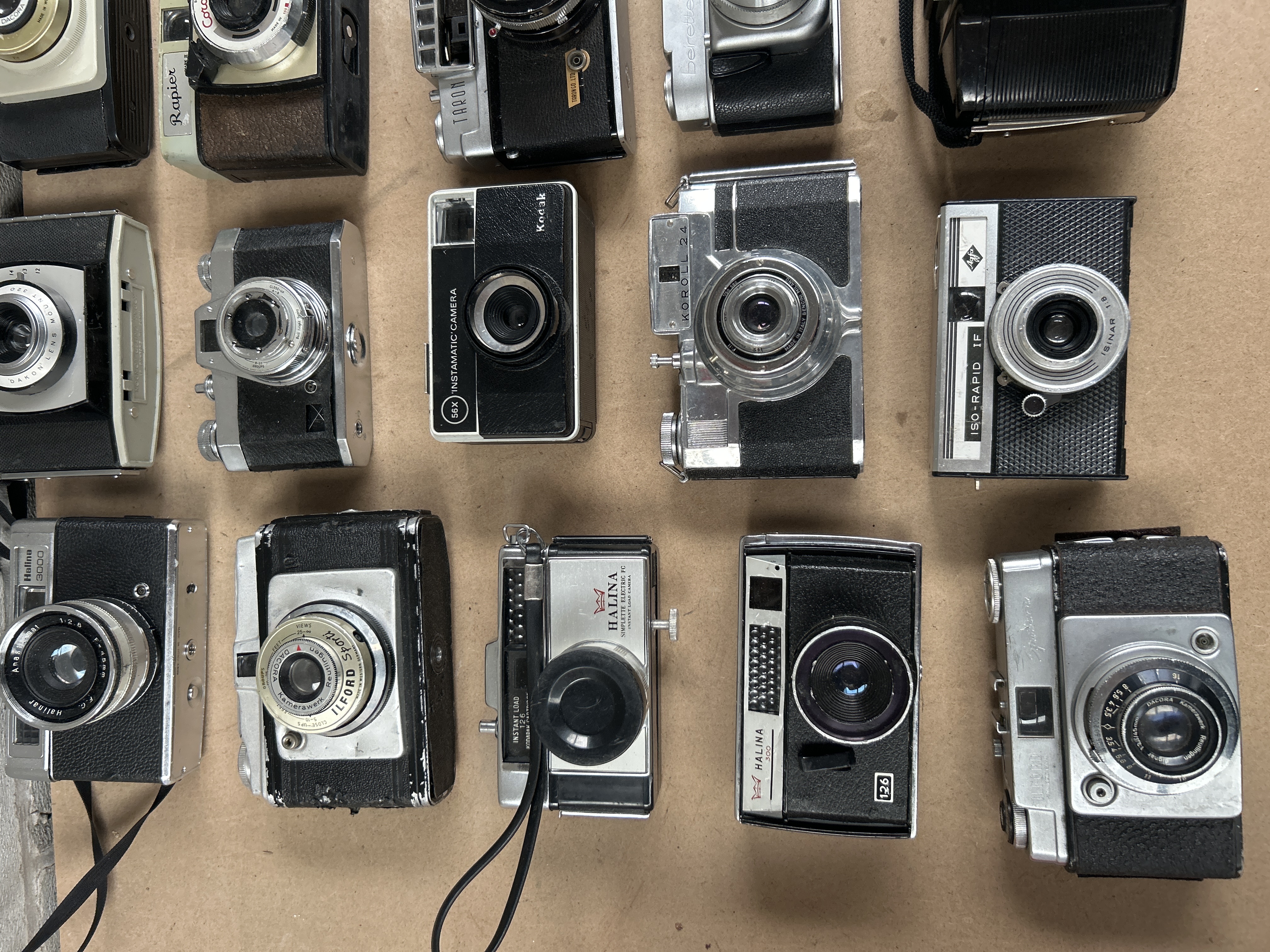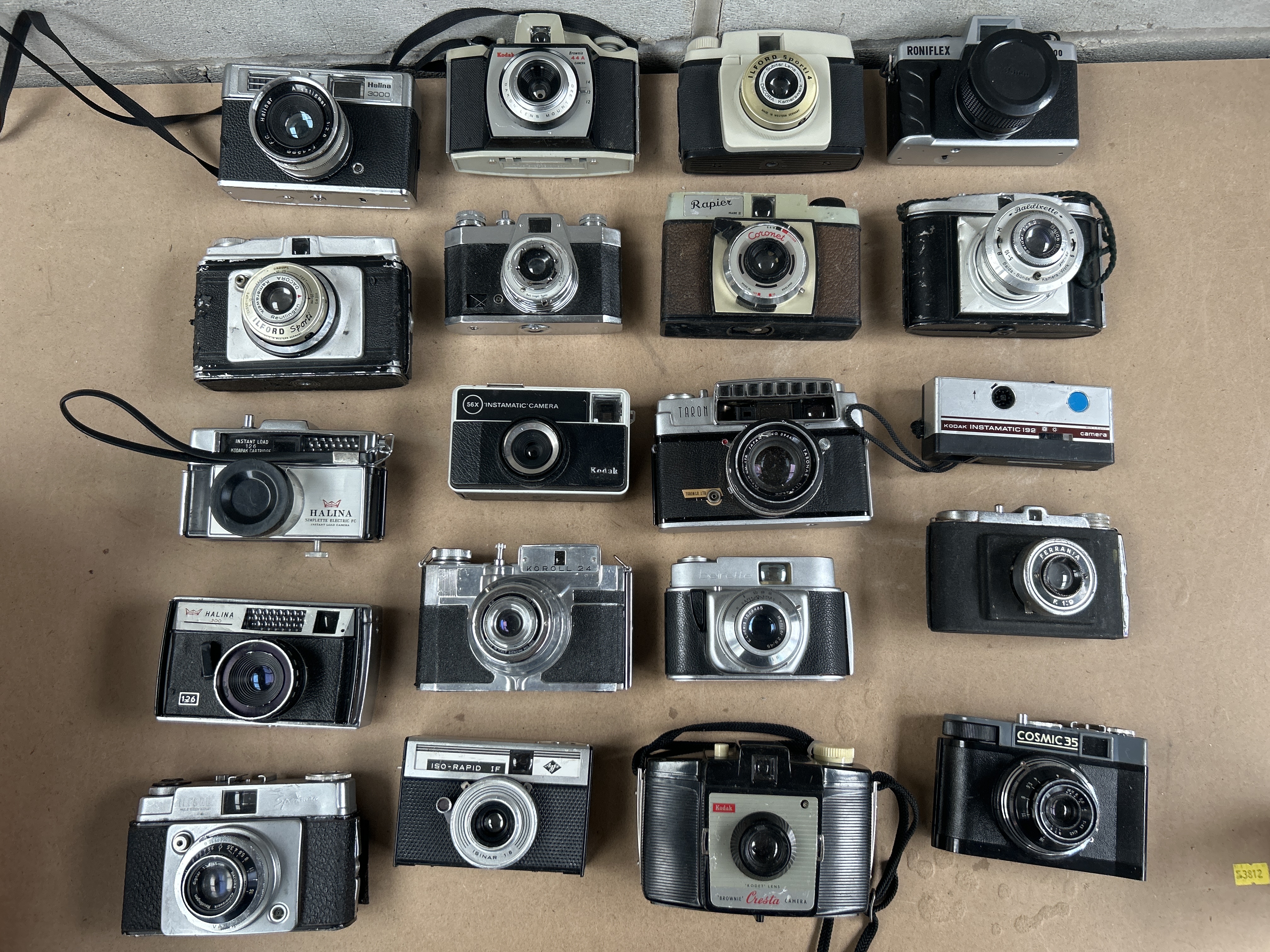 A collection of approximately 24 vintage film cameras, predominantly compact fixed-lens 35mm and Instamatic models, dating primarily from the mid-20th century, likely spanning the 1950s to 1970s. The cameras feature a variety of designs, from basic point-and-shoot to more advanced rangefinder-style mechanisms, constructed primarily from chrome-plated metal, black plastic, and leatherette or vinyl coverings. Visible brands and models include Kodak Instamatic (e.g., 104, 122, 126, 804, X-30), Halina (e.g., 35X, Automatic, Electra), ILFORD Sporti, Rapier, Coronet, Agfa (Silette, Isola), Roniflex, Cosmic 35, ISO-RAPID IF, Yashica Minister-D, FED 5, and Zorki 4K, often with lens specifications such as ‘f/3.5′ or ’50mm’. Please note: The cameras in this lot are offered untested.