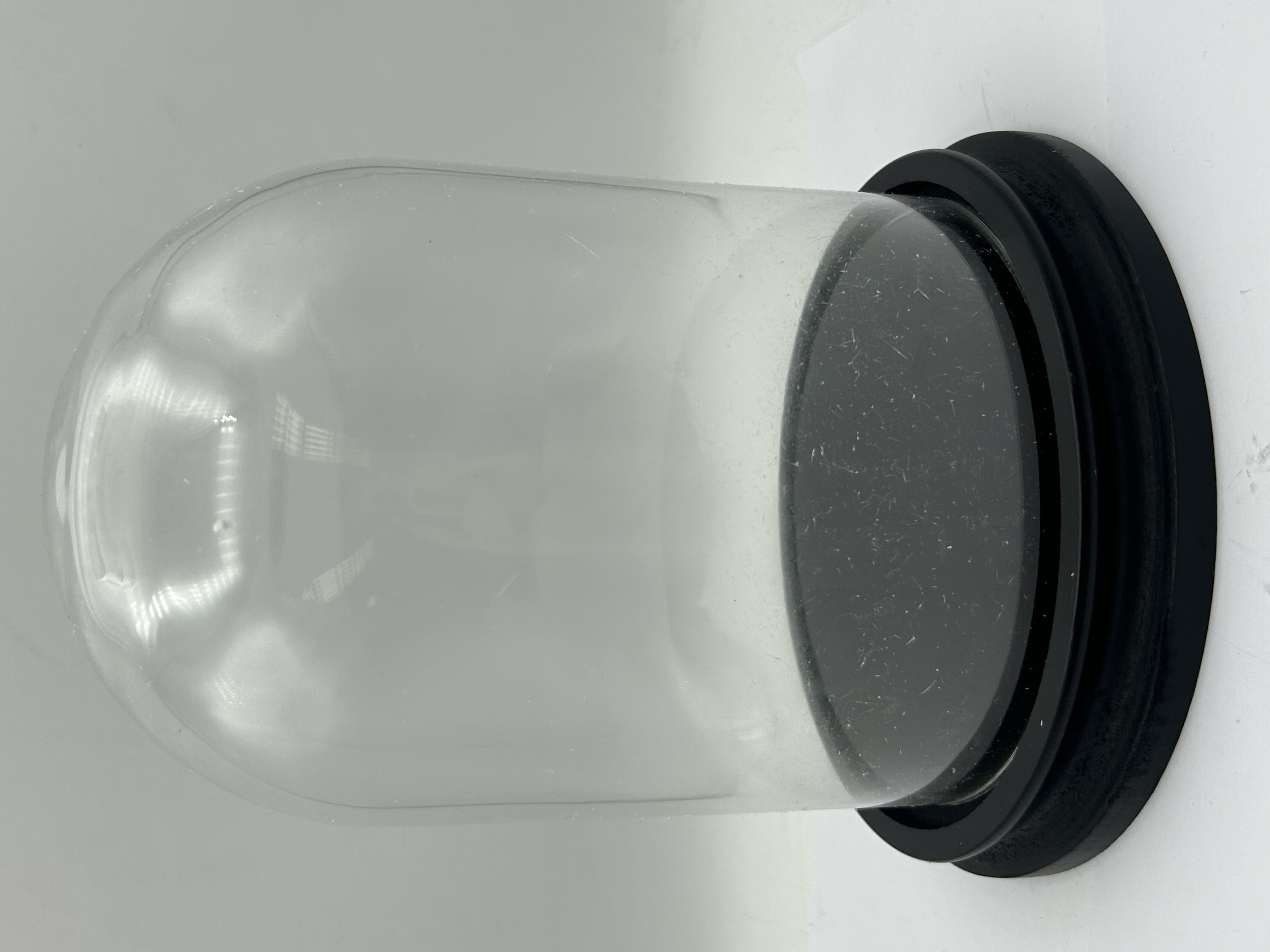 A display cloche comprising a clear, domed glass cover and a round, stepped black-finished base. The base is likely crafted from wood or a composite material. The item presents a simple and utilitarian style, offering no specific indicators of period, and there are no visible textual markings or manufacturer’s stamps.