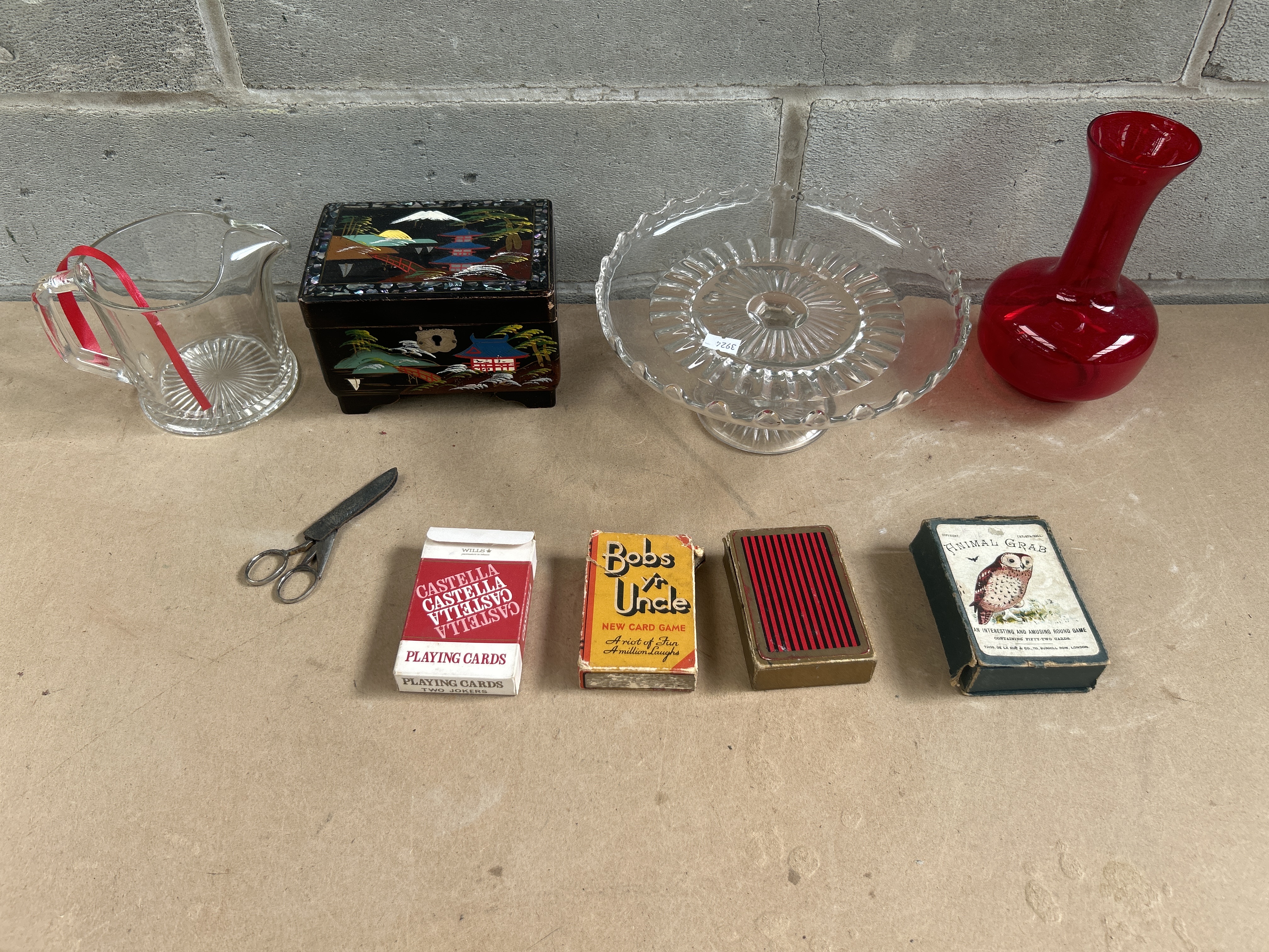 This lot presents a varied collection of vintage decorative and game items. Included is a clear pressed glass pitcher with a red ribbon and a coordinating clear pressed glass cake stand on a pedestal, marked with a “3924” sticker. Also present is a small black lacquered wood box, possibly Japanese, featuring mother-of-pearl inlay depicting an Asian landscape with Mount Fuji, a pagoda, and a bridge. A ruby red art glass vase or small decanter is part of the assortment. Completing the collection are a pair of small metal scissors and four vintage card game items: a red “CASTELLA PLAYING CARDS” box (“Produced in Great Britain, Two Jokers”), a yellow “Bobs Y’r Uncle” New Card Game box (“A riot of fun and laughter”), a rigid gold-toned card box containing red and black striped cards, and a dark green “ANIMAL GRAB” card game box, depicting an owl and stating “An interesting and amusing round game, Containing Fifty-Two Cards, Thos. De La Rue & Co., 110, Bunhill Row, London.”