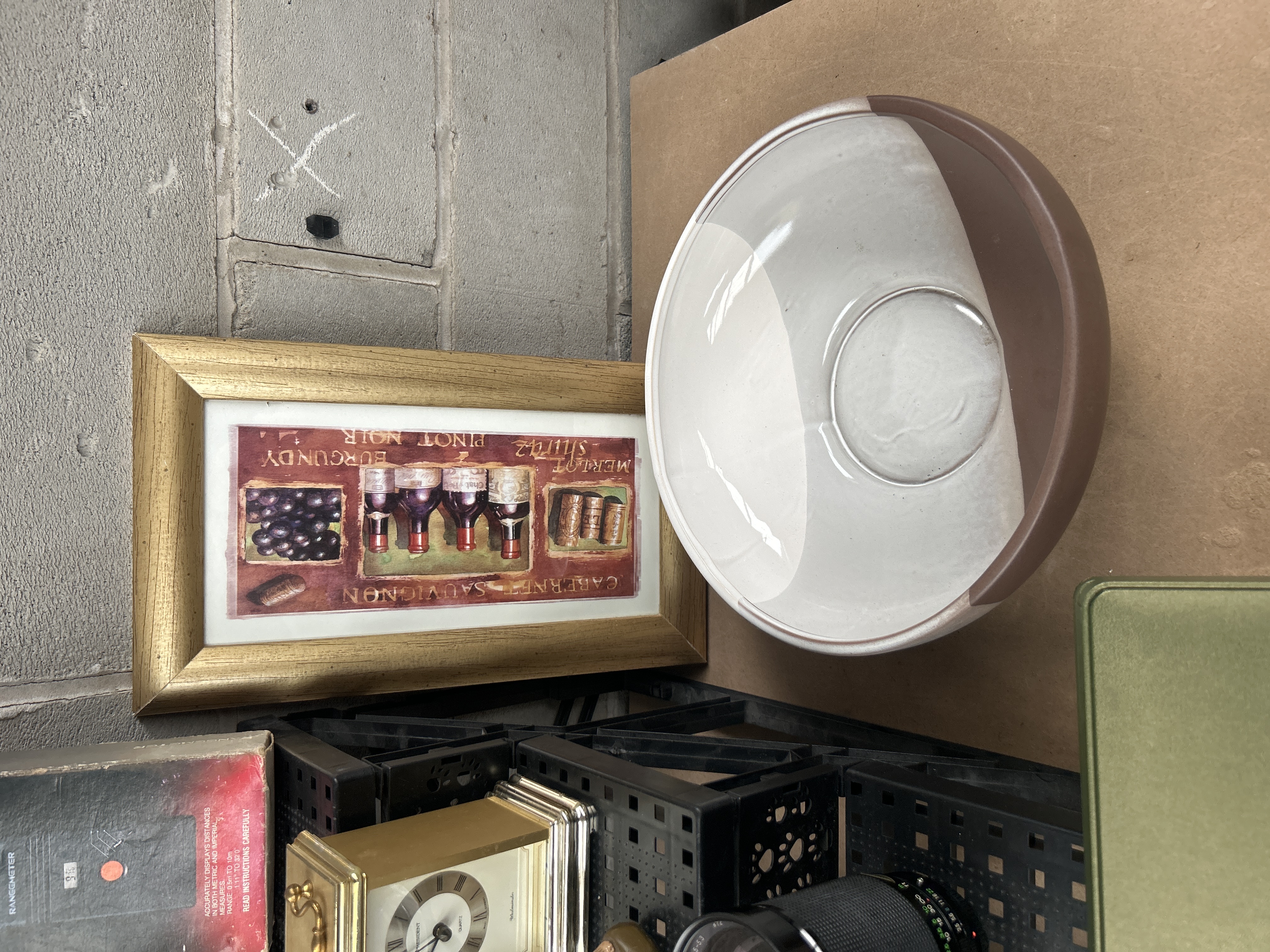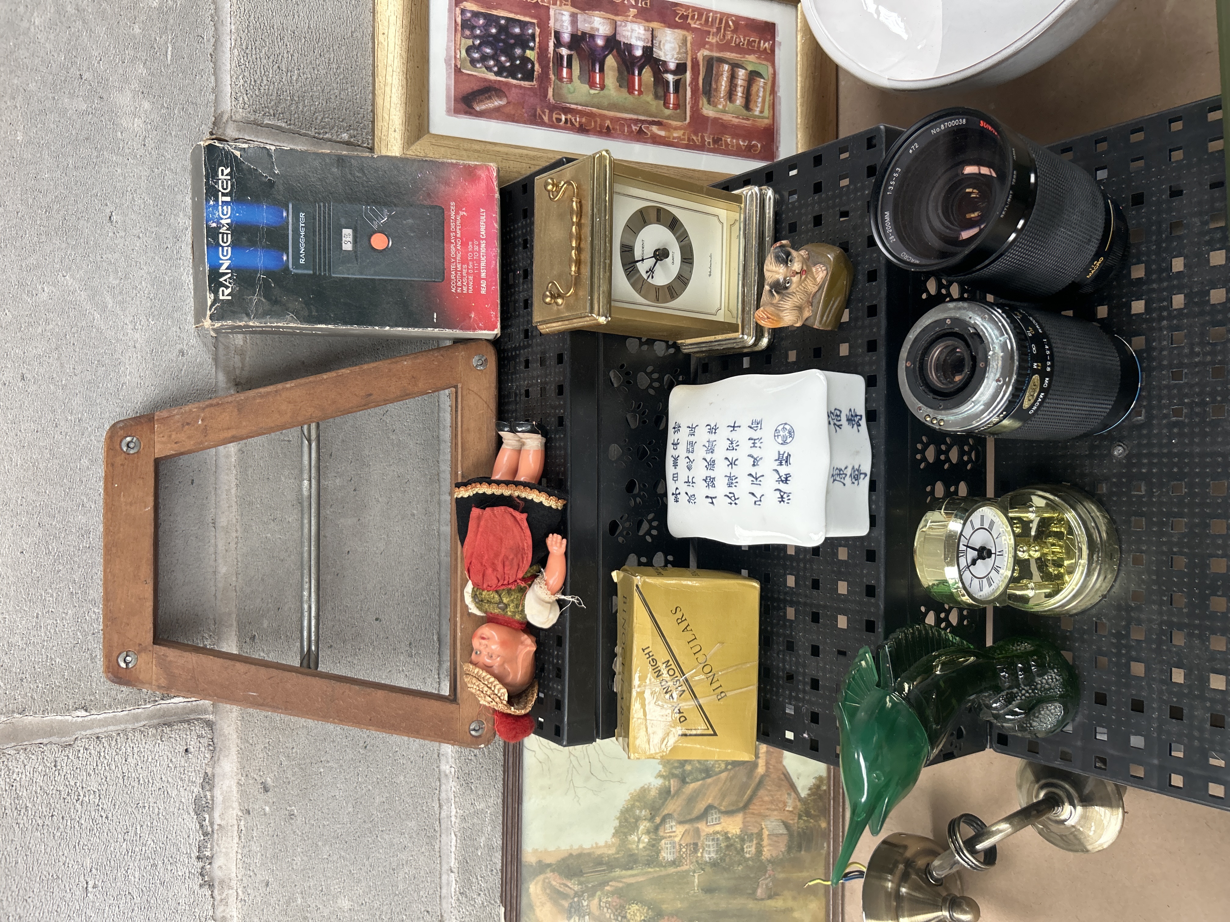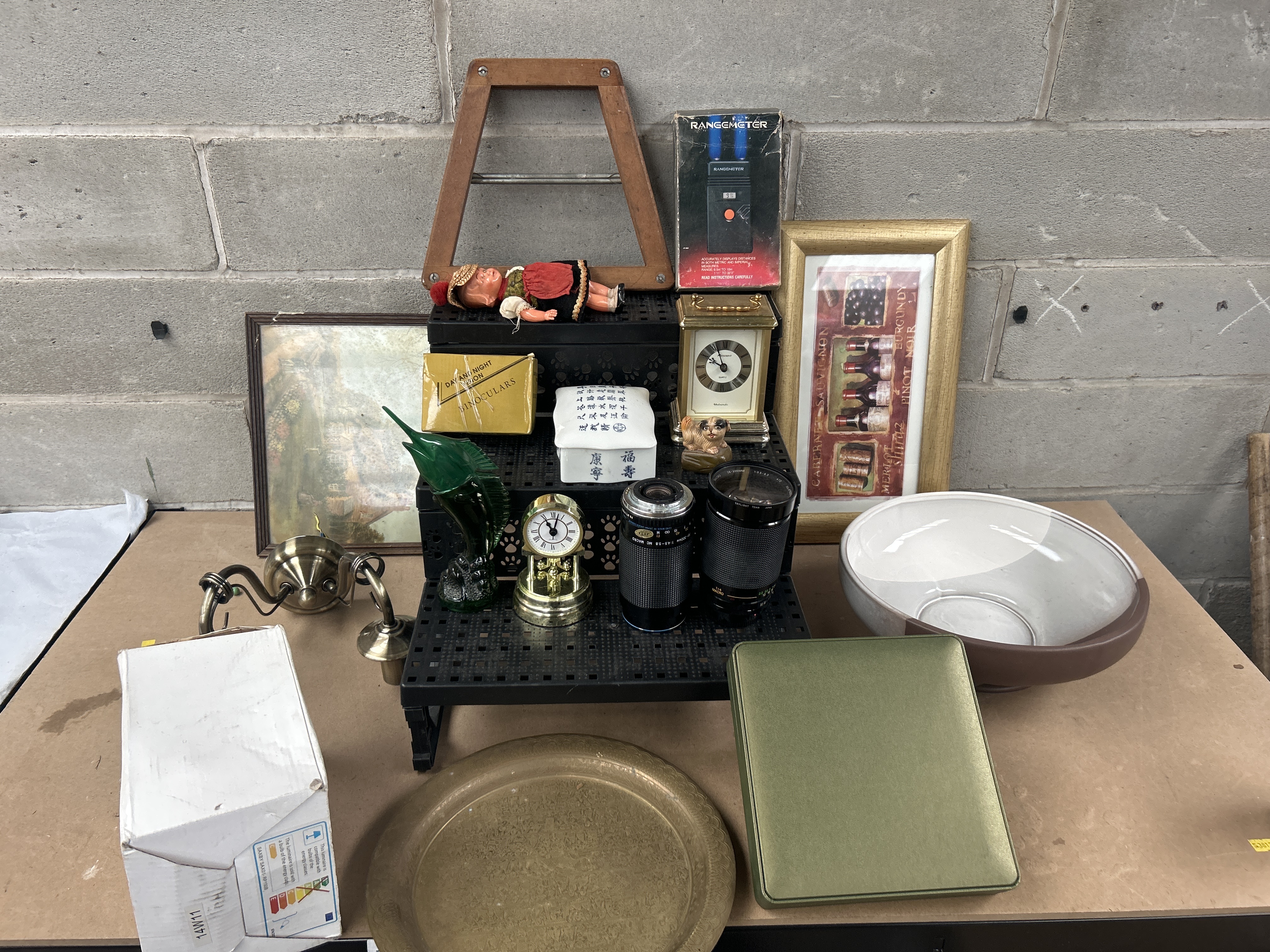This diverse lot features a collection of decorative and functional items presented on a tiered black plastic stand. Notable pieces include a wooden A-frame, a small folk-style doll, and two framed prints—one a pastoral landscape and the other a gold-framed illustration of wine bottles (Cabernet Sauvignon, Merlot, Burgundy, Pinot Noir) and grapes. Packaging for a “RANGEMETER” electronic device and “DAY AND NIGHT VISION BINOCULARS” is present. Decorative objects comprise a small square gold-tone clock with Roman numerals, a similar round “QUARTZ” clock, a ceramic dog figurine, a green glass bird, and a white porcelain box inscribed with Chinese characters translating to “Longevity, Happiness, Health, Peace.” Also visible are two black photographic lenses, one marked “AF NIKKOR 28-80mm,” a large two-tone ceramic bowl (white and brown), a round brass-toned tray, a brass-toned decorative stand, and a green padded rectangular item. A partially visible white cardboard box with “CLAUDE” lettering is in the foreground.