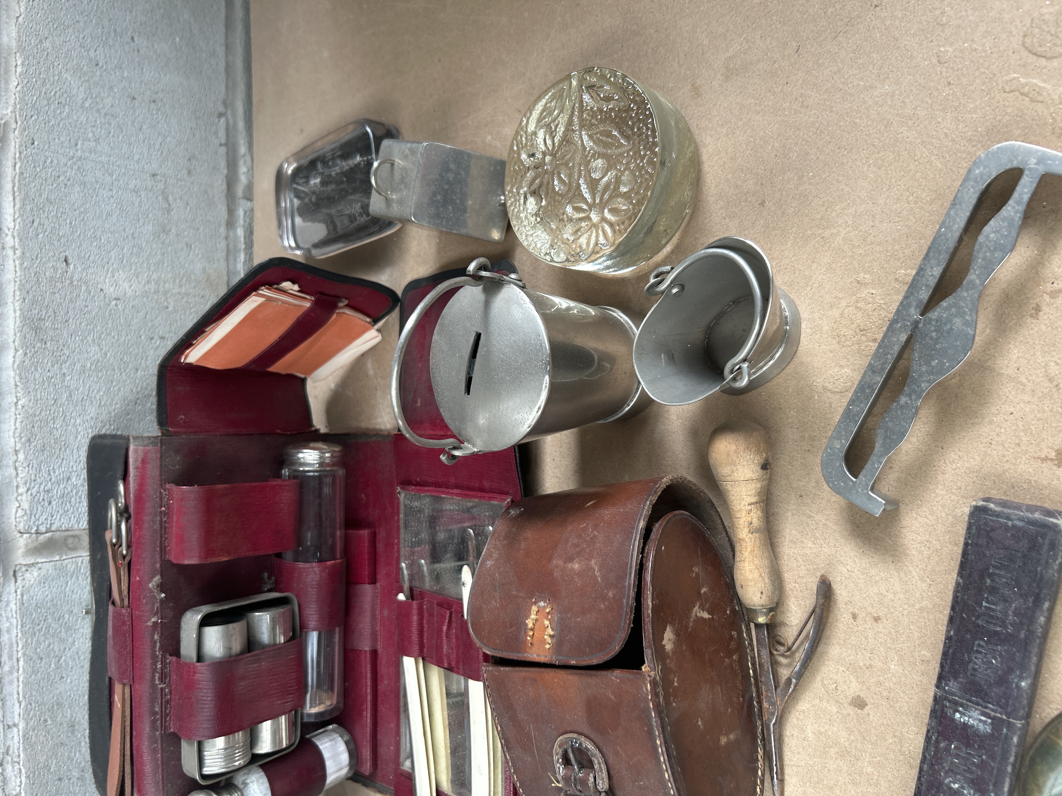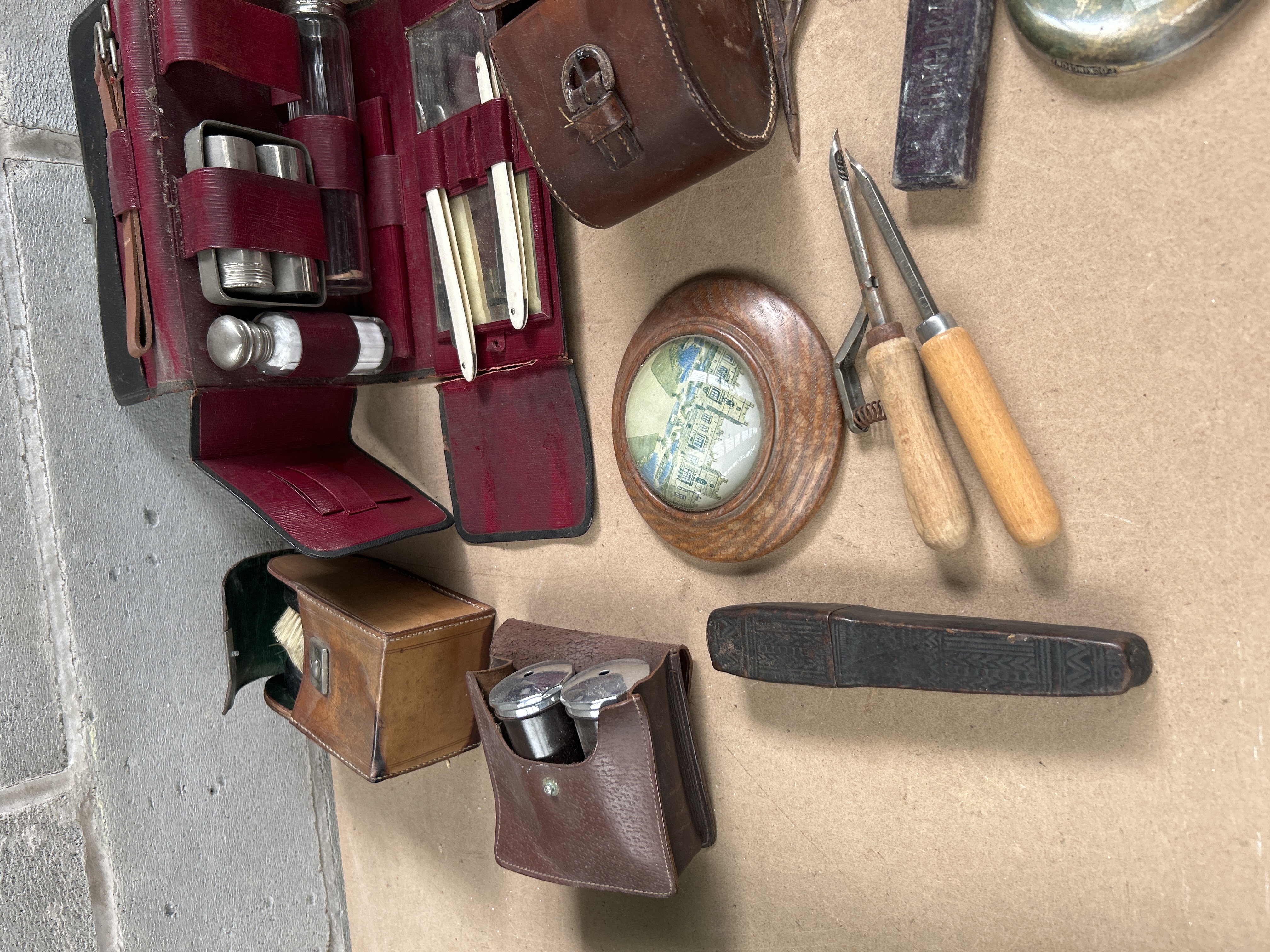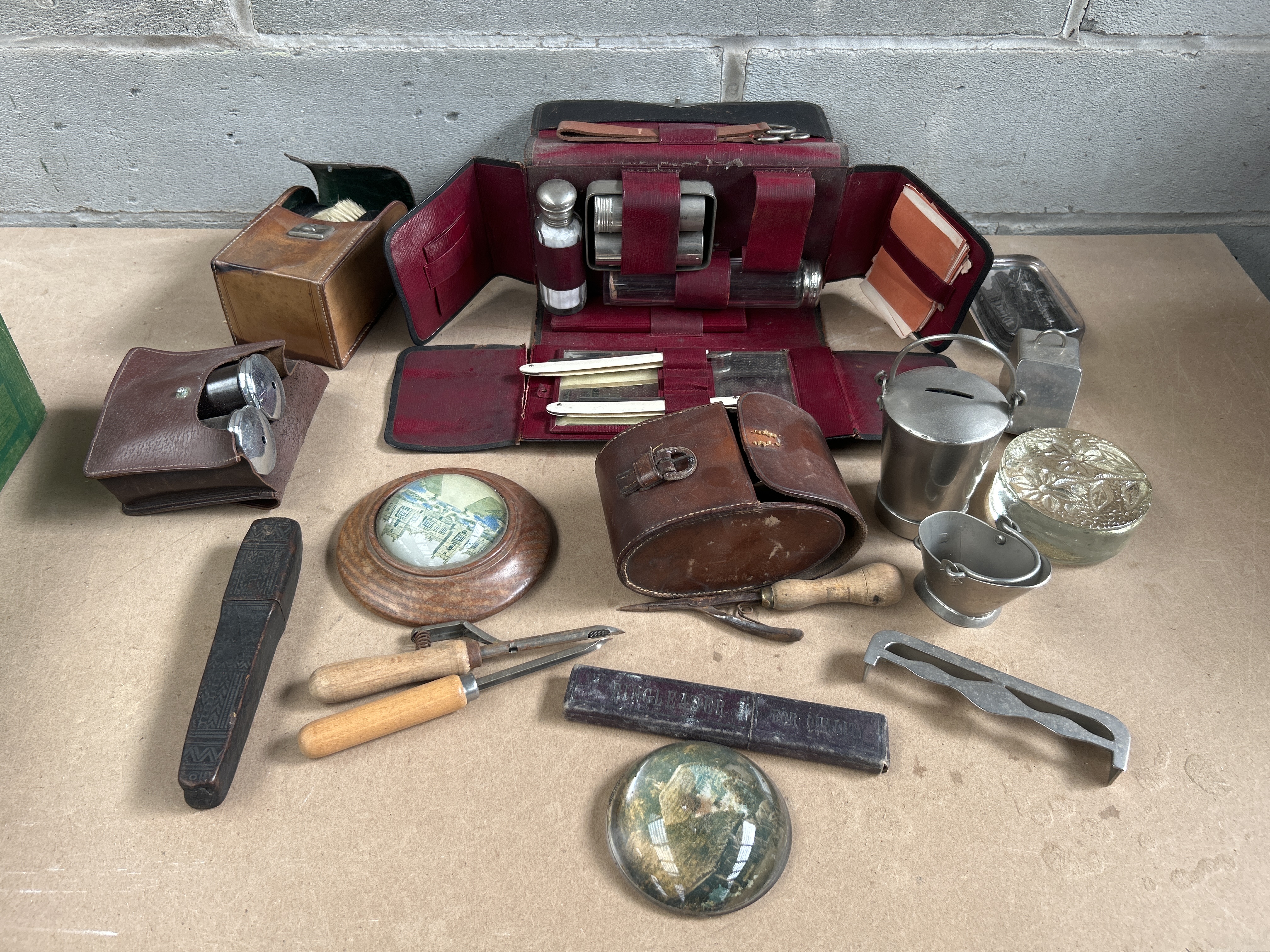 An antique men’s leather travel shaving case, dating to the late 19th or early 20th century, presented alongside a diverse collection of related accessories. The large, open burgundy leather dressing case features a red leather-lined interior, fitted with several glass bottles (some with metal caps), and metal containers, alongside what appear to be straight razors. Accompanying this are various smaller brown leather cases or pouches, one containing a brush, and others with strap or buckle closures. The collection also features assorted silver-toned metalware, including two miniature pails (one with a coin slot), several lidded rectangular and oval containers, and an ornate lidded glass or crystal jar. Additional items include a round wooden plaque with a domed glass covering a miniature landscape print, two small tools with wooden handles, a dark carved wooden object, a dark rectangular block (possibly a strop or sharpening stone), a distinct flat metal tool, and a large glass dome paperweight with an internal design. Materials observed are primarily leather, glass, wood, and silver-toned metal. No legible manufacturer’s marks or translatable text are visible.