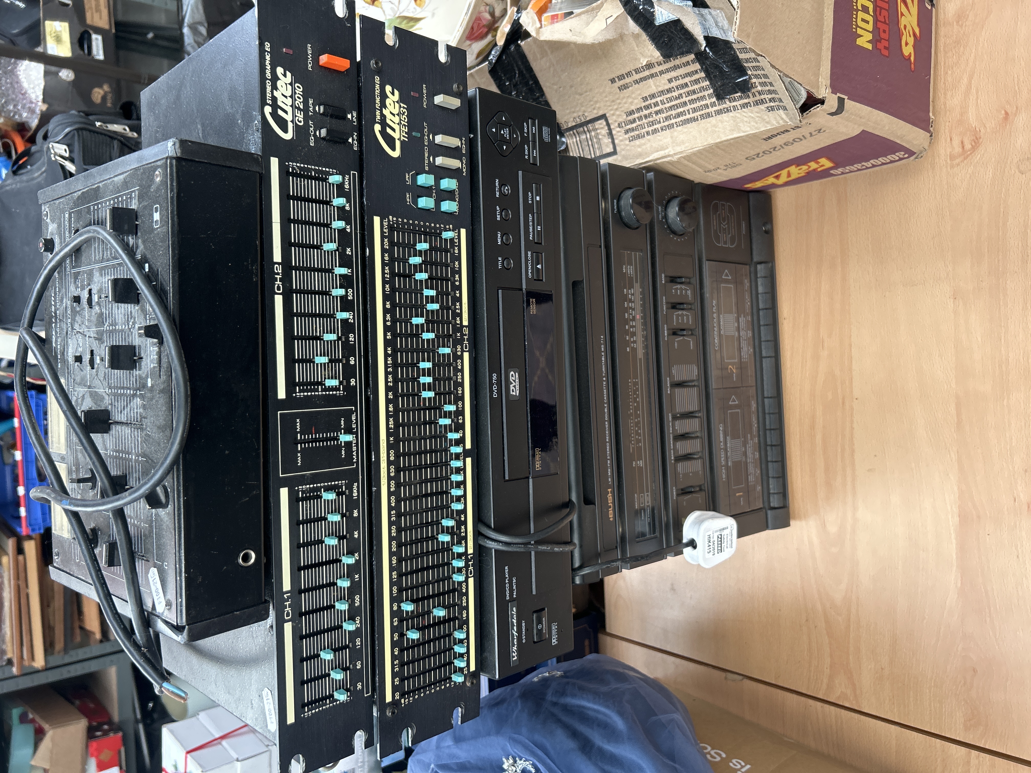 A collection of late 20th to early 21st century audio components, constructed from metal and plastic. The lot comprises a stack of six units, including: a ‘REALISTIC STEREO MIXING CONSOLE’ with a ‘F100-21G’ sticker; a ‘Cutec GE 2010 STEREO GRAPHIC EQ’; a ‘Cutec TFE1531 TWIN FUNCTION EQ’, both Cutec units featuring teal-colored fader caps; a ‘Wharfedale DVD-750 DVD/CD PLAYER’; a ‘BUSH MS-714 LW/MW/FM STEREO RECEIVER DOUBLE CASSETTE & TURNTABLE’ unit; and a partially visible sixth component with ‘TUNING’ and ‘VOLUME’ controls. The equipment’s style reflects typical home and pro-sumer audio gear of its era, with visible text clearly indicating object type and model numbers. A UK-style power plug is visible on one of the cords.