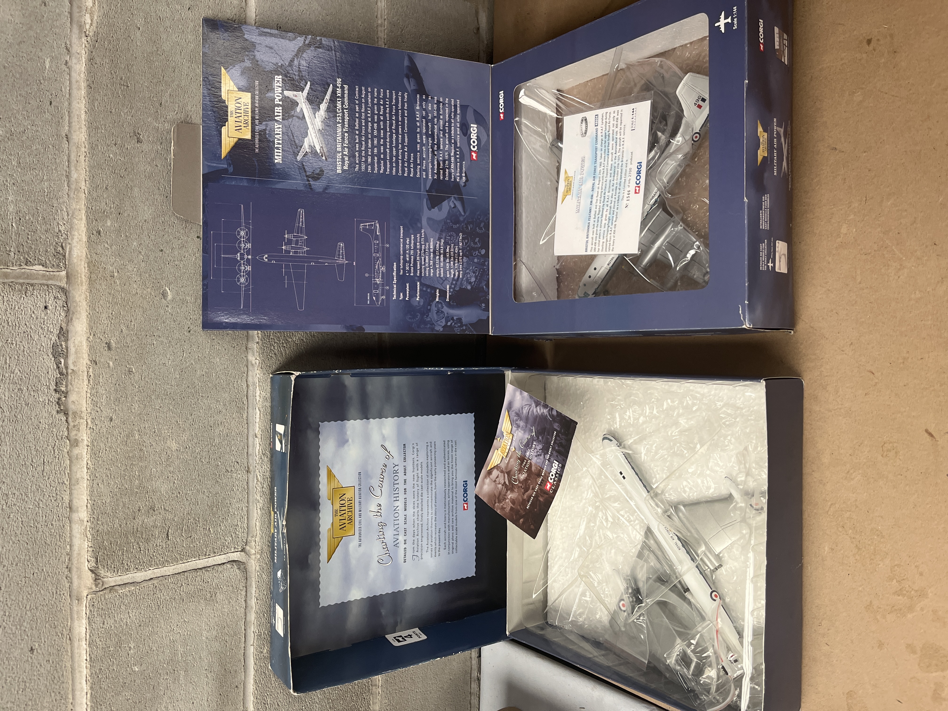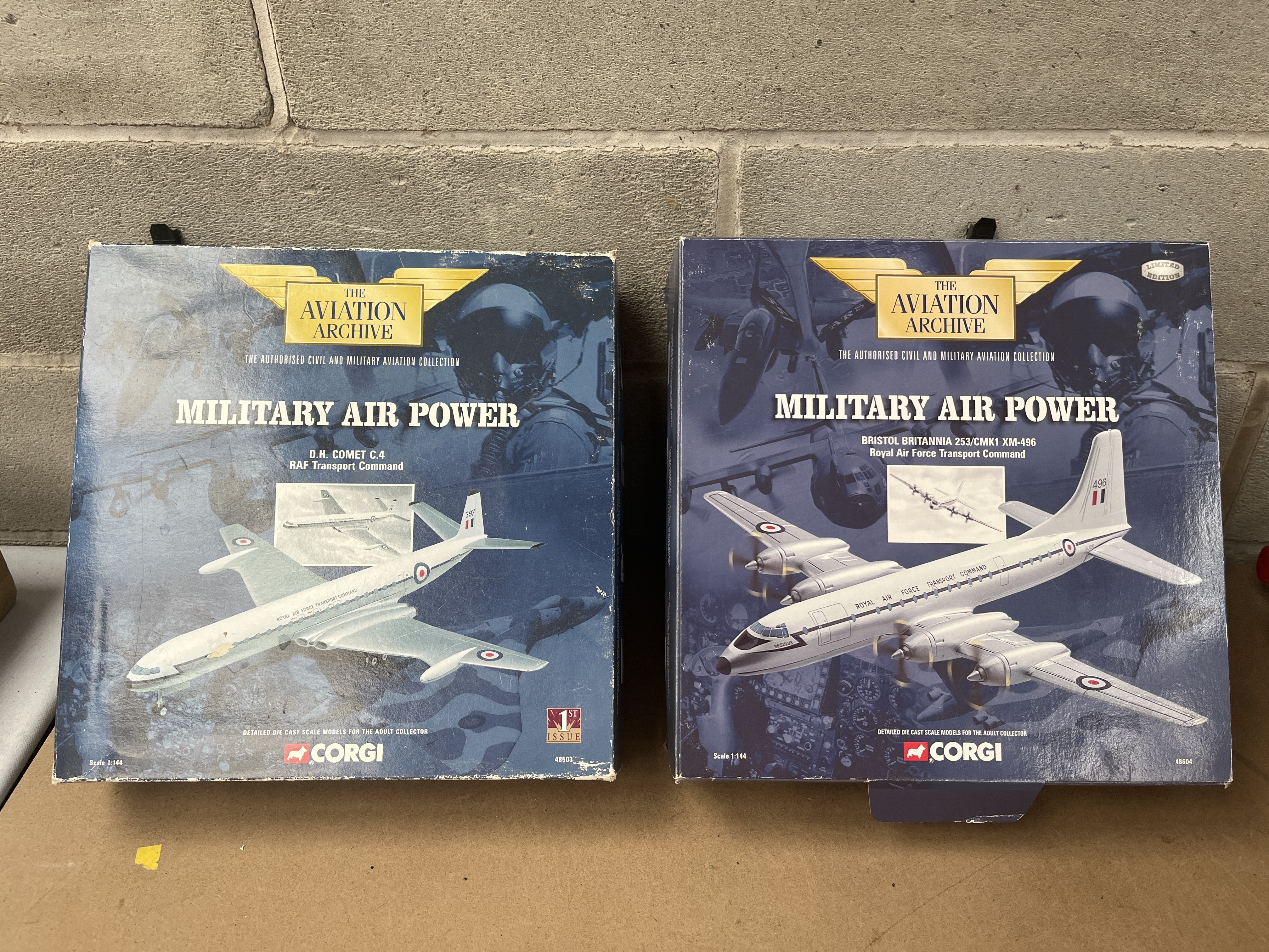 A pair of Corgi ‘The Aviation Archive: Military Air Power’ die-cast scale model aircraft, each at 1:144 scale. The lot comprises a D.H. Comet C.4 of the RAF Transport Command (model 48503) and a Bristol Britannia 253 (C.Mk 1) XM-496 of the Royal Air Force Transport Command. Both models depict mid-20th century military aviation aircraft. Constructed from die-cast metal and/or plastic, the models are presented within their original clear plastic and white foam protective packaging.