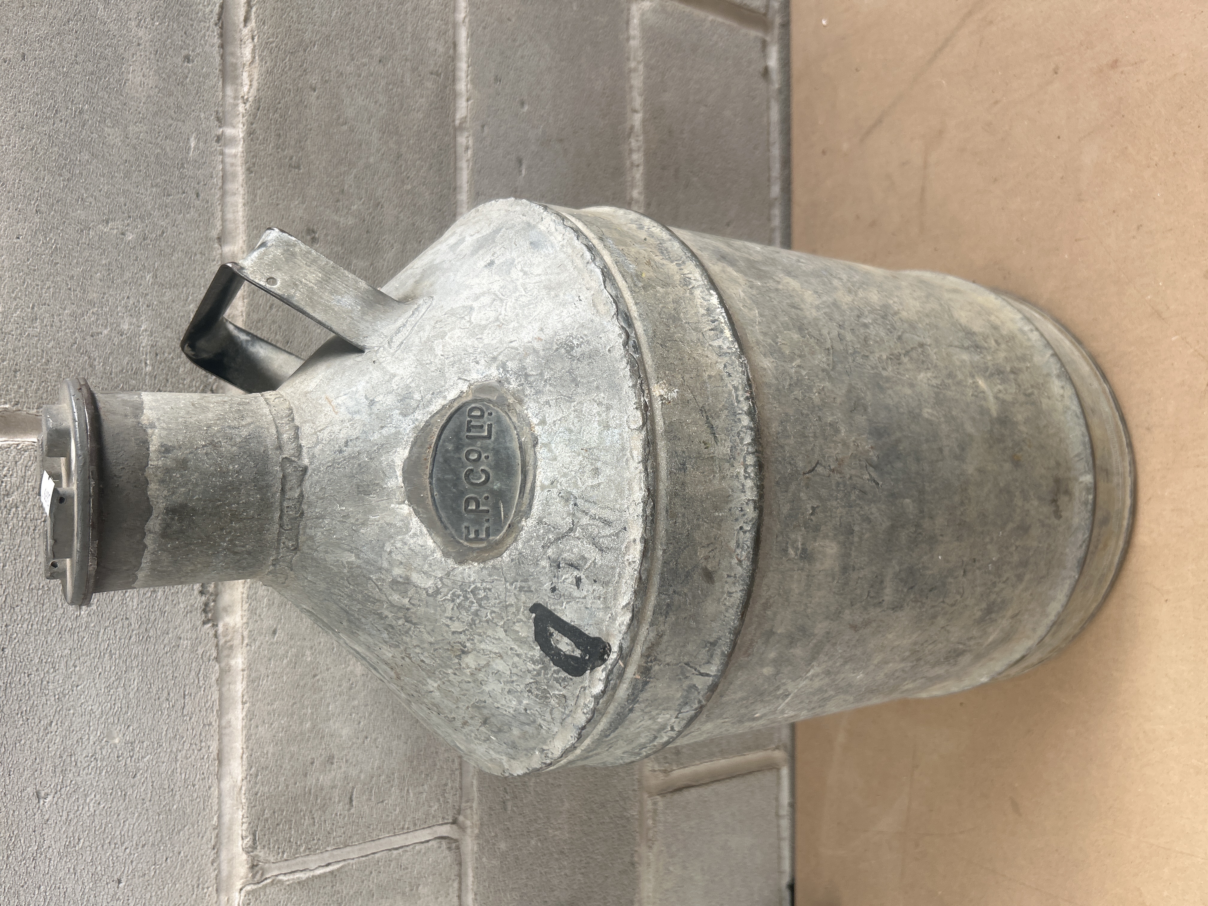 A galvanized metal milk can, featuring a cylindrical body with a conical shoulder leading to a narrow neck and a fitted lid with a small handle. A single arched carrying handle is attached to the shoulder. An oval embossed plaque on the upper body displays the text “E.P. CO. LTD”. Below this, a large, crudely handwritten black ‘D’ is visible.