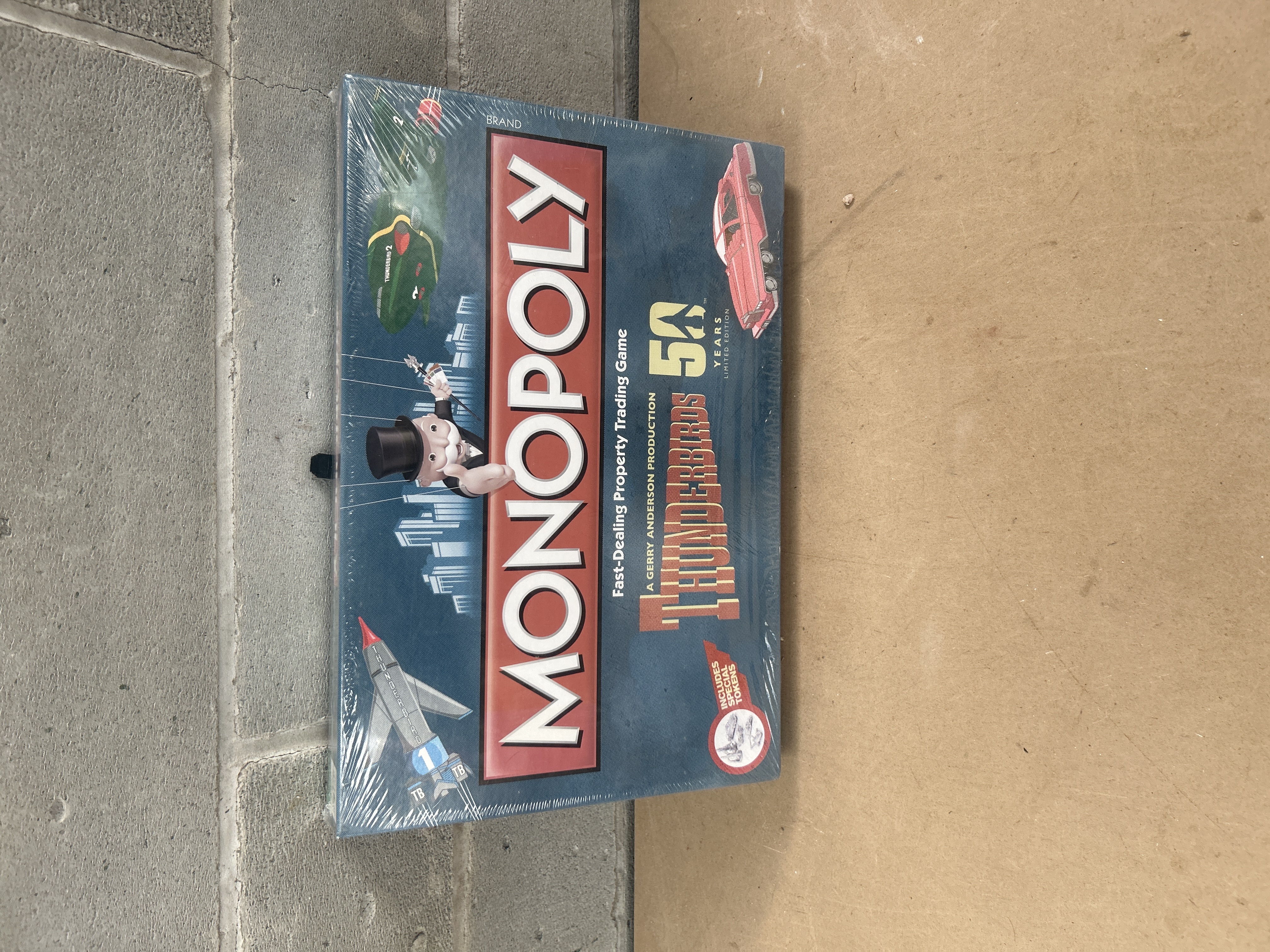 Monopoly: Thunderbirds 50 Years Limited Edition Board Game, presented in its original cardboard box and sealed in clear plastic shrink wrap. This special edition of the “Fast-Dealing Property Trading Game” features iconography from “A Gerry Anderson Production.” The box art prominently displays the “MONOPOLY” logo, alongside images of “Thunderbird 1,” “Thunderbird 2,” “FAB 1” (a red car), and Mr. Monopoly depicted as a marionette puppet. A red circular emblem on the front states “INCLUDES SPECIAL TOKENS,” illustrating various character vehicles.