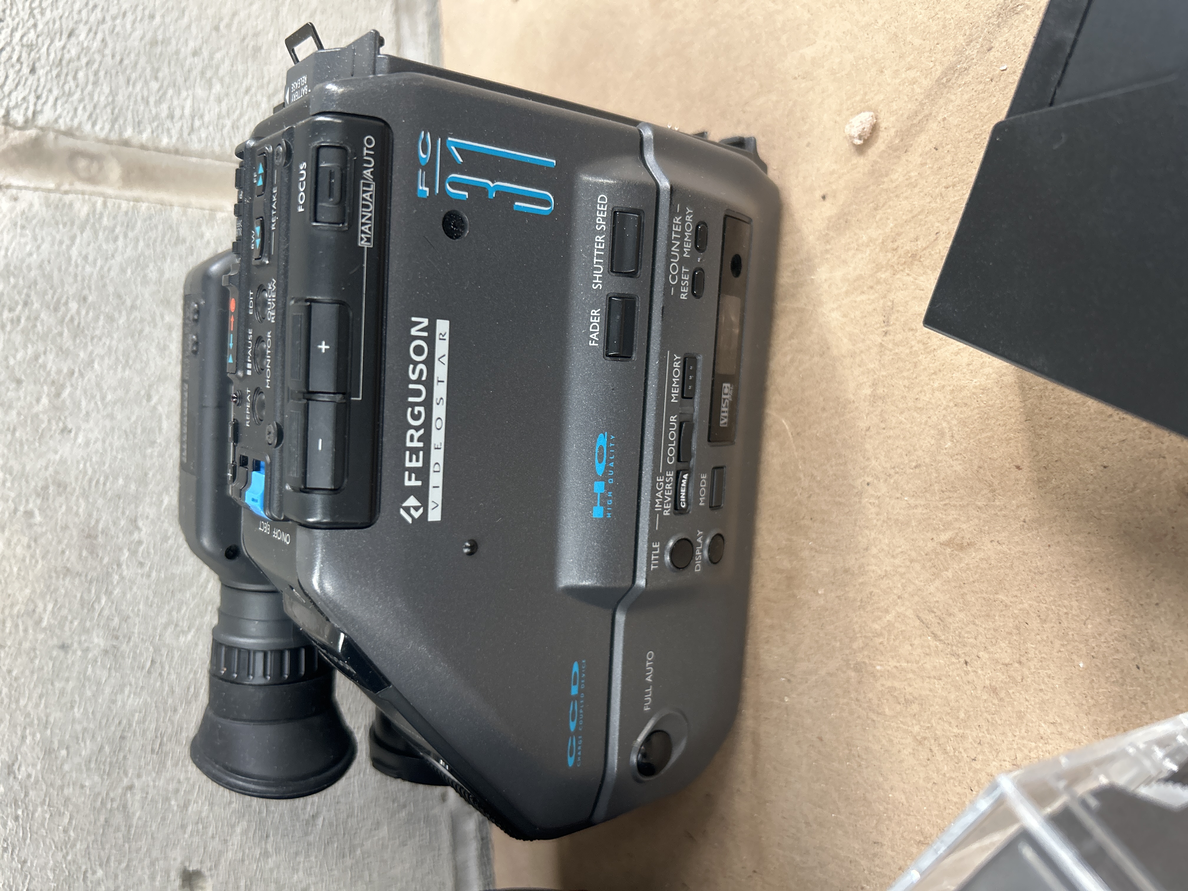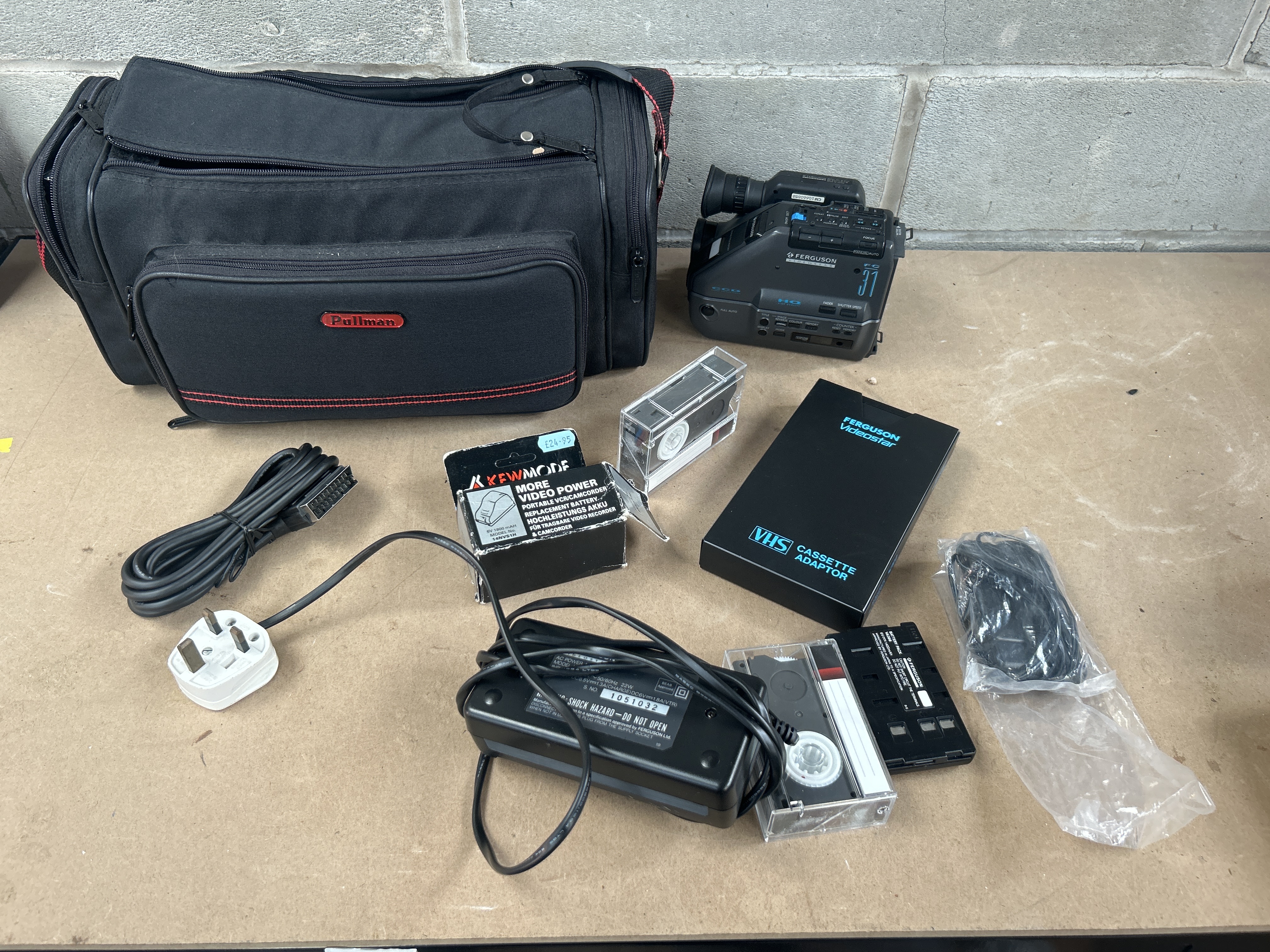A vintage Ferguson Videostar FC 31 VHS-C camcorder kit. The kit comprises a dark grey plastic Ferguson Videostar FC 31 VHS-C camcorder with an integrated lens and monochrome viewfinder. Accompanying the camcorder are a black fabric “Pullman” carrying bag, a black AC charger (model VC10103E) with a UK-style power cable, a black AV cable, two clear plastic VHS-C video cassettes (one with black tape, one clear), a black plastic “VHS CASSETTE ADAPTOR,” and a black “K Newmore MORE VIDEO POWER RECHARGEABLE BATTERY PACK.” The item is noted to be in working order.