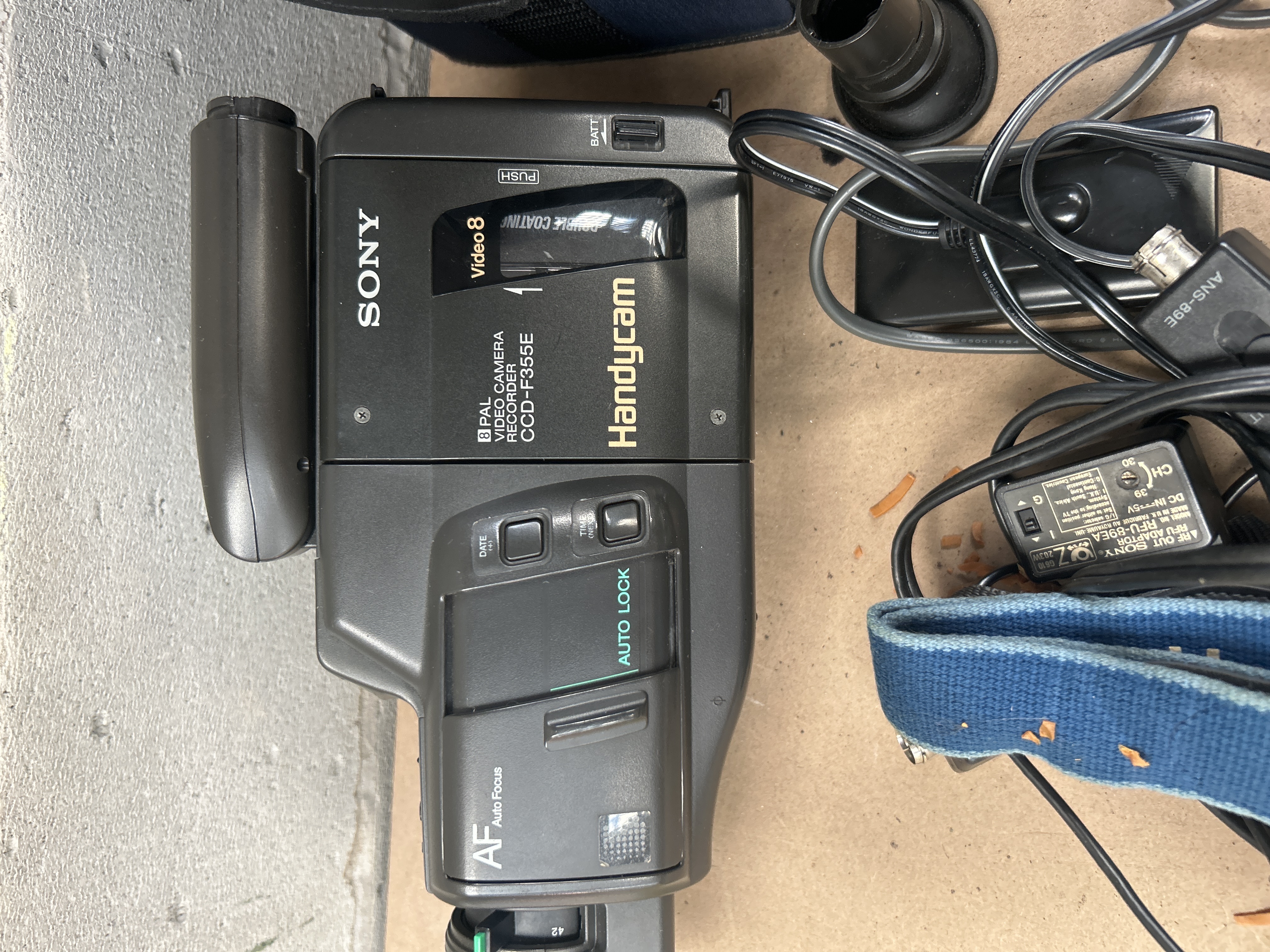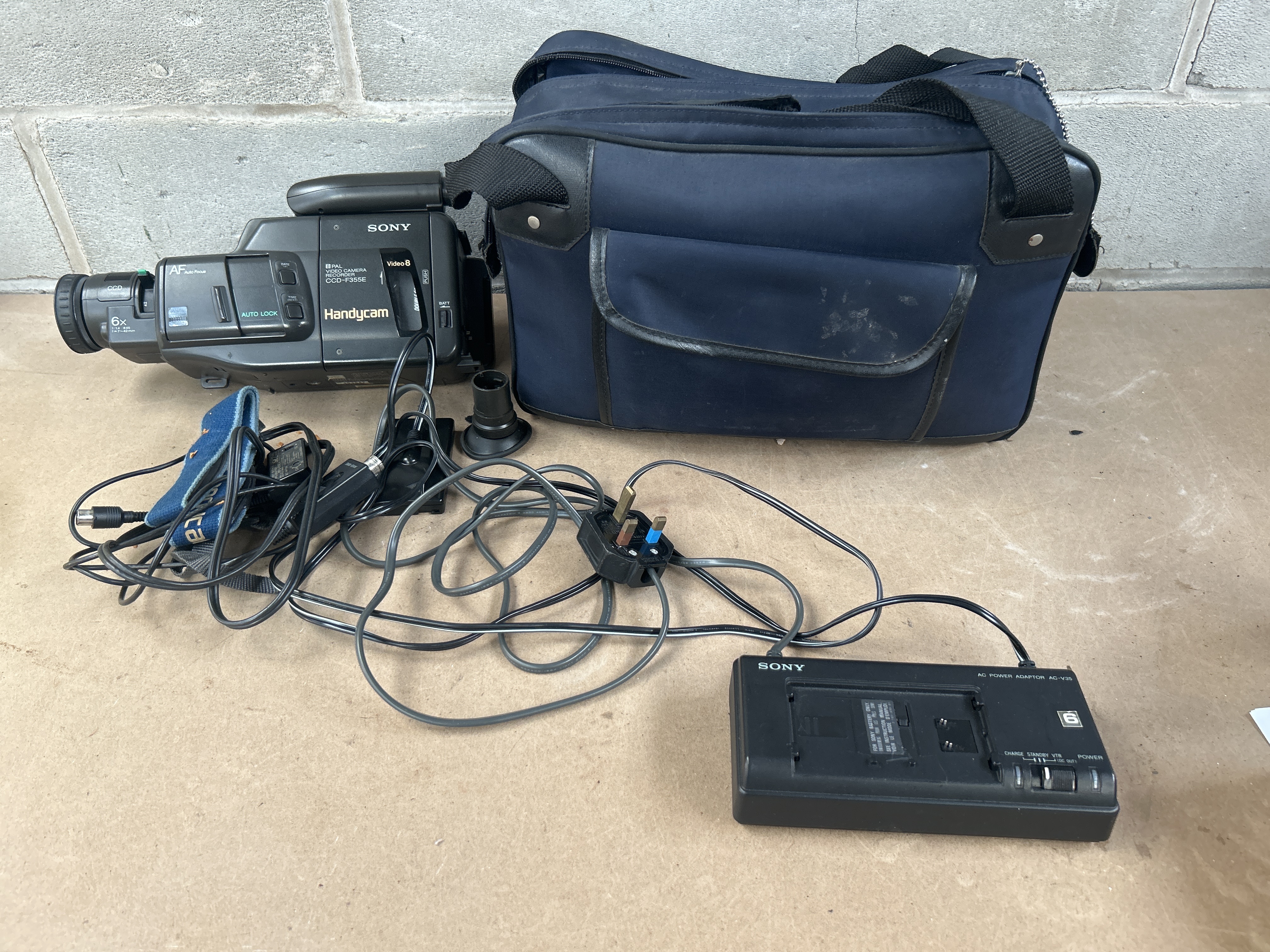 A vintage Sony Handycam Video 8 PAL camcorder, model CCD-F355E, crafted from dark gray plastic, dating from the late 1980s to early 1990s era. The camcorder features visible text including “AF Auto Focus,” “AUTO LOCK,” “DATE,” and “TIME.” This lot is presented with its navy blue soft-sided carrying bag, a Sony AC Power Adaptor AC-V10, and a collection of associated accessories including tangled cables, a UK-style power plug, and a rubber eyepiece.