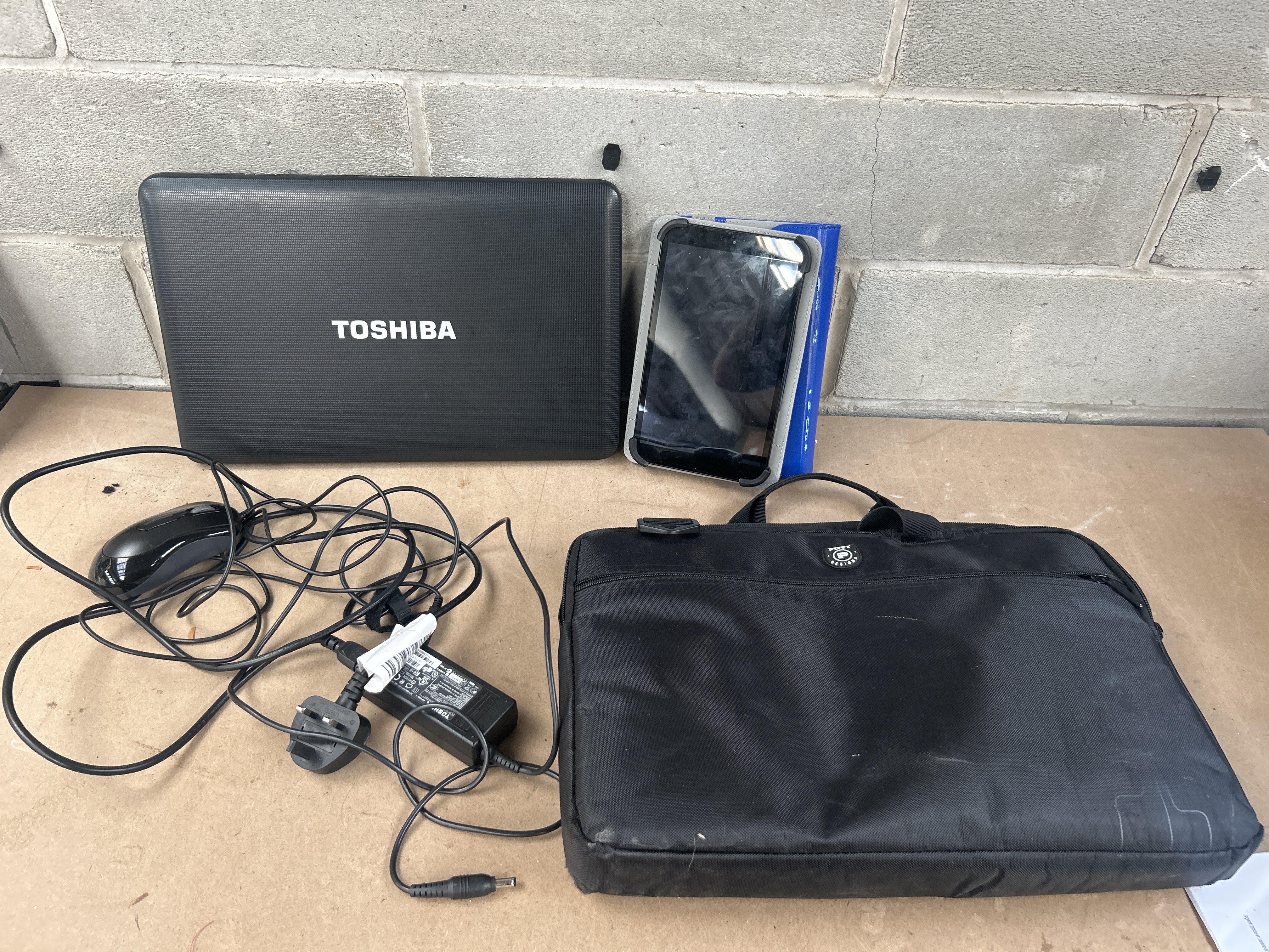 A Toshiba Satellite laptop, accompanied by a tablet, a Microsoft-branded wired optical mouse, a Port Designs laptop bag, and a Samsung-branded power adapter. The black Toshiba laptop features a textured plastic lid and is consistent with models often equipped with 4GB RAM and an HDD. The tablet is housed in a grey protective case. The power adapter features a UK 3-pin plug and bears “SAMSUNG” branding along with various electrical specifications. The lot is presented as being in working order.