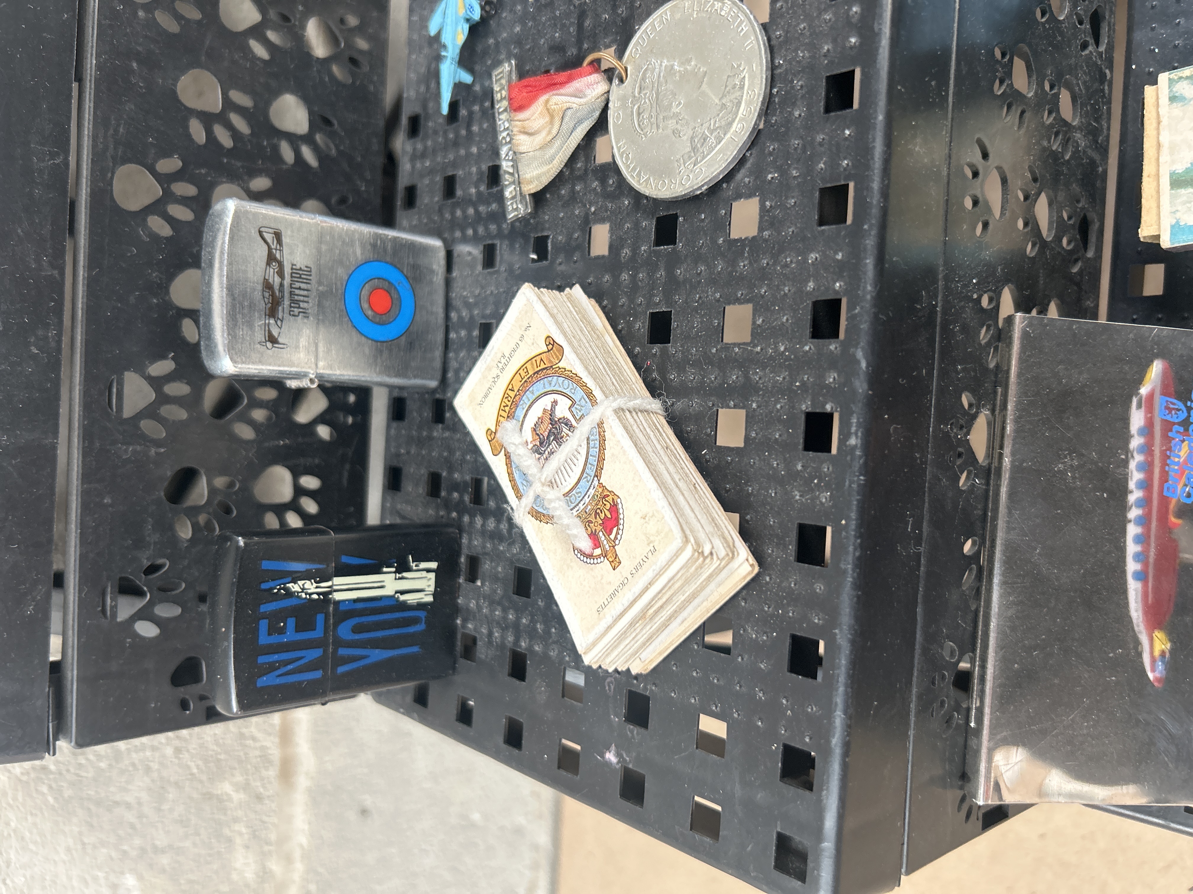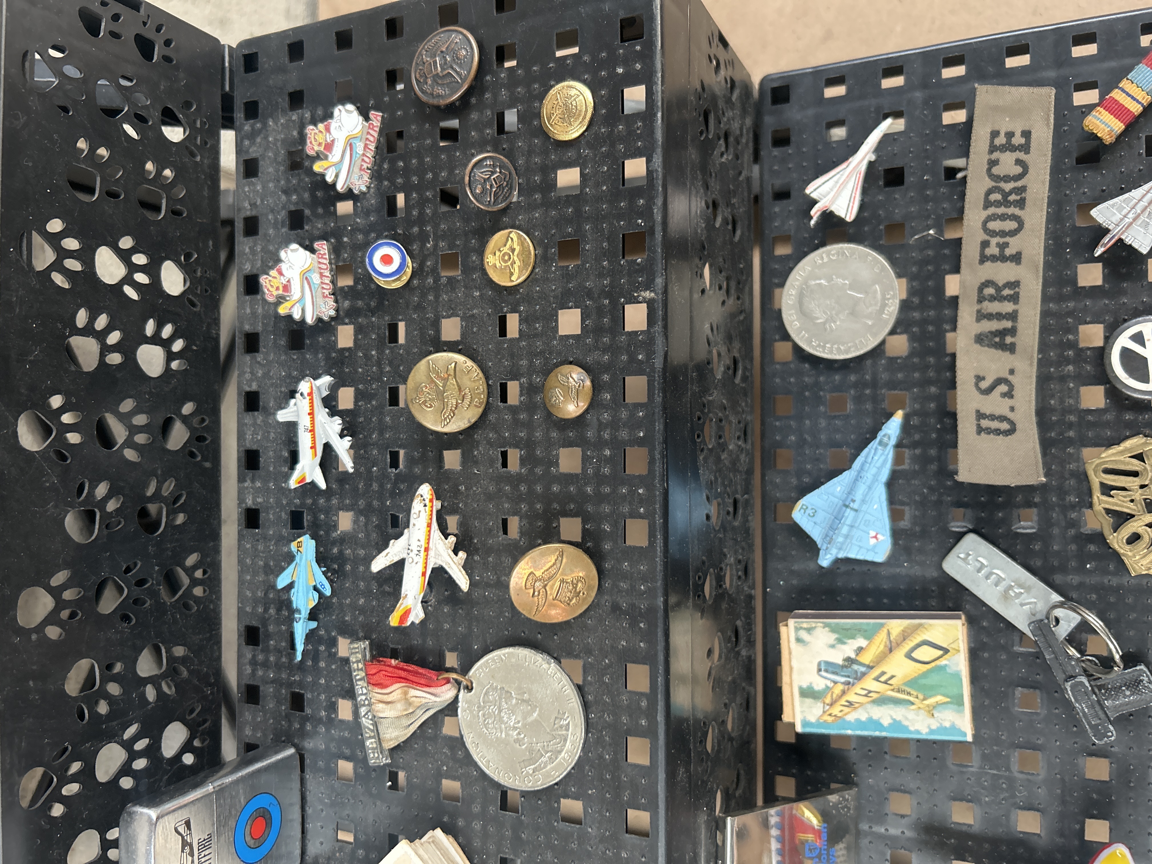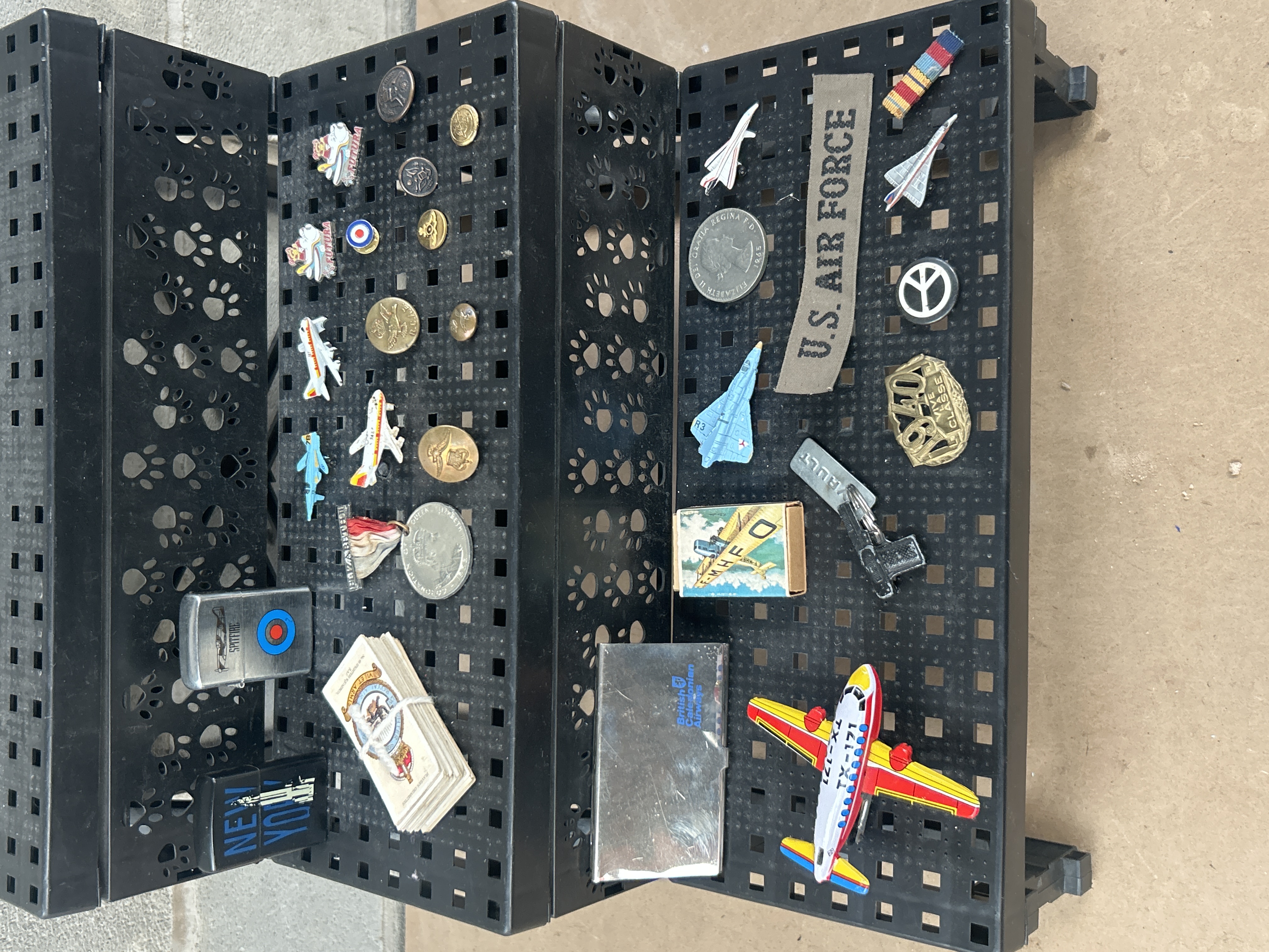 A collection of aviation and military-themed memorabilia presented on a two-tier black plastic challenge coin display unit with paw-print cutouts. The collection includes two Zippo-style lighters, one marked “NEW YORK” with a skyscraper motif and the other “SPITFIRE” with an RAF roundel. Also present are various plastic and metal model aircraft, numerous metal coins, medals, and medallions. Visible British coins bear inscriptions such as “ELIZABETH II DEI GRATIA REGINA F: D:” and “GEORGIVS VI D: G: BR: OMN: REX F: D: IND: IMP.”, with one coin dated “1944”. Further items comprise a stack of paper cards tied with string, printed “BRITISH AIRCRAFT – PILOT’S COMMITTEE” and “J.R. PHILLIPS, TOBACCONIST”; a small matchbox marked “MADE IN USSR”; a “VAULT” keychain attached to a pistol-shaped fob; a “U.S. AIR FORCE” embroidered patch; and assorted pins and badges, including a “FUTURA” branded item, an RAF roundel, and a peace symbol.