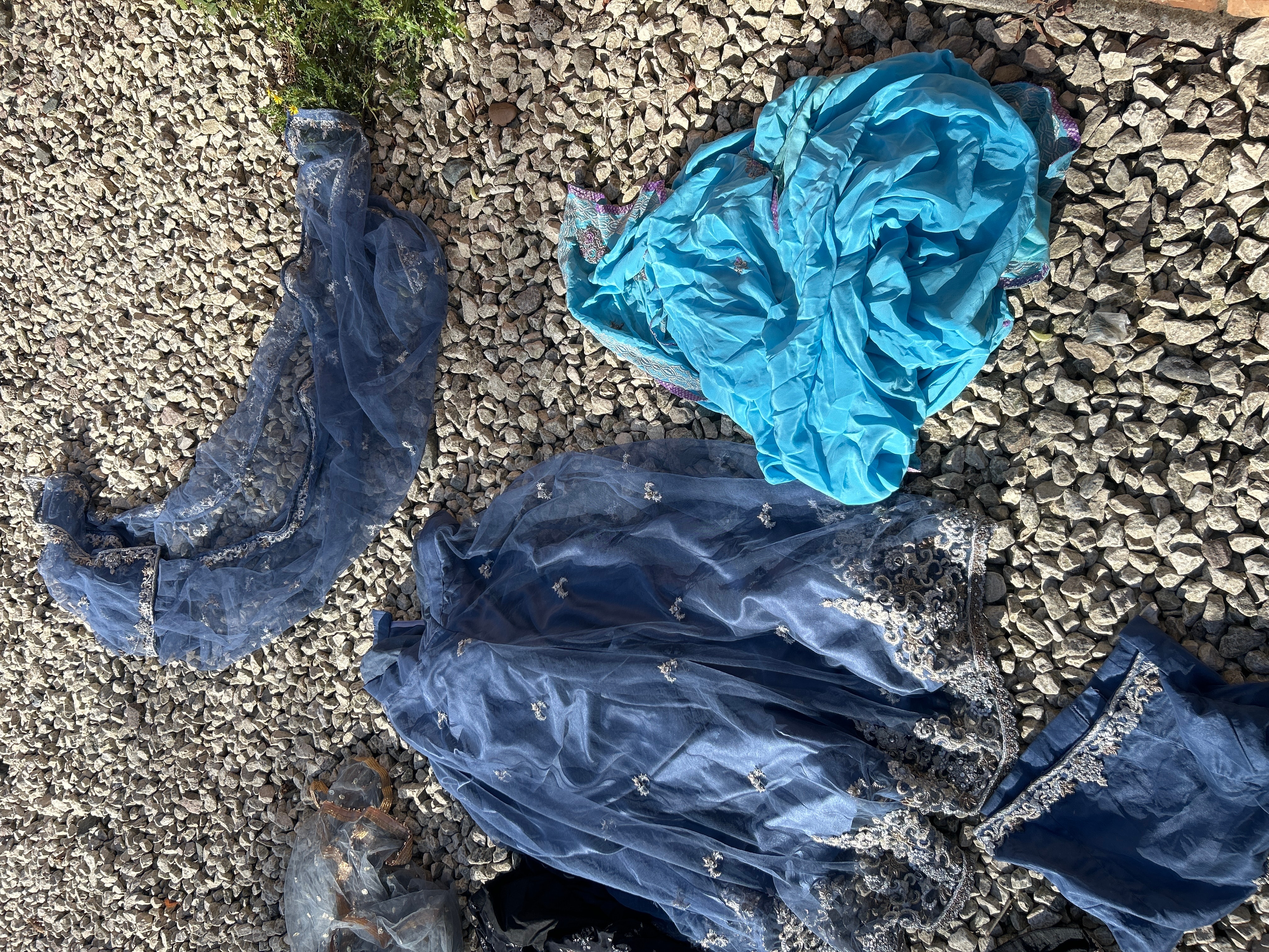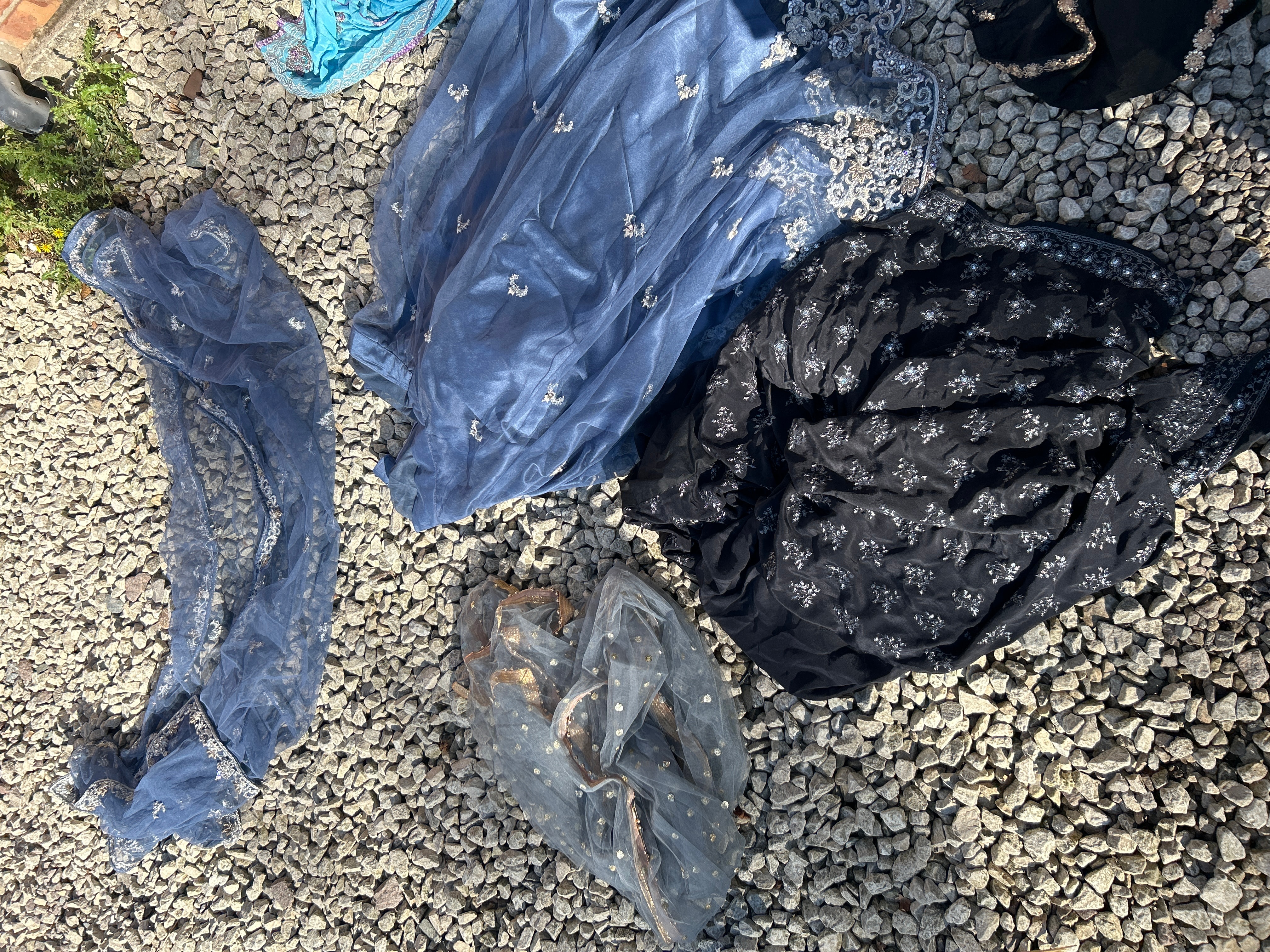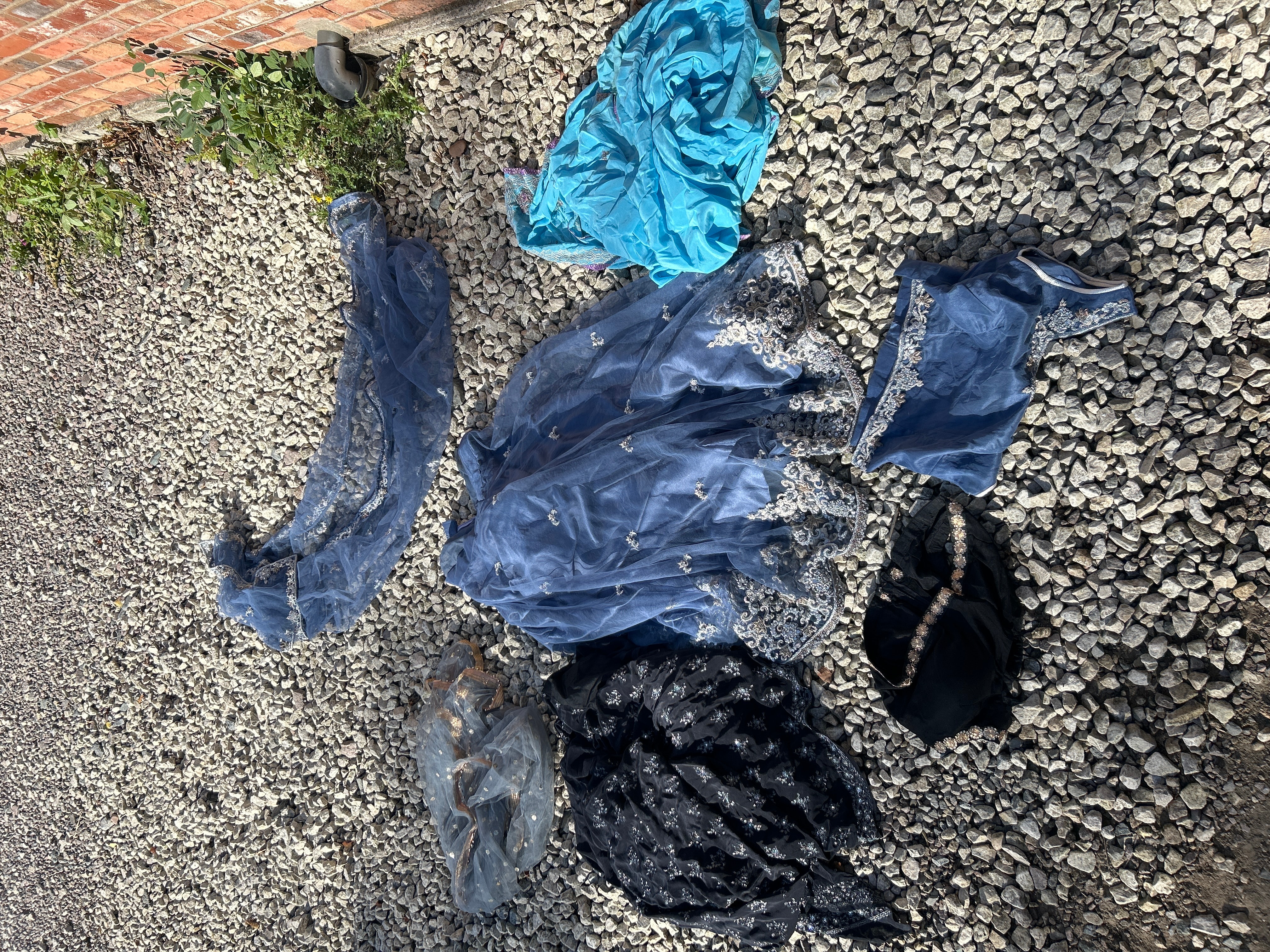 This lot comprises a collection of seven textile items, predominantly crafted from sheer or semi-sheer synthetic fabrics. The textiles include a light blue crumpled fabric piece, a dark blue embroidered top or vest, a larger dark blue embroidered fabric piece (possibly a skirt or dress component), an elongated dark blue embroidered dupatta or scarf, and two pieces of black embroidered fabric (one larger, one smaller with metallic trim). All textile pieces feature extensive silver-colored metallic embroidery, suggestive of traditional or formal South Asian or Middle Eastern attire. The lot also includes a clear plastic bag containing a metallic, likely gold-toned, accessory resembling a belt. No visible text, labels, or maker’s marks are apparent on any of the items.