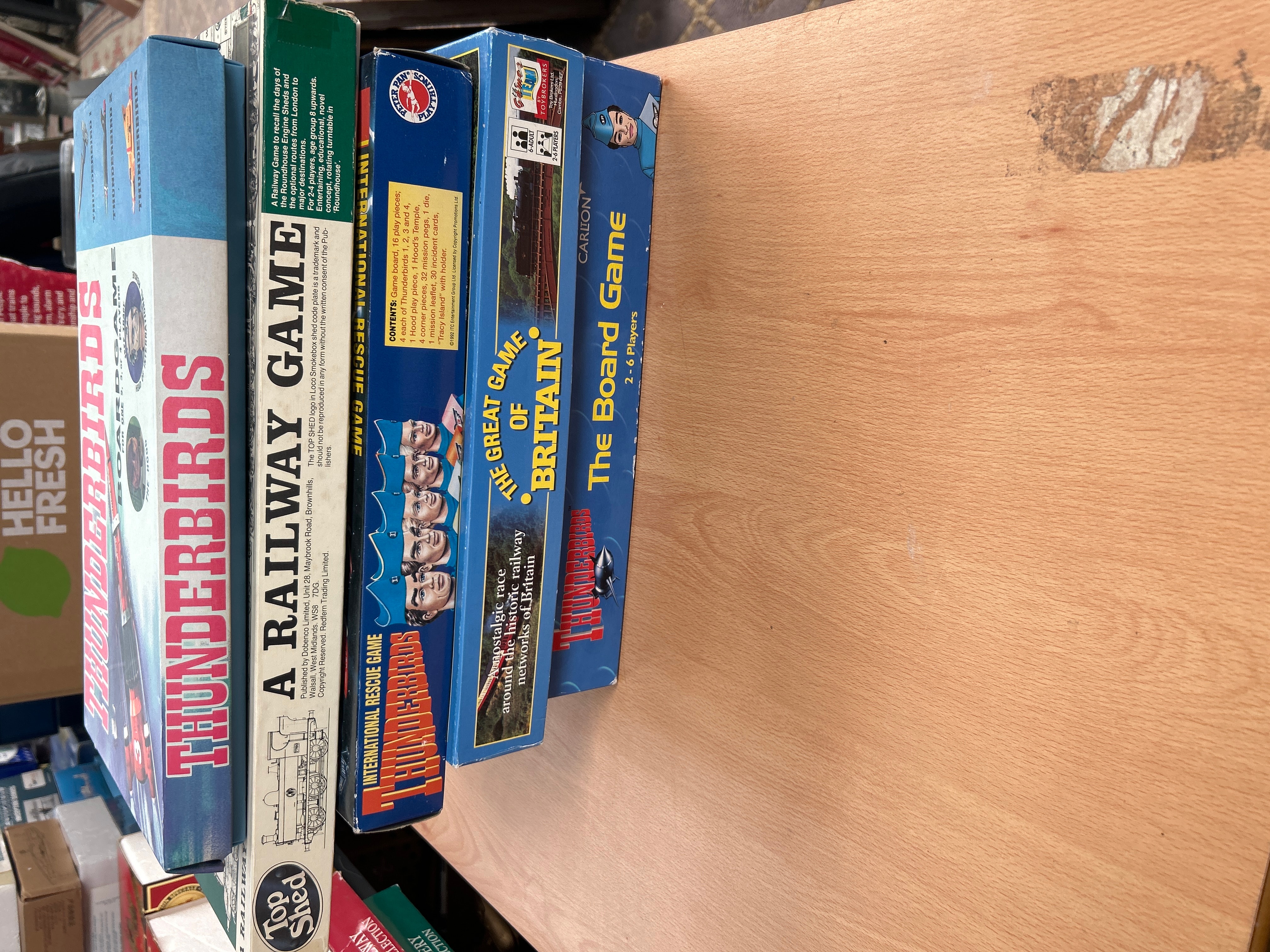3. “The Great Game of Britain: The Board Game” by Carlton and Toy Brokers, an “adult” game for “2-6 players” featuring a “nostalgic race around the historic railway networks of Britain,” and also incorporating “Thunderbirds” branding on its side.