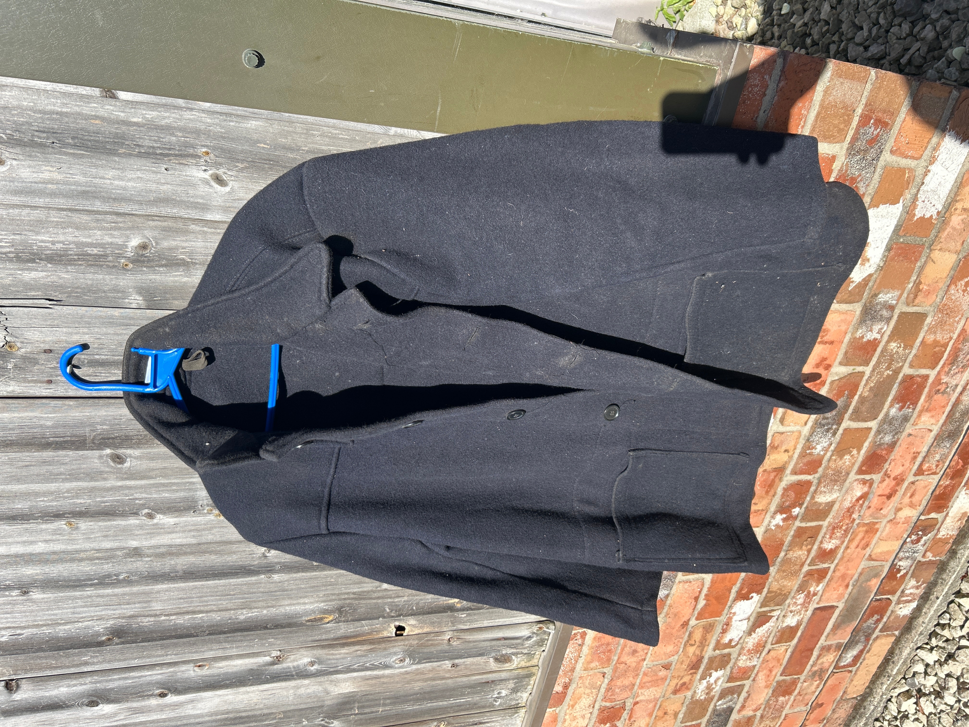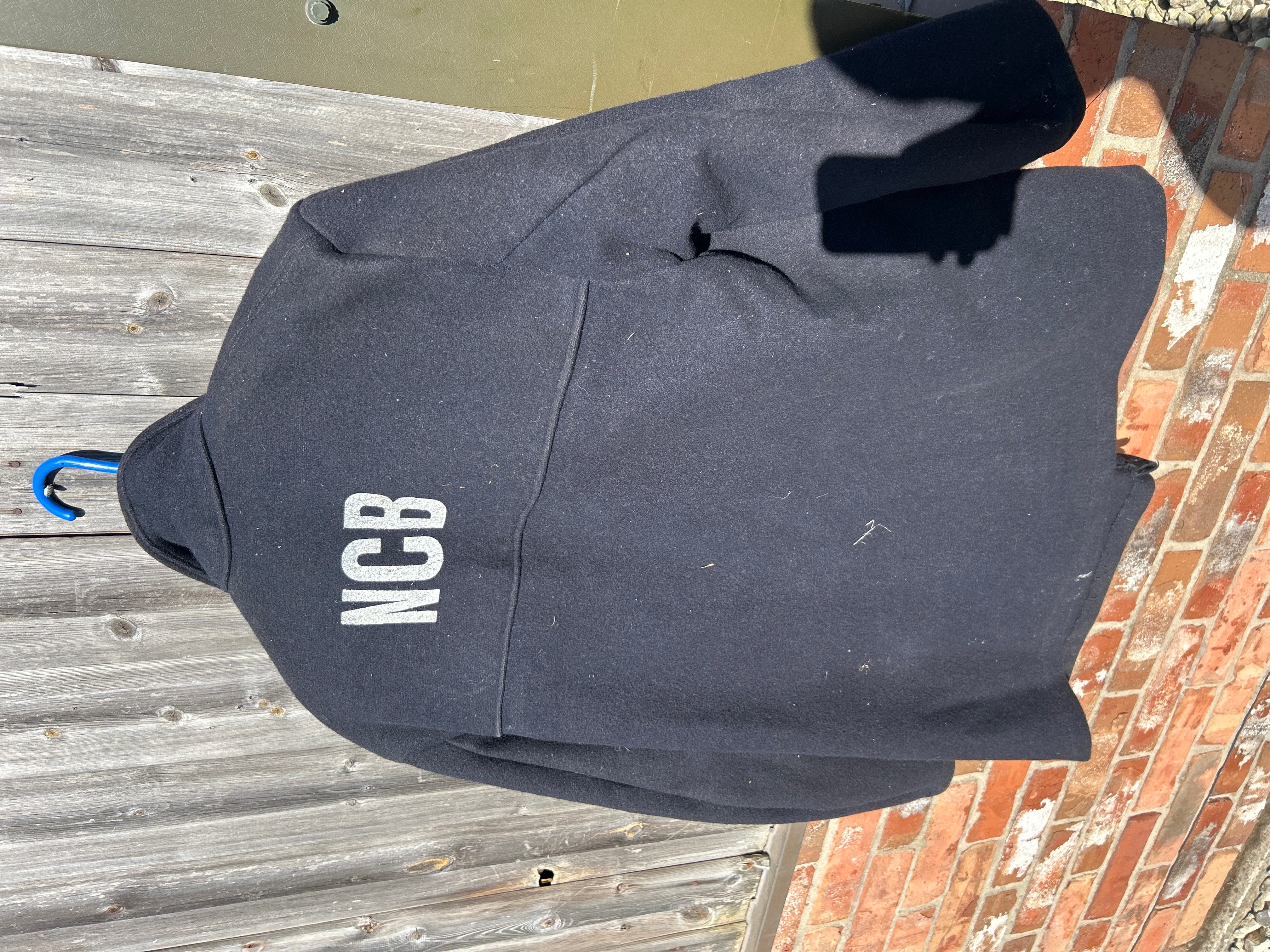A heavy-duty utility or workwear jacket, crafted from a thick, dark navy or black wool or wool-blend material, possibly felted. It features a pointed collar, a button-front closure with dark buttons, and two visible large lower patch pockets. The back of the jacket is prominently stenciled with the contrasting light-colored letters “NCB”.