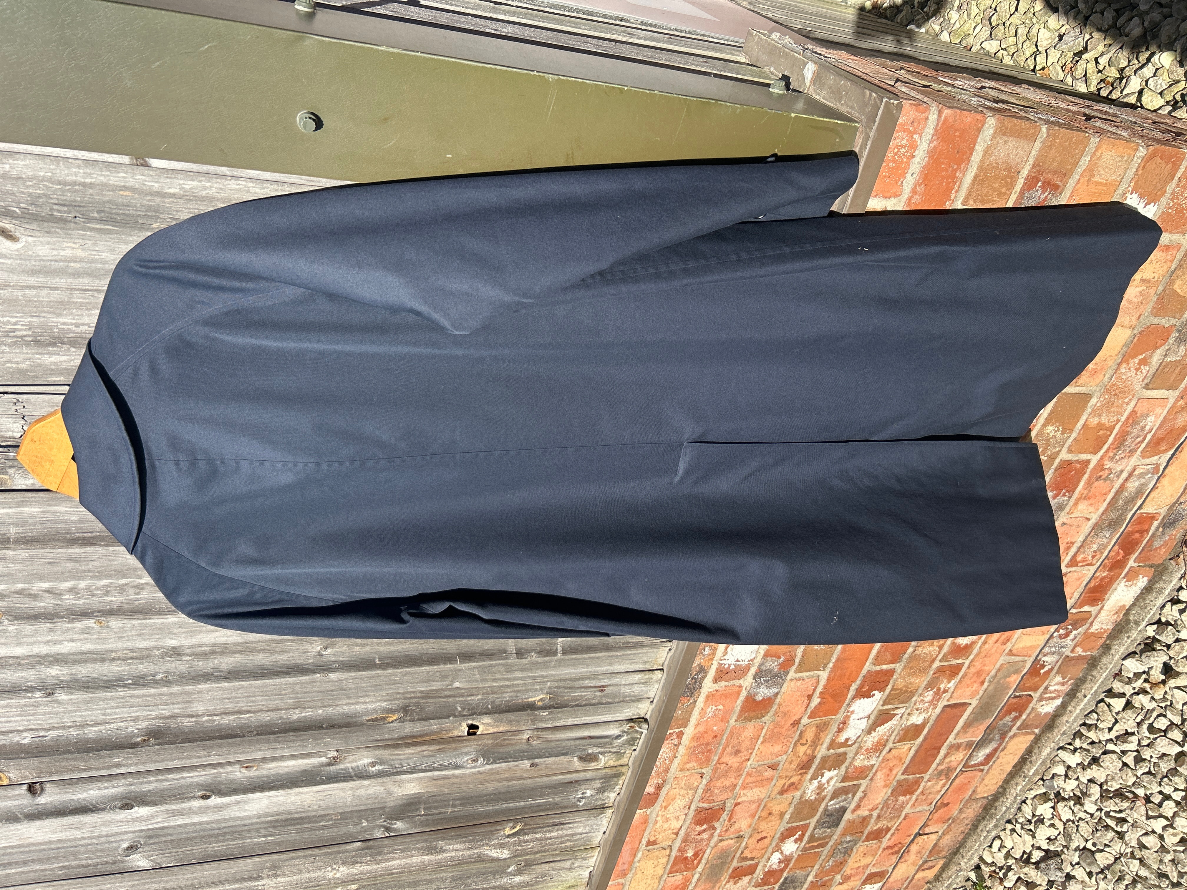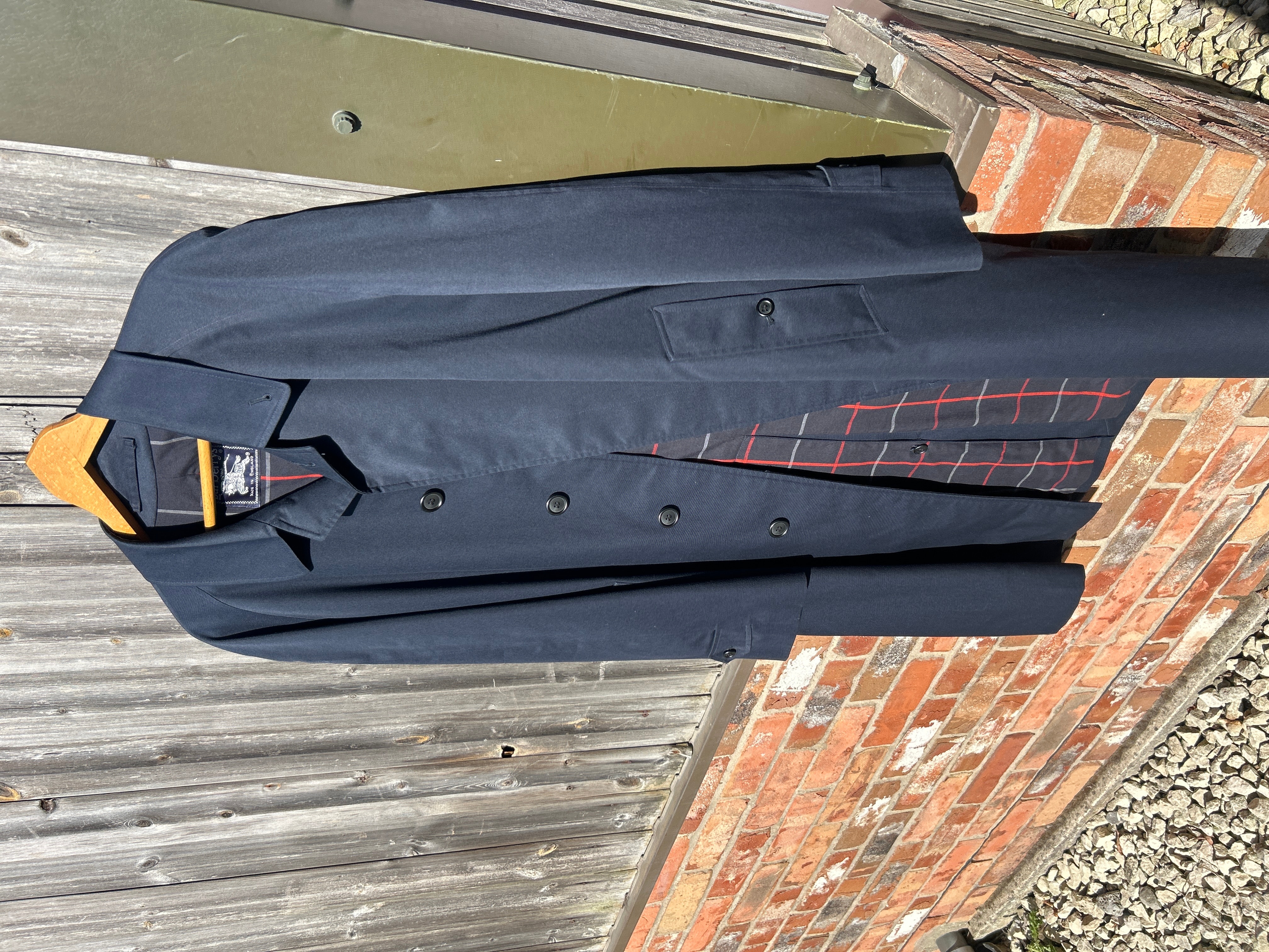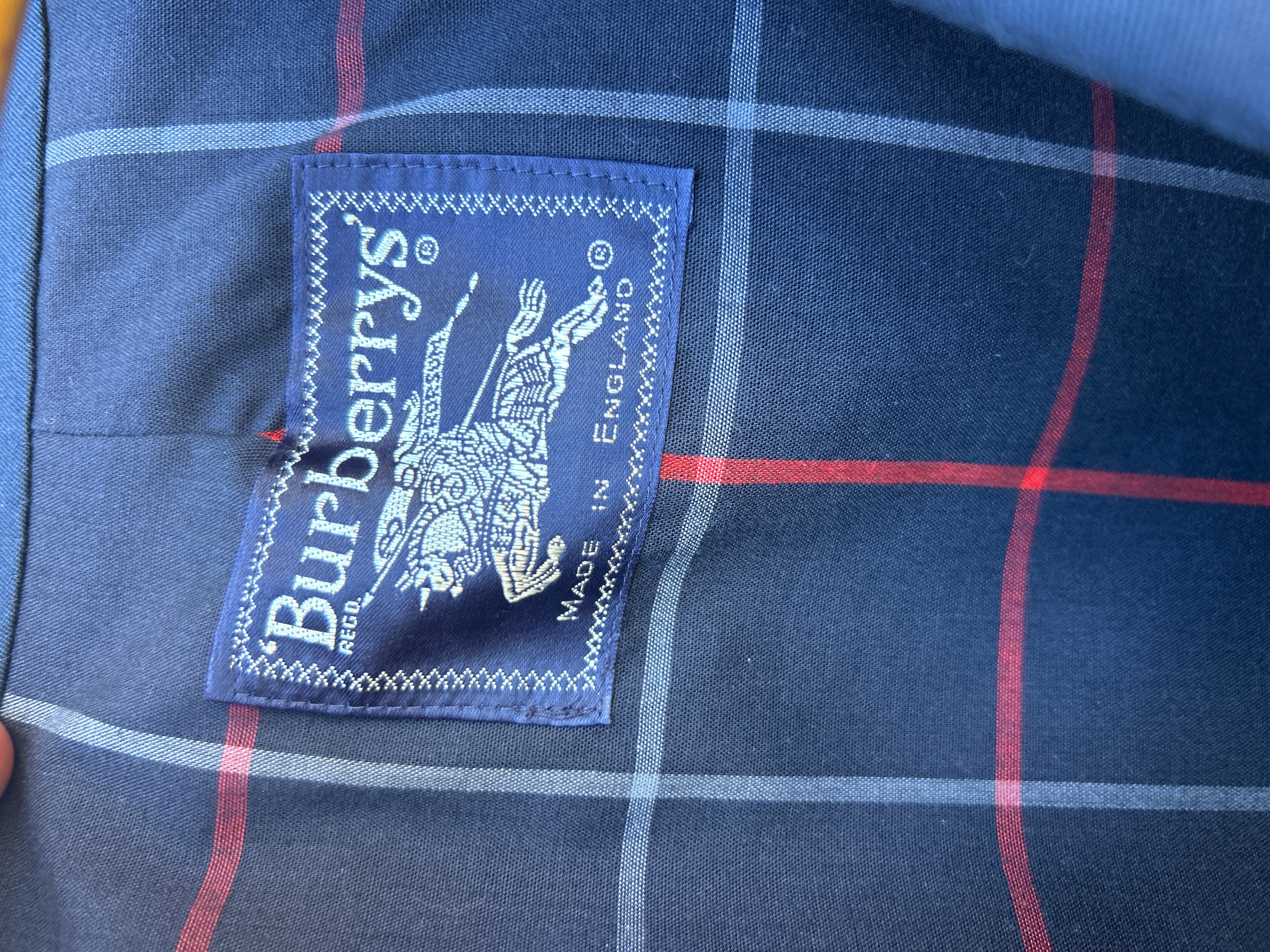 A vintage Burberrys’ navy double-breasted trench coat, featuring a classic collar and raglan sleeves. The exterior is crafted from a durable, gabardine-like fabric. The interior is lined with a distinct red, blue, and white plaid pattern. A prominent woven label inside the collar reads “Burberrys’ REGD.” alongside the Equestrian Knight logo and “MADE IN ENGLAND.”