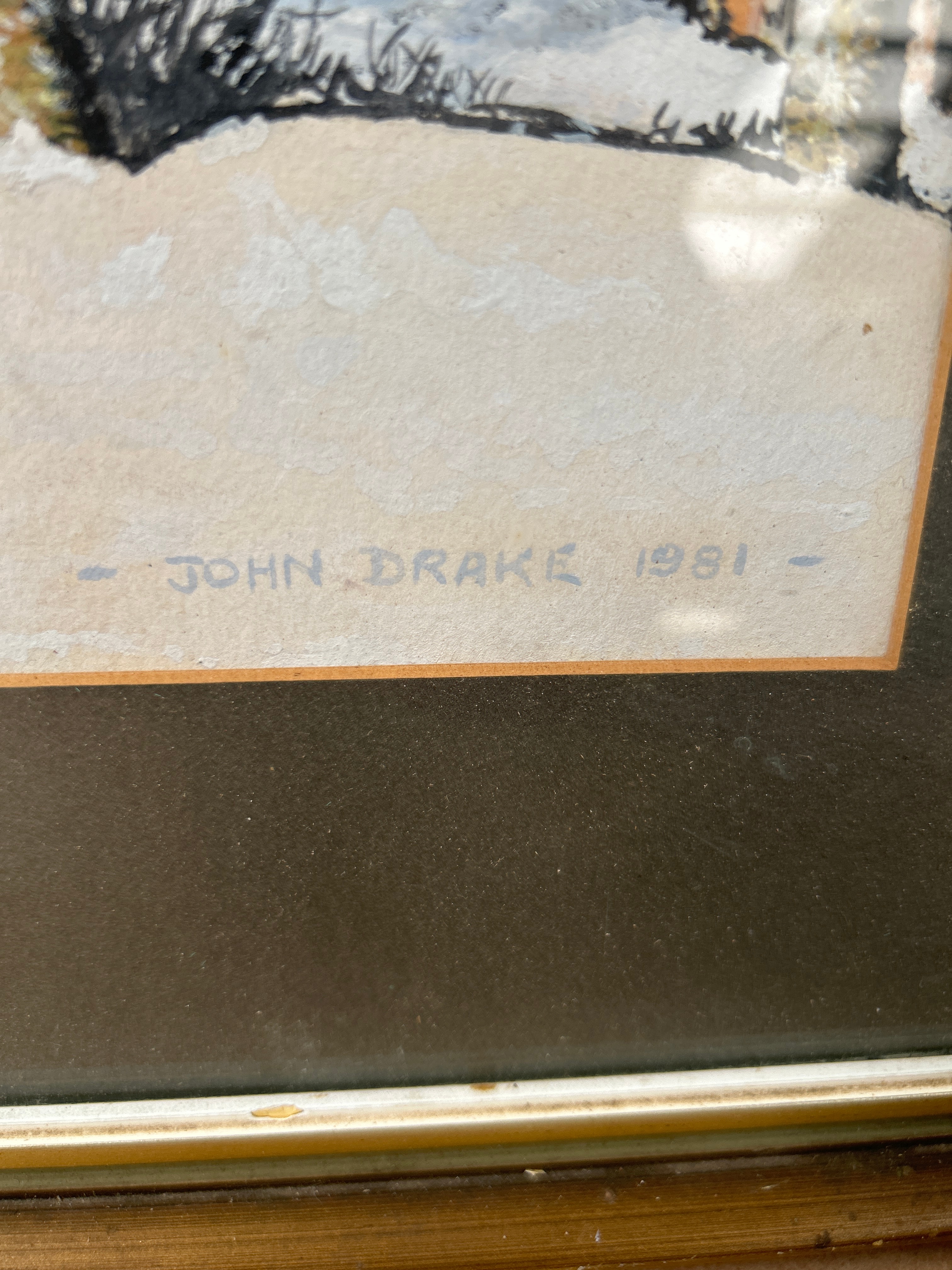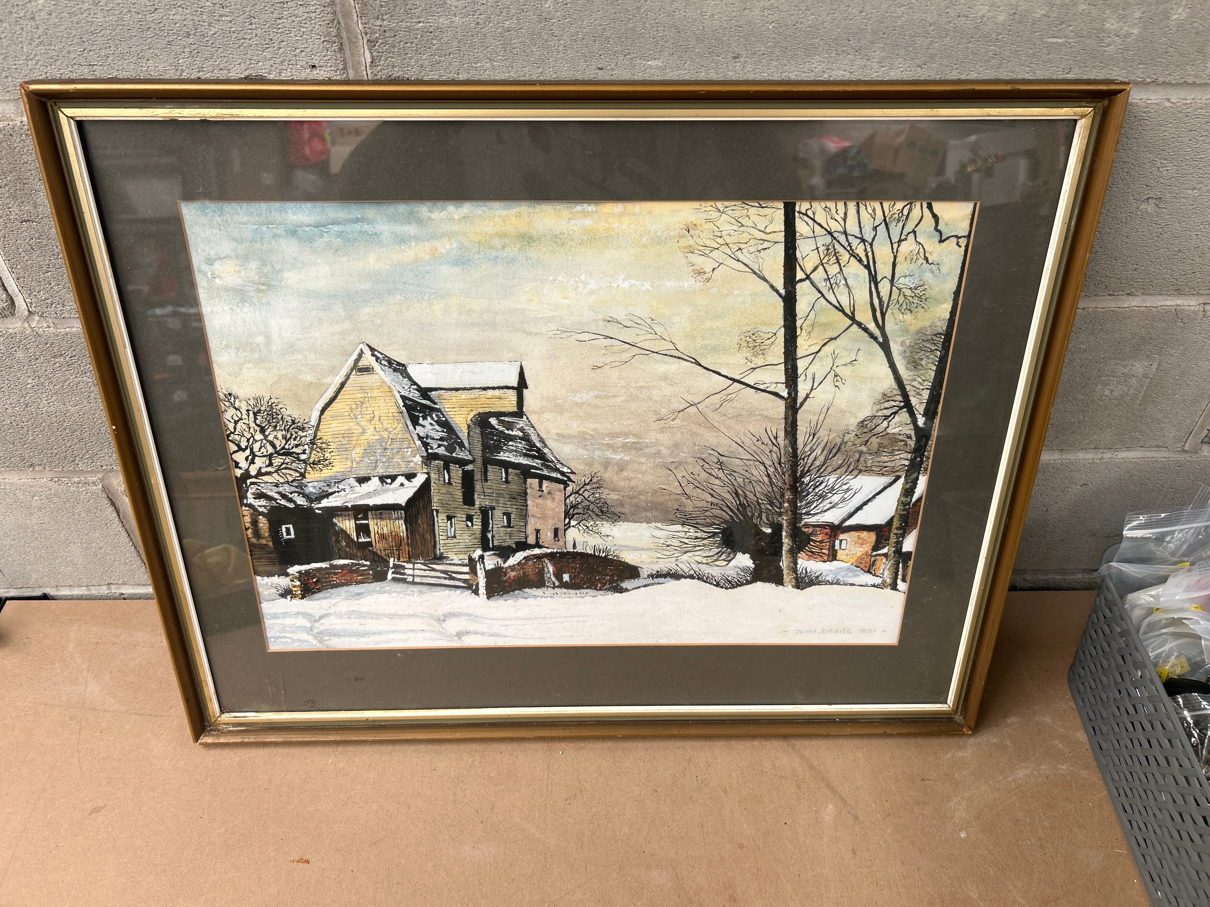 A watercolor painting by John Drake, dated 1981. The artwork depicts a realistic winter landscape scene, featuring a multi-story house or barn with yellow siding, flanked by bare trees and smaller structures, all covered in snow. It is presented under glass, with a dark grey/brown mat, set within a gold-toned frame.