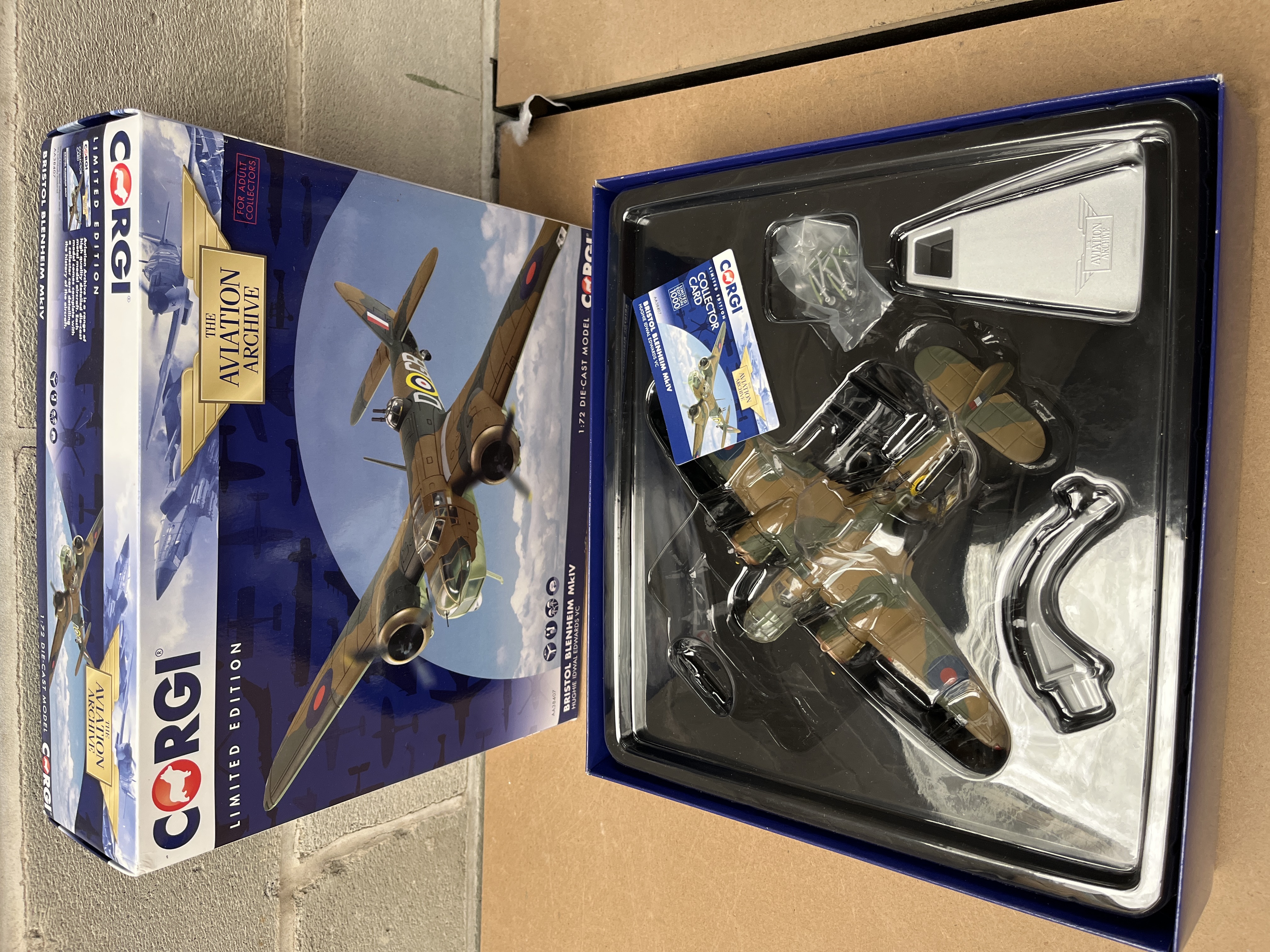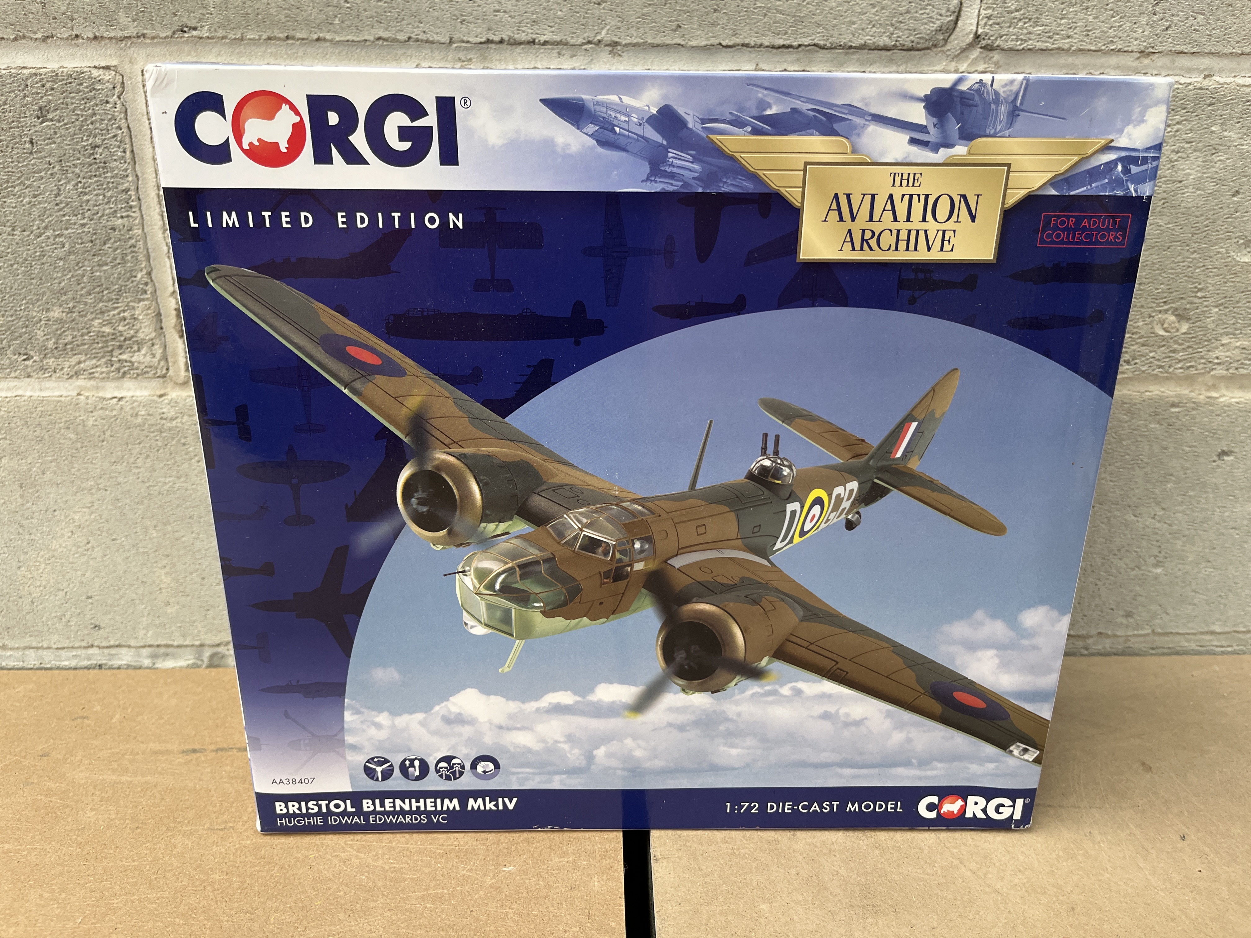 A Corgi Limited Edition 1:72 scale die-cast model of a Bristol Blenheim MkIV aircraft, specifically ‘Hughie Idwal Edwards VC’, product code AA38407, part of ‘The Aviation Archive’ series for adult collectors. The model features a military camouflage livery with visible roundels and the tail code ‘DO-R’. It is presented in its original cardboard box, which prominently displays the ‘CORGI’ brand. Inside, the model is secured within a clear plastic tray, alongside a separate display stand and small accessories.