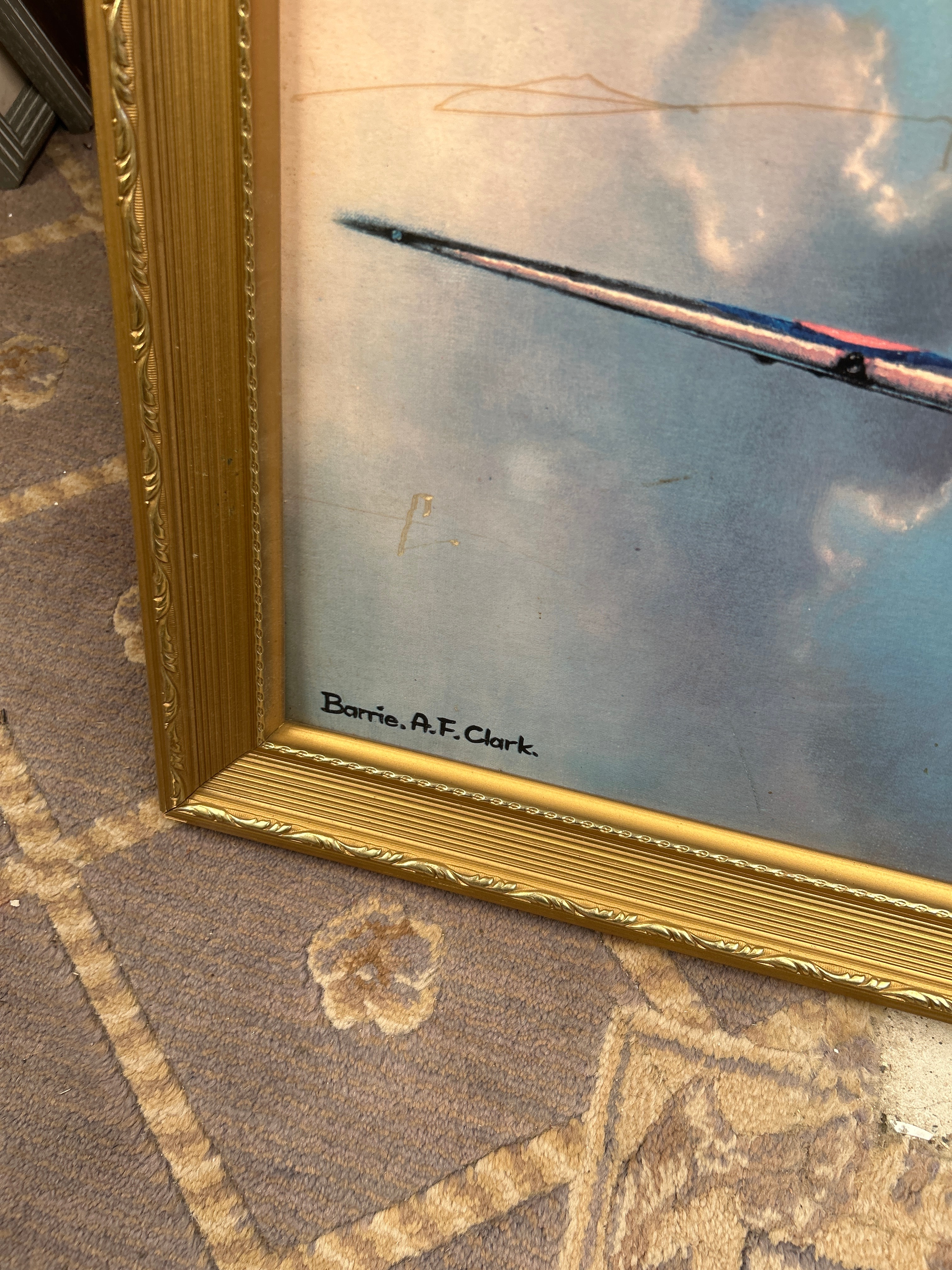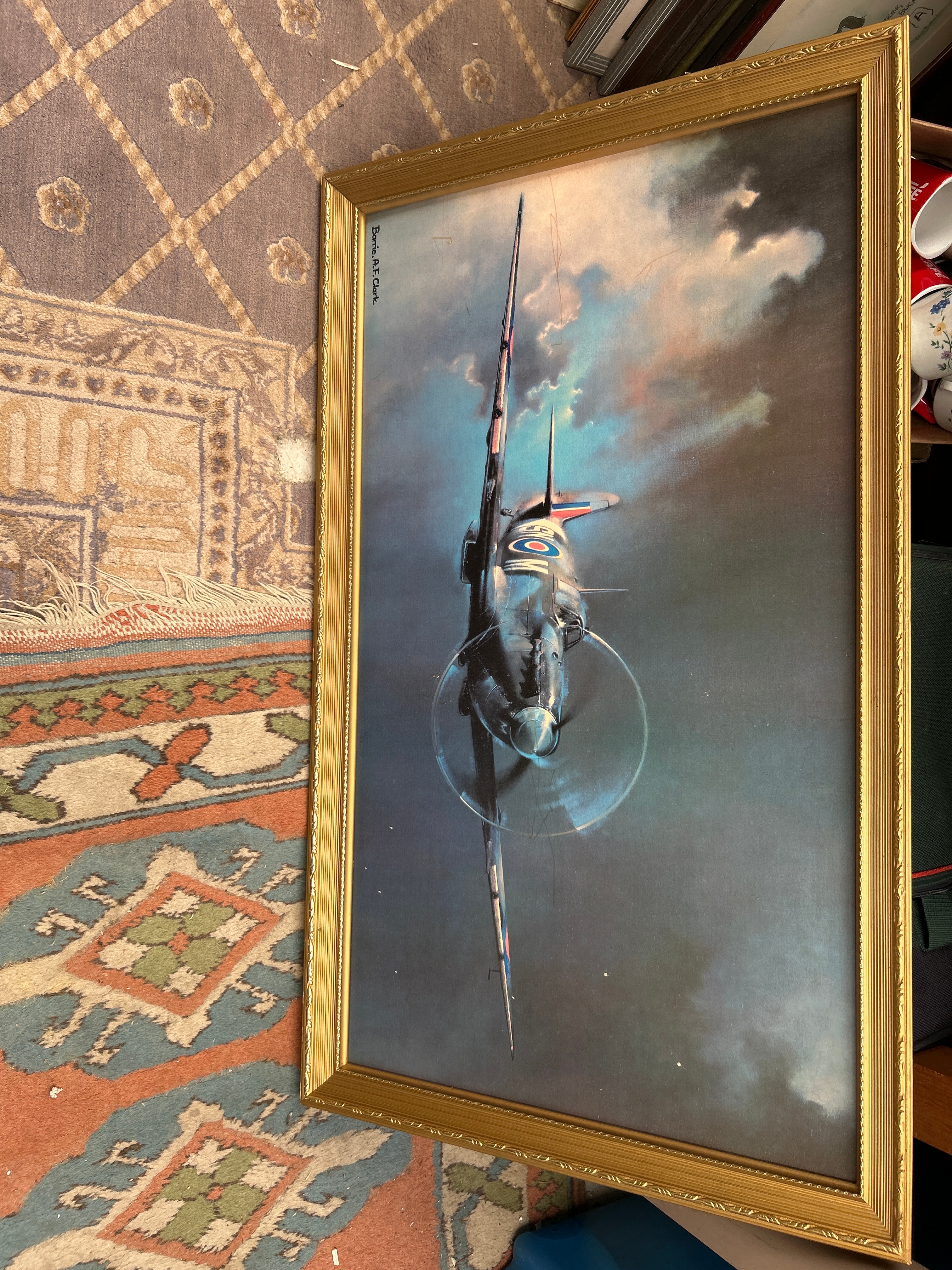 A framed print depicting a Supermarine Spitfire aircraft, signed ‘Barrie. A. F. Clark.’ in the lower left corner. The print shows a propeller-driven military aircraft viewed head-on and ascending through a dramatic, cloudy blue and grey sky, featuring characteristic circular insignia (roundels) on its wings. It is presented under glass within an ornate, gilded wooden frame. A vertically oriented label with ‘Bernard F. Smith.’ is visible on the upper left side of the frame.