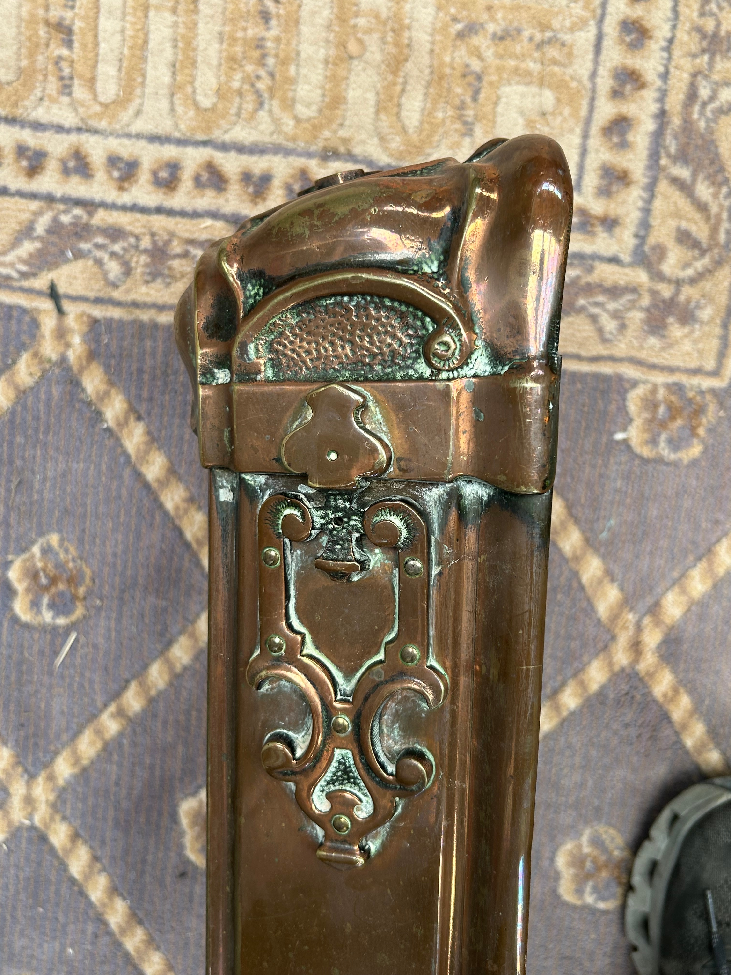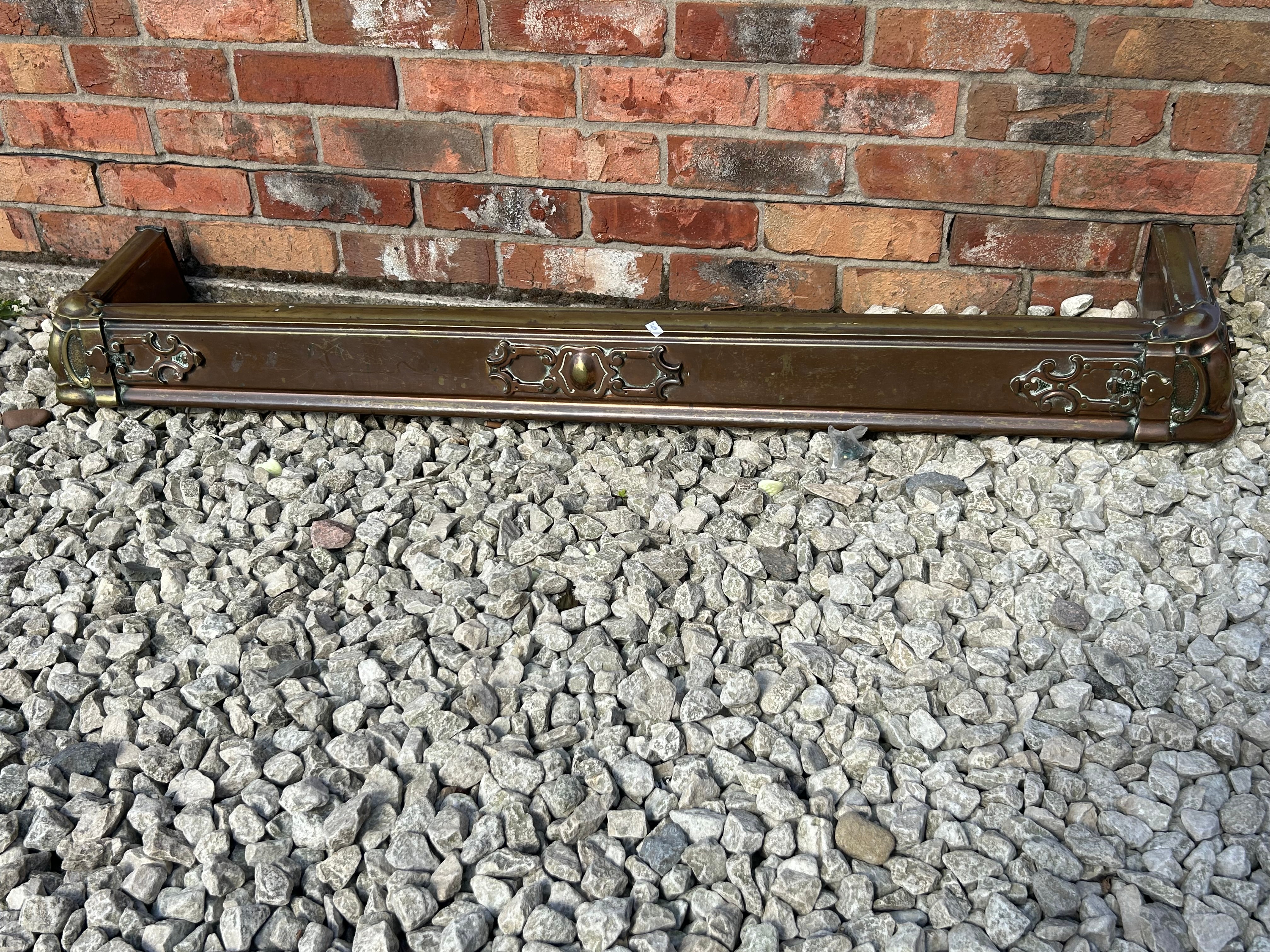 An Aesthetic Movement brass fireplace fender. This antique decorative metal fireplace fender or hearth trim is likely crafted from brass or bronze, exhibiting a warm, aged patination with notable green verdigris in recesses and along decorative elements. The style is characterized by a central ornate cartouche flanked by scrolling motifs and geometric patterns on the main body, and robustly curved, textured ends. The piece shows considerable surface wear, tarnish, and oxidation consistent with its age and use, though it appears structurally intact. A small, illegible white adhesive label is present on the central panel, with no other visible text or maker’s marks.