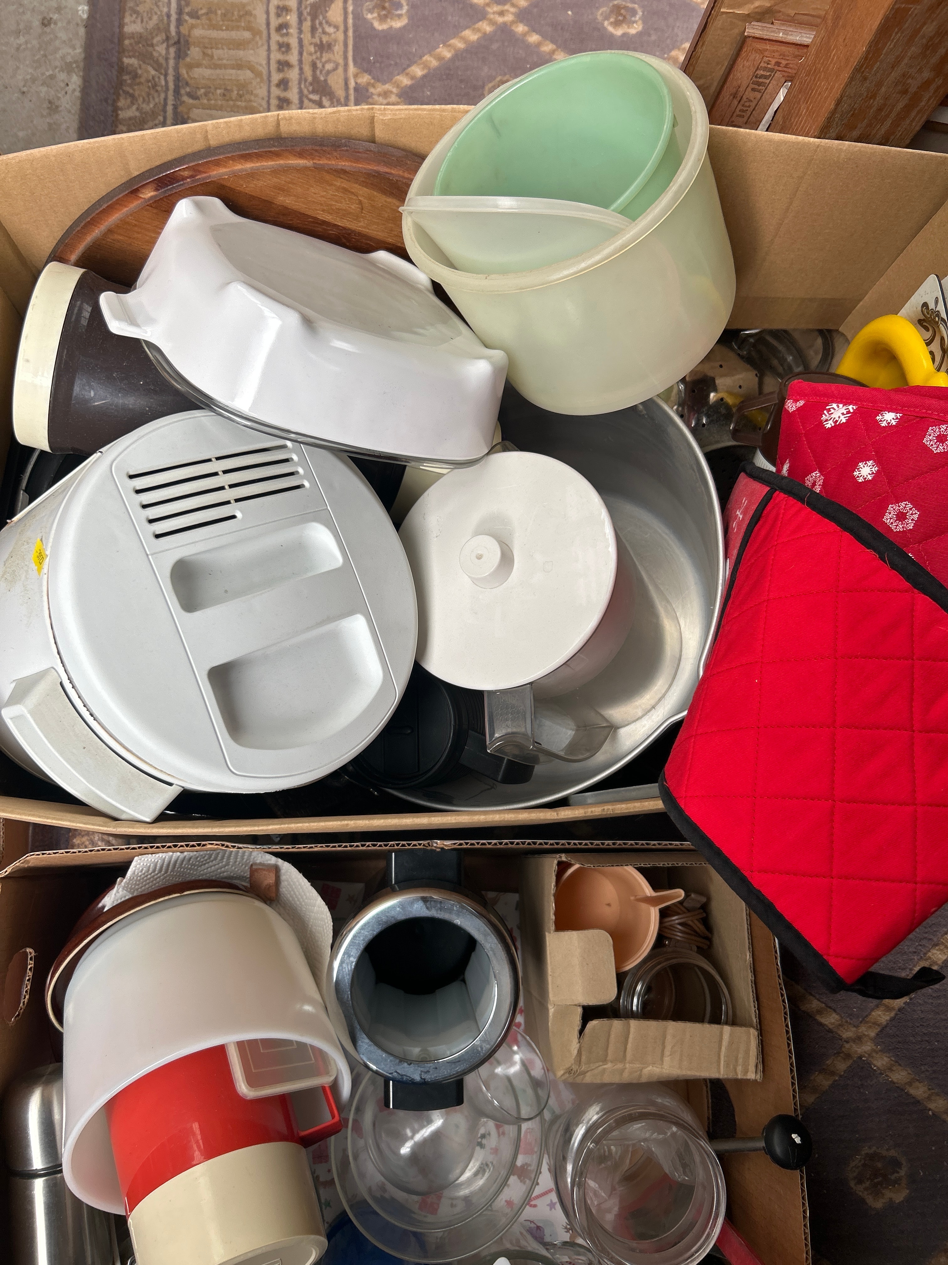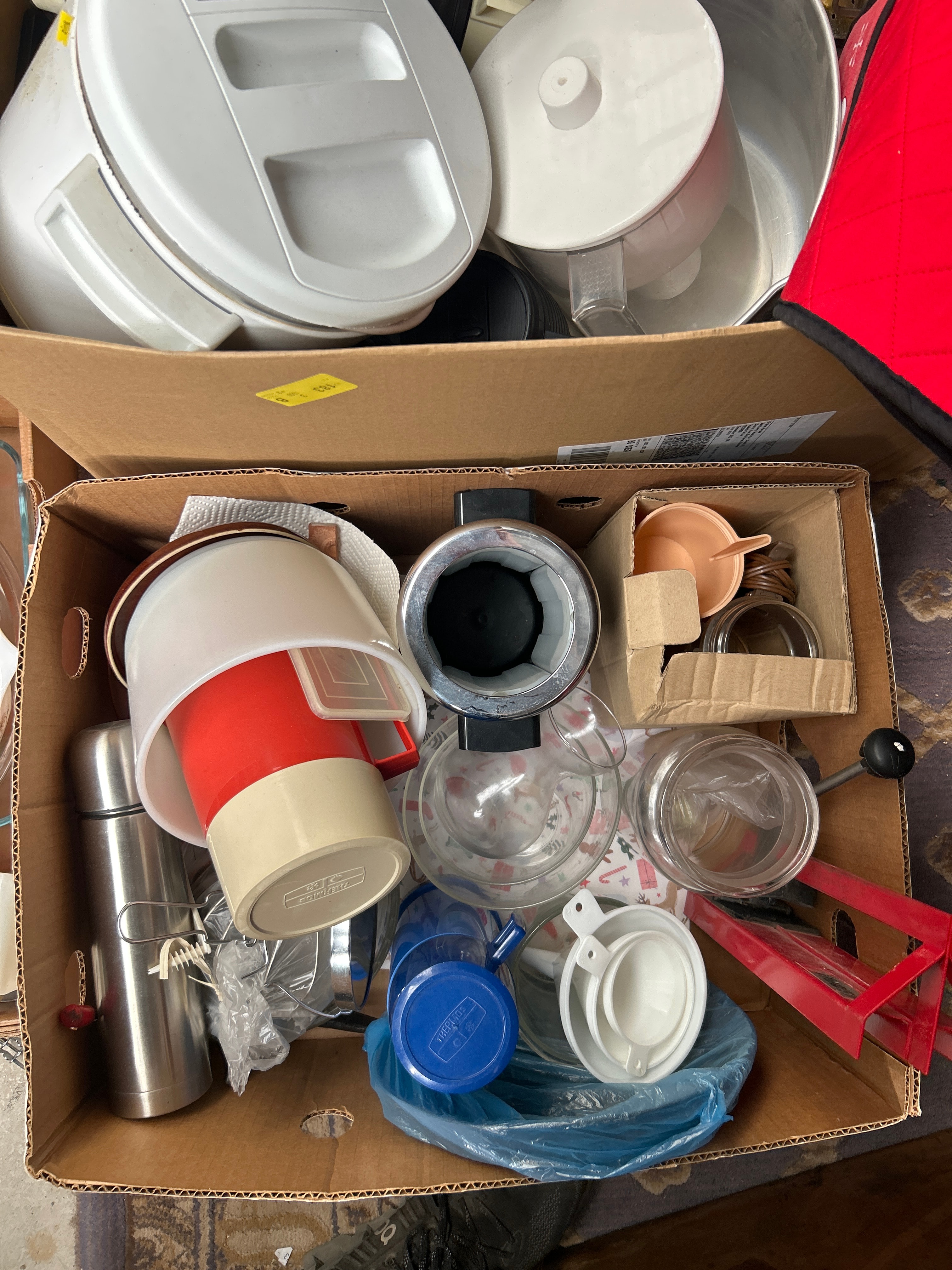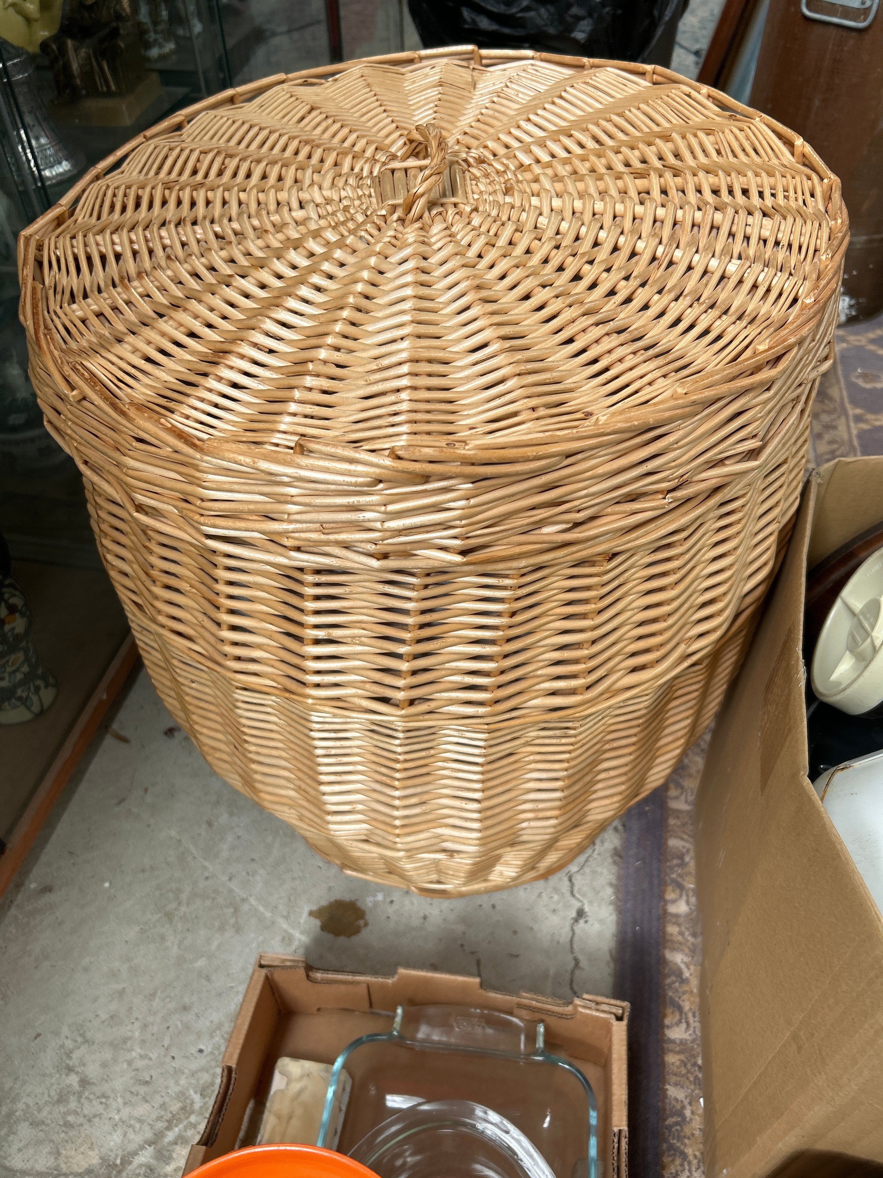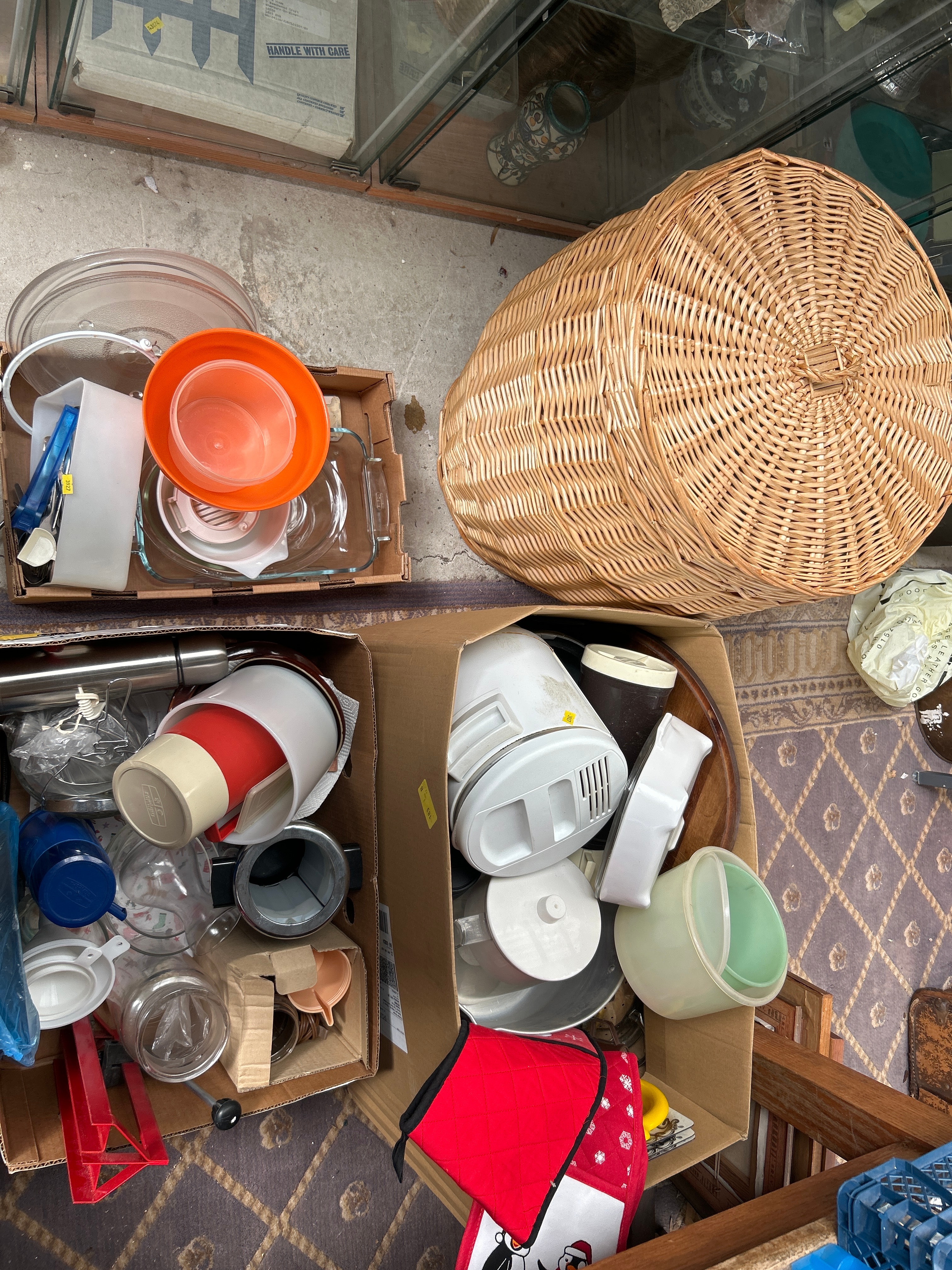 This lot comprises a diverse collection of domestic kitchenware and a large lidded wicker storage basket. The kitchen items, housed in three open cardboard boxes, are primarily utilitarian, encompassing clear glass bakeware, pitchers, and jars; an assortment of colored and white plastic utensils, funnels, measuring cups, bowls, and appliance components (likely food processor or mixer parts); stainless steel and plastic thermoses; a metal colander; a wooden cutting board; and a quilted fabric oven mitt. The prominent, round storage basket is crafted from natural woven wicker. While specific manufacturer’s marks are not clearly visible, the collection’s mixed style suggests a period spanning from mid-20th century to contemporary.