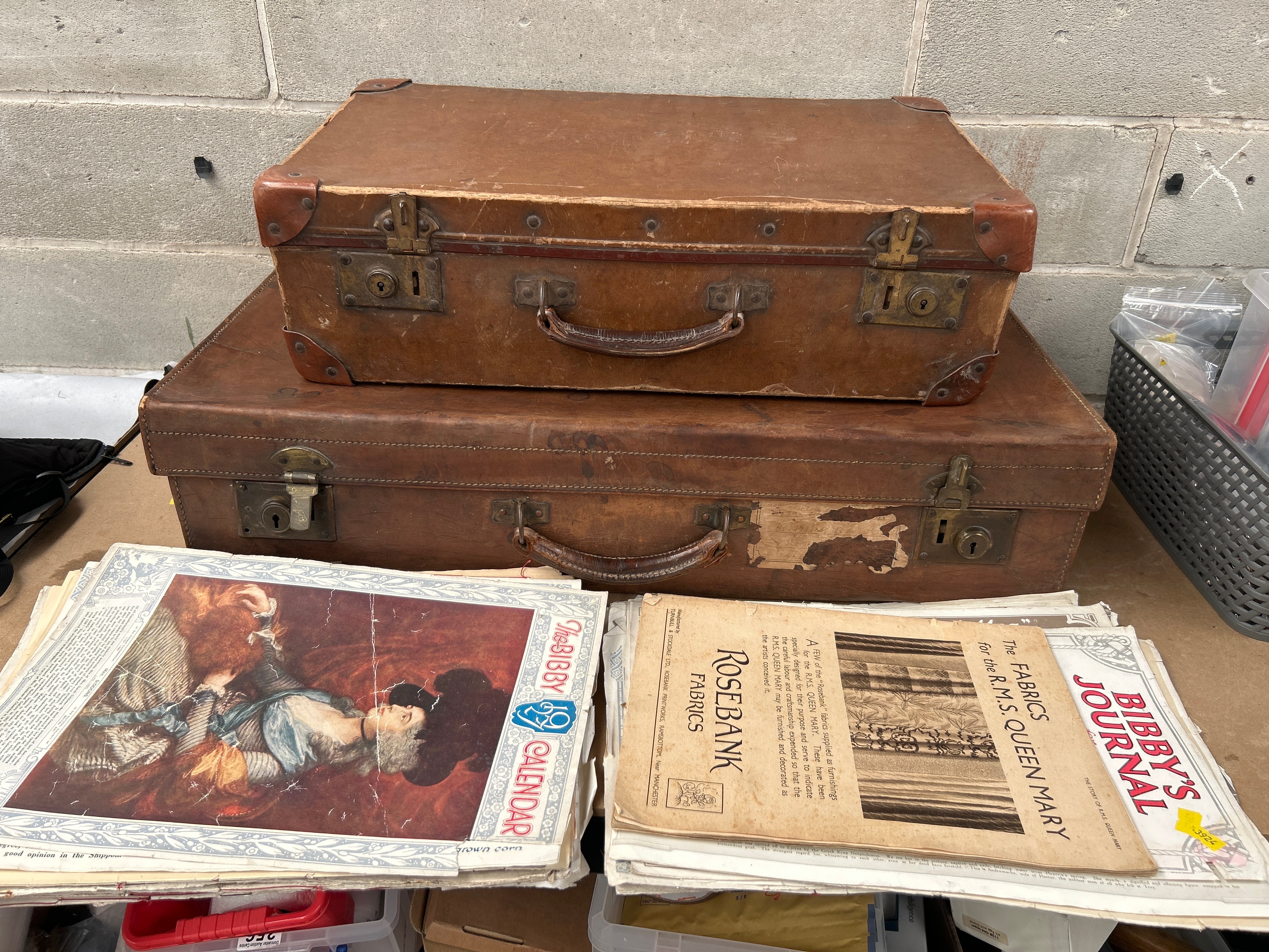 A pair of vintage brown leather or leatherette suitcases, likely dating to the 1930s. Each features metal hardware and leather handles. They exhibit significant surface wear, scratches, scuffs, and discolouration consistent with extensive use and age. One suitcase shows remnants of a large, torn paper label. Accompanying the suitcases is a collection of paper periodicals, including “The BIBBY CALENDAR 1929” and “BIBBY’S JOURNAL.” Also present is a pamphlet titled “THE FABRICS for the R.M.S. QUEEN MARY” by “ROSEBANK FABRICS,” noting “ROSEBANK PRINTWORKS RAMSBOTTOM, NEAR MANCHESTER.” These paper items suggest a collection spanning from the late 1920s to the mid-1930s.